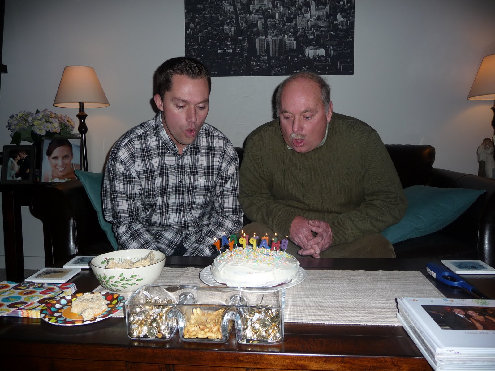 This year for Chris and his dad's birthdays I decided to arrange a little party/get together for the Flinn family. Originally we were supposed to do it on Tuesday the 28th, but then the big Flinn cousins party was scheduled for that night, so we moved it to Sunday the 26th. The snow almost cancelled it, but fortunately we were able to still have it... just earlier in the day and just with Chris' parents (Justin couldn't come down with the snow). I would love to do an actual dinner party at the apartment, but we just don't have the room (or a real dining table), so instead I did appetizer type stuff, then we headed over to a restaurant across the street, then came back for gifts and cake. It turned out to be a lot of fun though very different from the original plans. Fortunately his parents were able to leave our apartment before the snow got too heavy :)