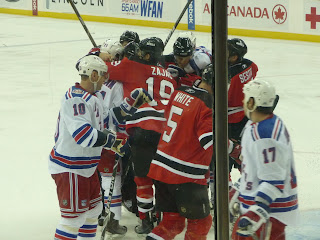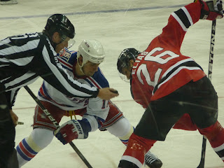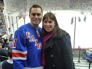 For Chris' birthday (yes it does really stink to have to think of two gifts for him within 5 days of each other!) I got him tickets to see the Rangers play the Devils in Newark. We once again decided to drive, since we found out there was no direct train to Newark Penn Station from Morristown. The drive was easy though and we got to park 2 minutes from the arena... so we were thrilled with our decision. The seats were decent, but when we had a tall guy sitting in front of us that leaned forward making it impossible to see any action in the middle of the ice, we were very glad that we could move our seats up. One of Chris' friends had 3rd row seats right behind the goalie. After the first period he said that there were some empty seats, so he was able to get us down there with his brothers' tickets. So for the next 2 periods we sat 6th row (and we were able to spot ourselves on TV the next day... can't prove it, but we know it was us!). There was a great fight at our goal, so that was super cool. I've never seen a hockey fight that close up and heard how loud they really hit the glass! The Rangers ended up winning 3-1... so it was a great night!