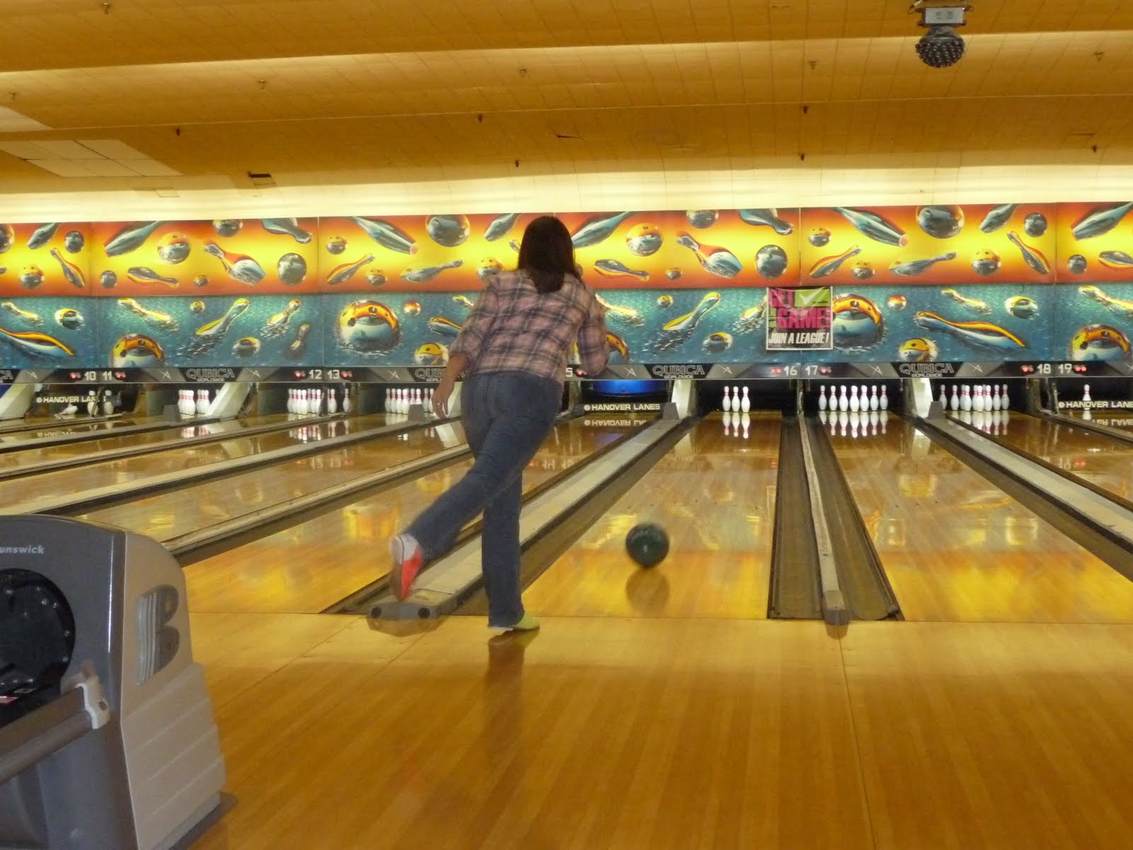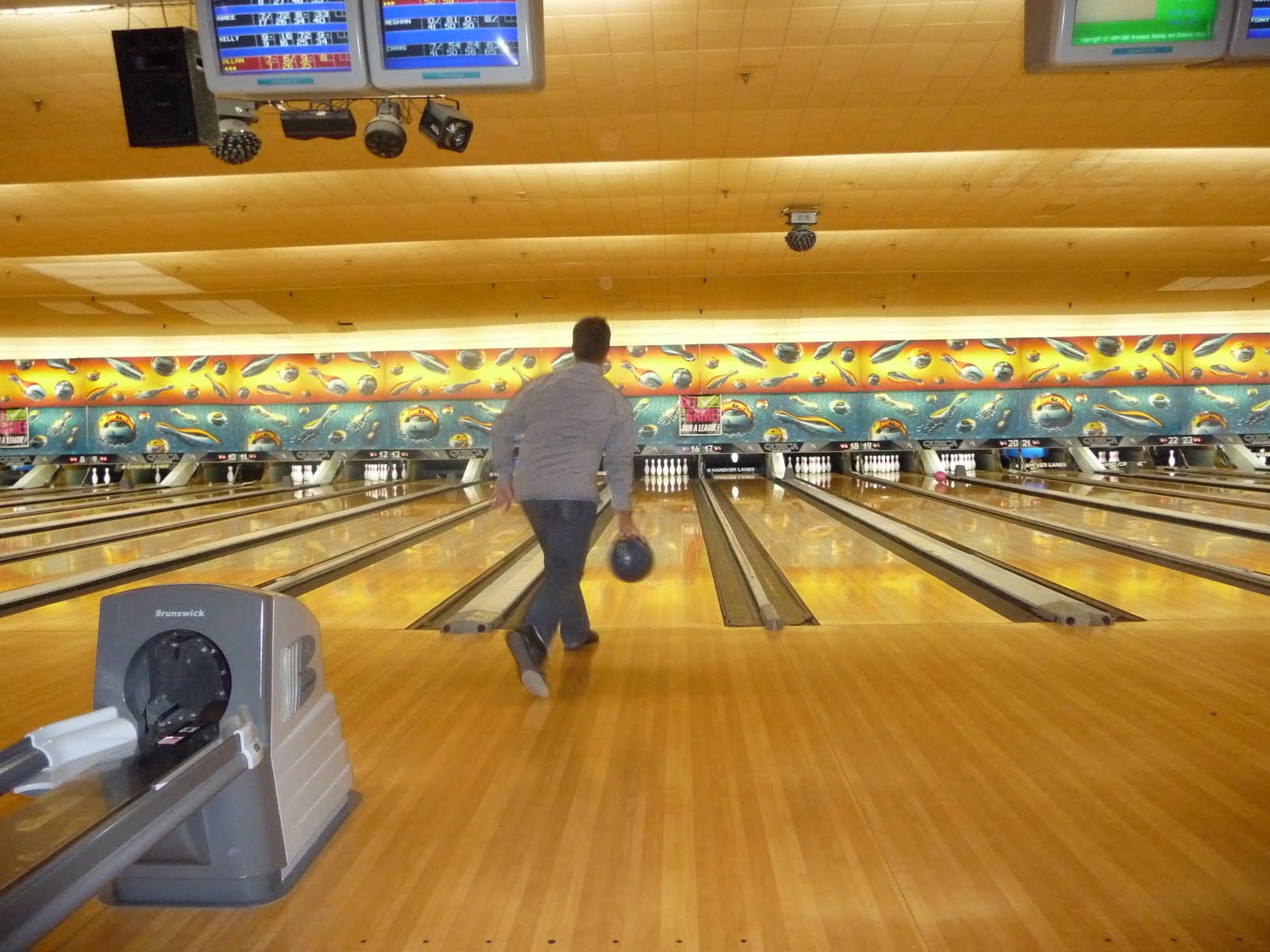 Saturday we took Kaitlyn to go candlepin bowling. We thought she might have some fun, but never knew how much of a hit it would be. We got 2 lanes for the group of us and after she rolled the first ball, we knew that she'd be bowling by herself, and the rest of us on the other lane. She seemed to simply like throwing the ball down the lane and really couldn't care less how many pins she knocked down. Often she would even throw the second ball down the lane before the first ball knocked down any pins... it was like speed bowling! I can't believe how big she's getting and that we can finally take her to do a bunch of fun things when we come to visit now :)