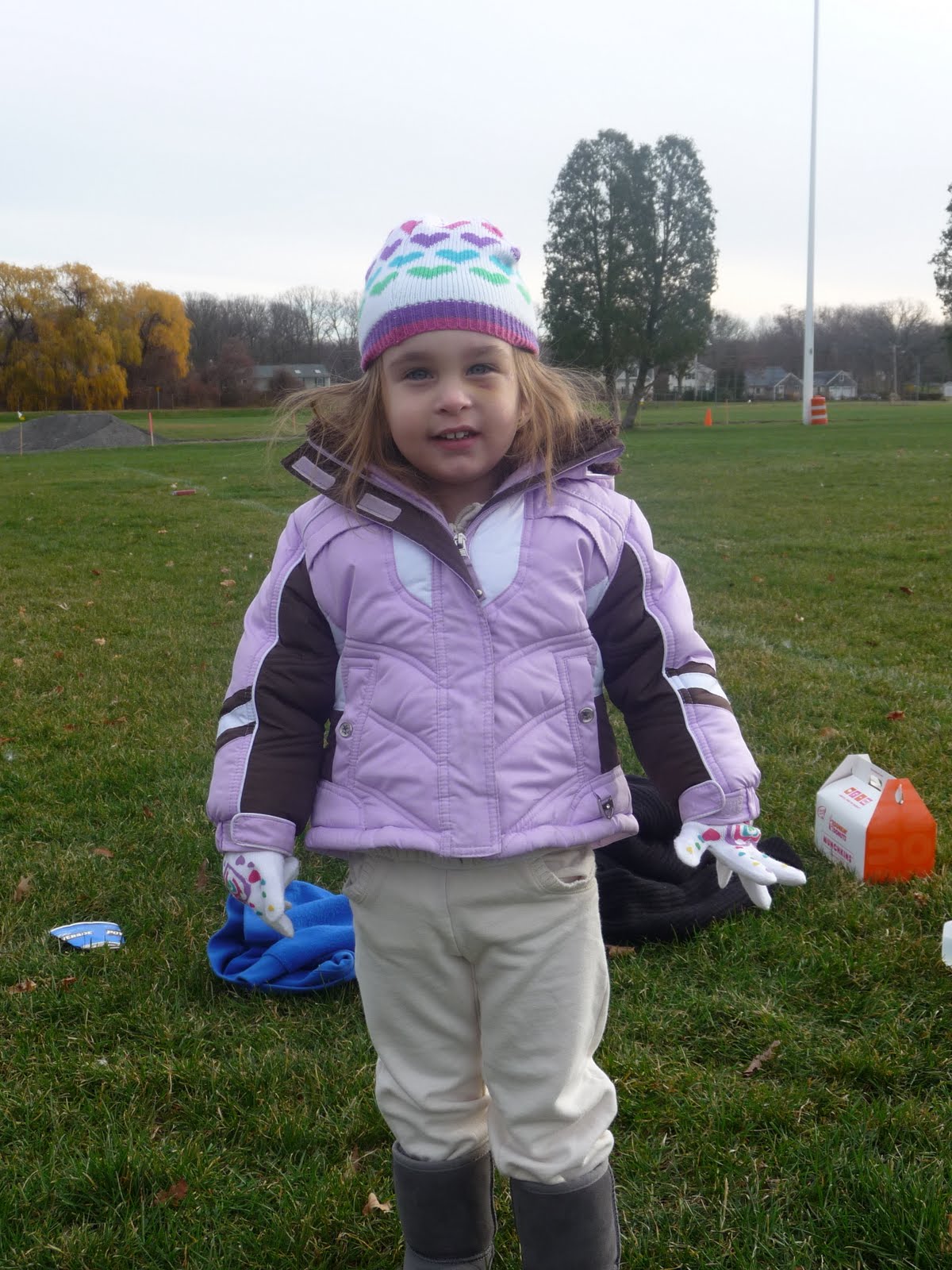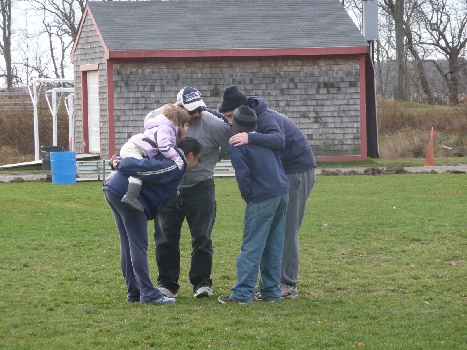 Once again my parents, Chris, and I headed up to Rhode Island. We went this past weekend for Thanksgiving and had a blast! Thursday morning David held a game of flag football. Chris also played, and I took Kaitlyn to watch and cheer them on. It was pretty cold out, so we bundled up. Kaitlyn even got out on the field and "played" a little. She really liked being part of the huddle :)