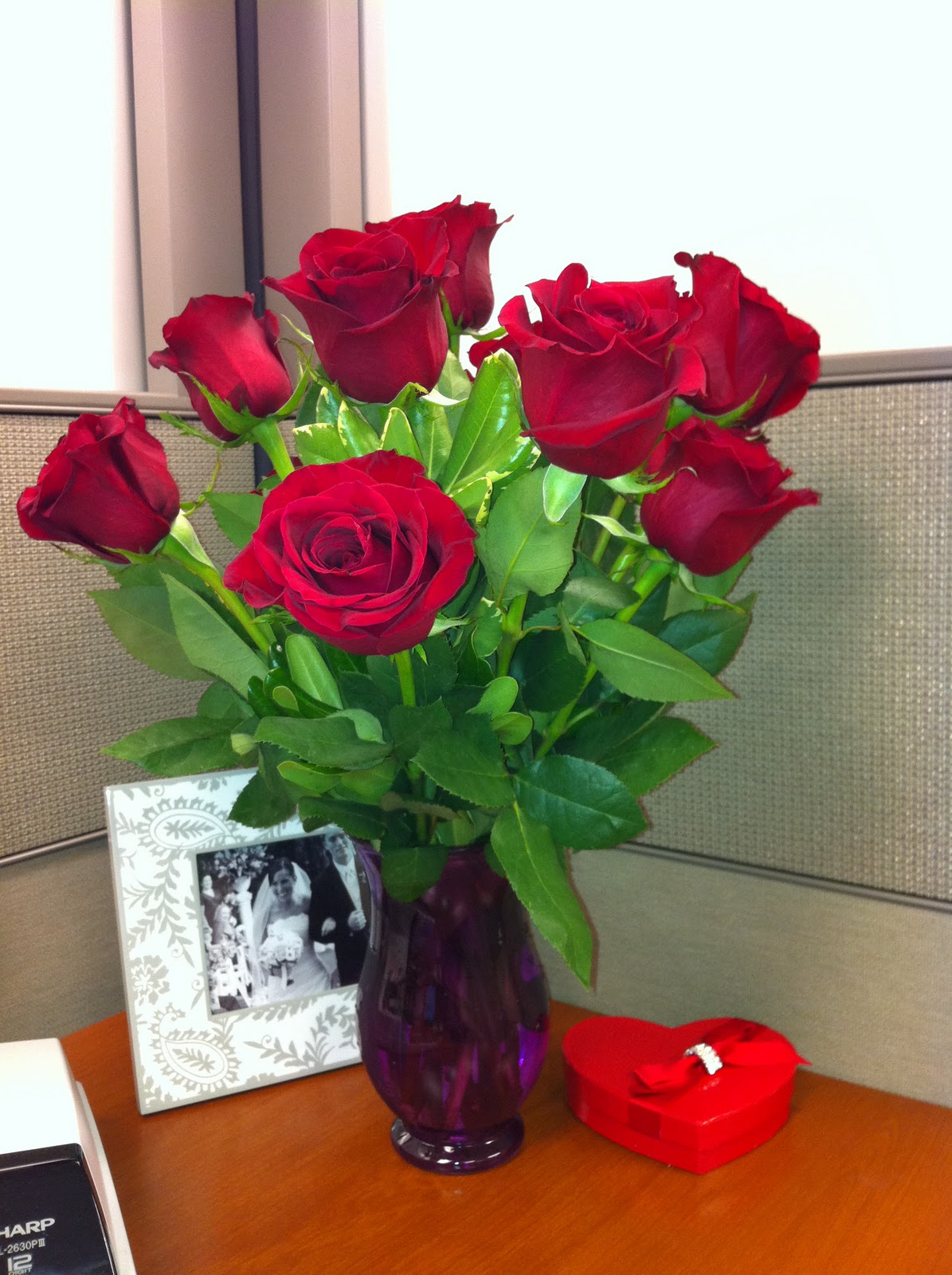 On Monday (actual Valentine's Day), Chris surprised me with some chocolates from Enjou. They were hiding behind the couch pillow waiting for me to find them when I ate breakfast :) Enjou was where he got me chocolate on my birthday when we were dating and also where we got our Wedding Favors. Later that day Chris sent me these gorgeous red roses and some more chocolates to my work.