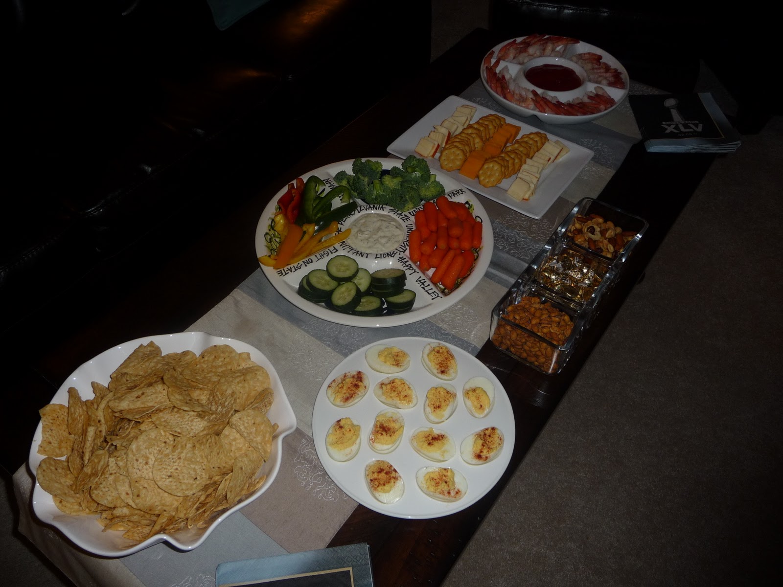 For Super Bowl Chris and I invited some of our neighbors over to watch the game and eat some yummy food. I put out the usual spread... Veggie Tray and Cheese & Crackers as well as adding some new favorites. We had deviled eggs (with the help of my mom), shrimp, some chips and dip, pizza rolls, and some chicken poppers. Our neighbors brought over turkey meatballs and a buffalo chicken dip. The food was all so amazing that even after I was full, I just kept eating. That night (and the next morning when I was still full) I wished that I hadn't eaten so much.