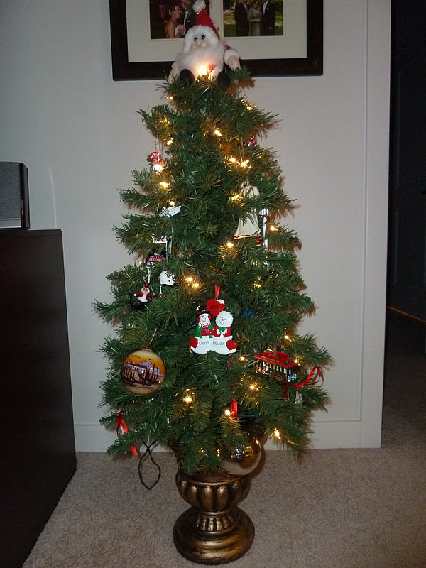 We said goodbye to the kids Saturday afternoon and headed back to Morristown. I can't wait to see them all again at Christmas. I already told Kaitlyn that when she come back we will make Christmas Cookies for Santa. When we got home Chris and I decided to start decorating our own place for Christmas. Since our apartment isn't huge we only put up a small tree, but it still makes me feel like Christmas. I can't wait til we have a bigger place that I can really decorate... I think Chris is a little nervous at how much I will decorate when we have more space!