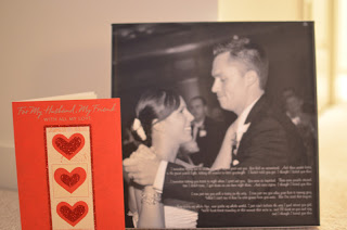 When we got home from work we exchanged gifts... I had a photo canvas made with a wedding picture of our first dance with the lyrics to the song, "Then" by Brad Paisley. I can't wait to hang it up.