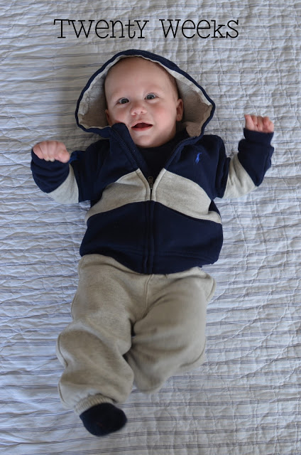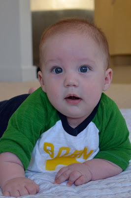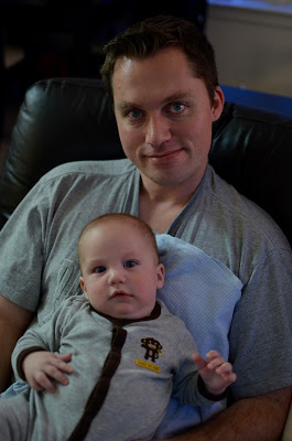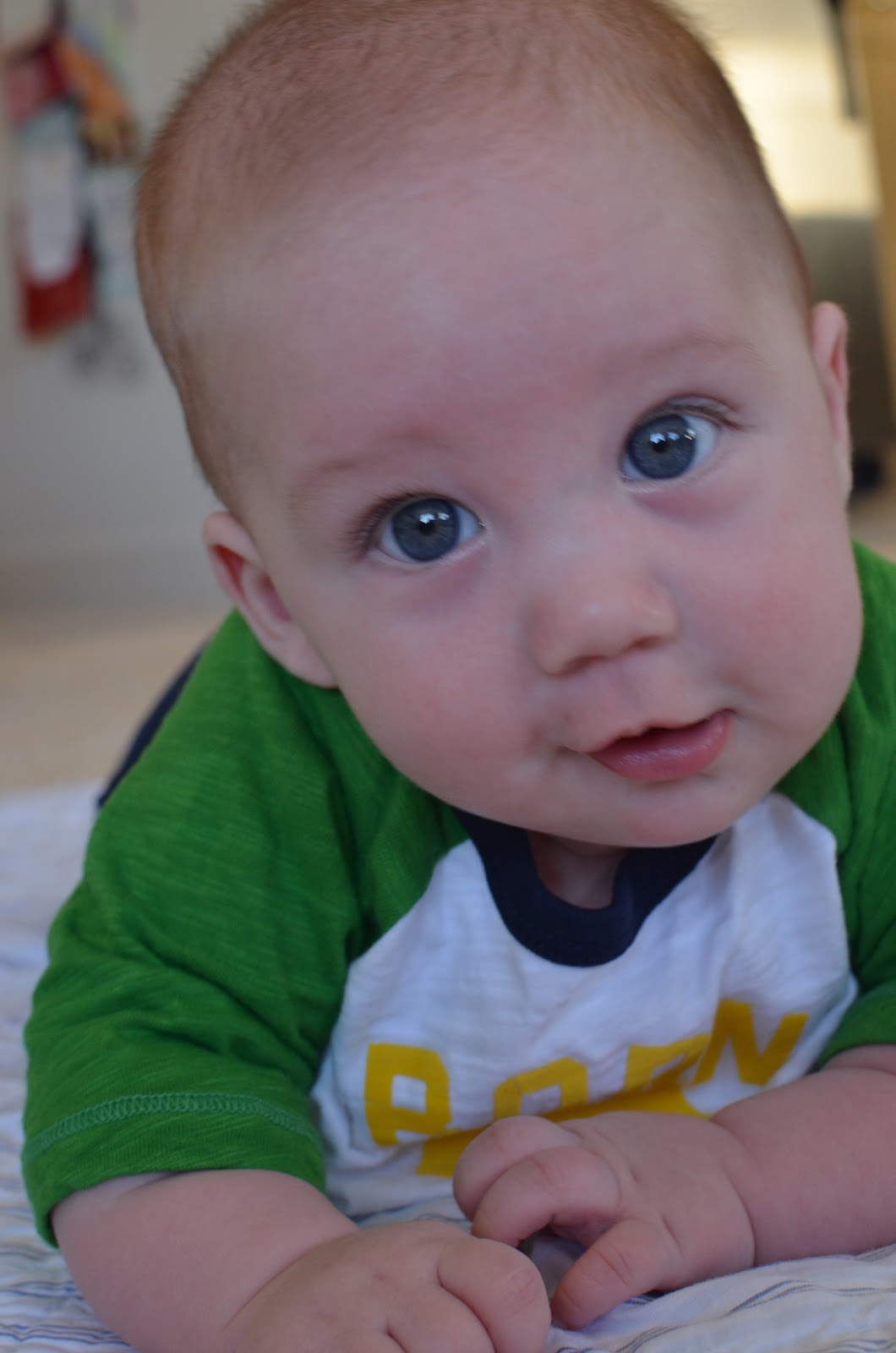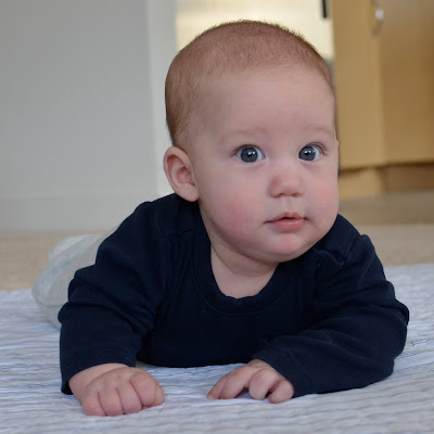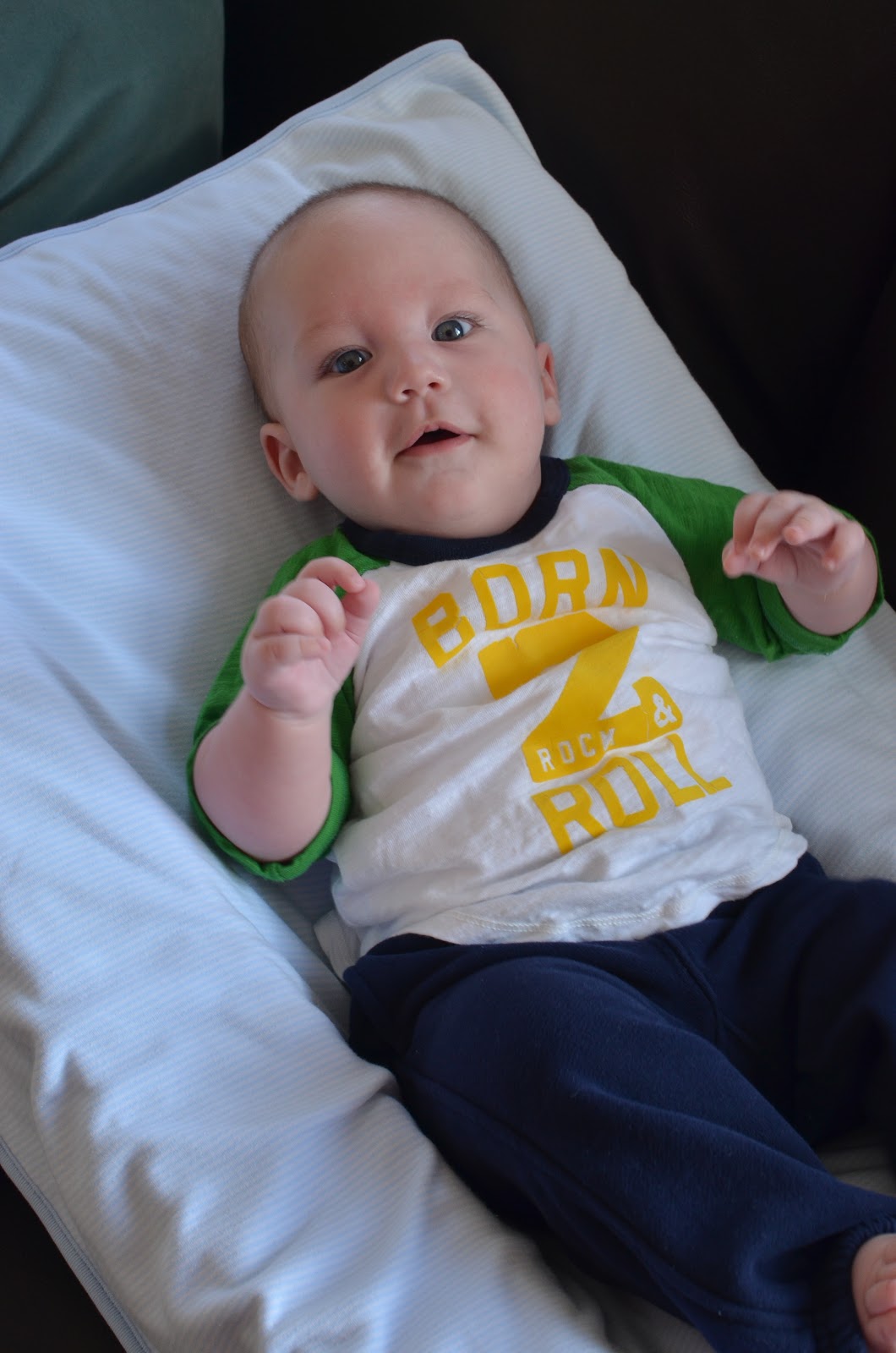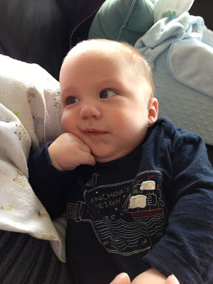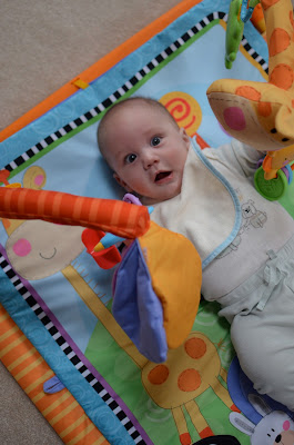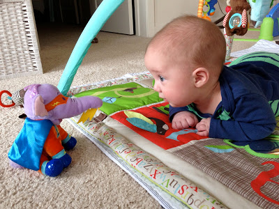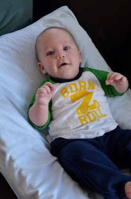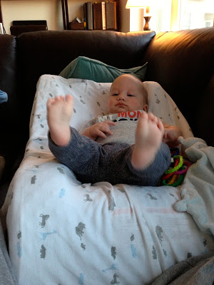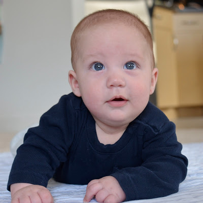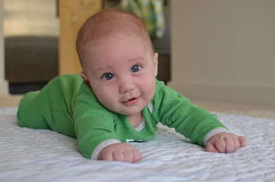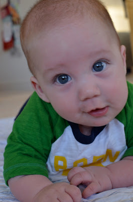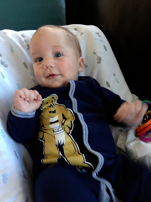 Likes: Noah now loves sitting up (with our help obviously). He also loves playing with his rings, football, and putting anything he can in his mouth. I've also found a spot on his cheek where if I make loud kissy noises on him, he starts to smile big and almost giggle. I can't wait to hear a full laugh from him.