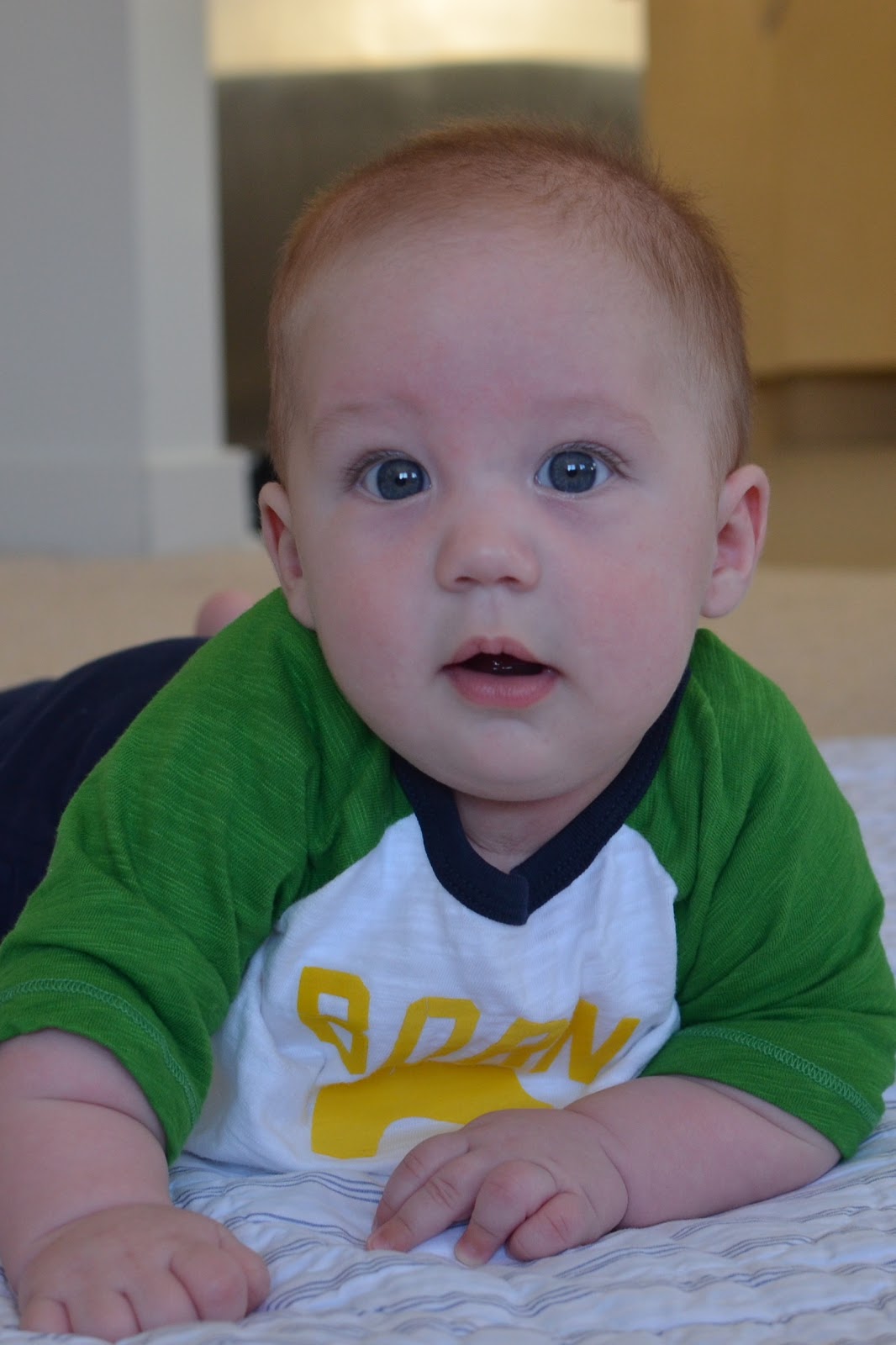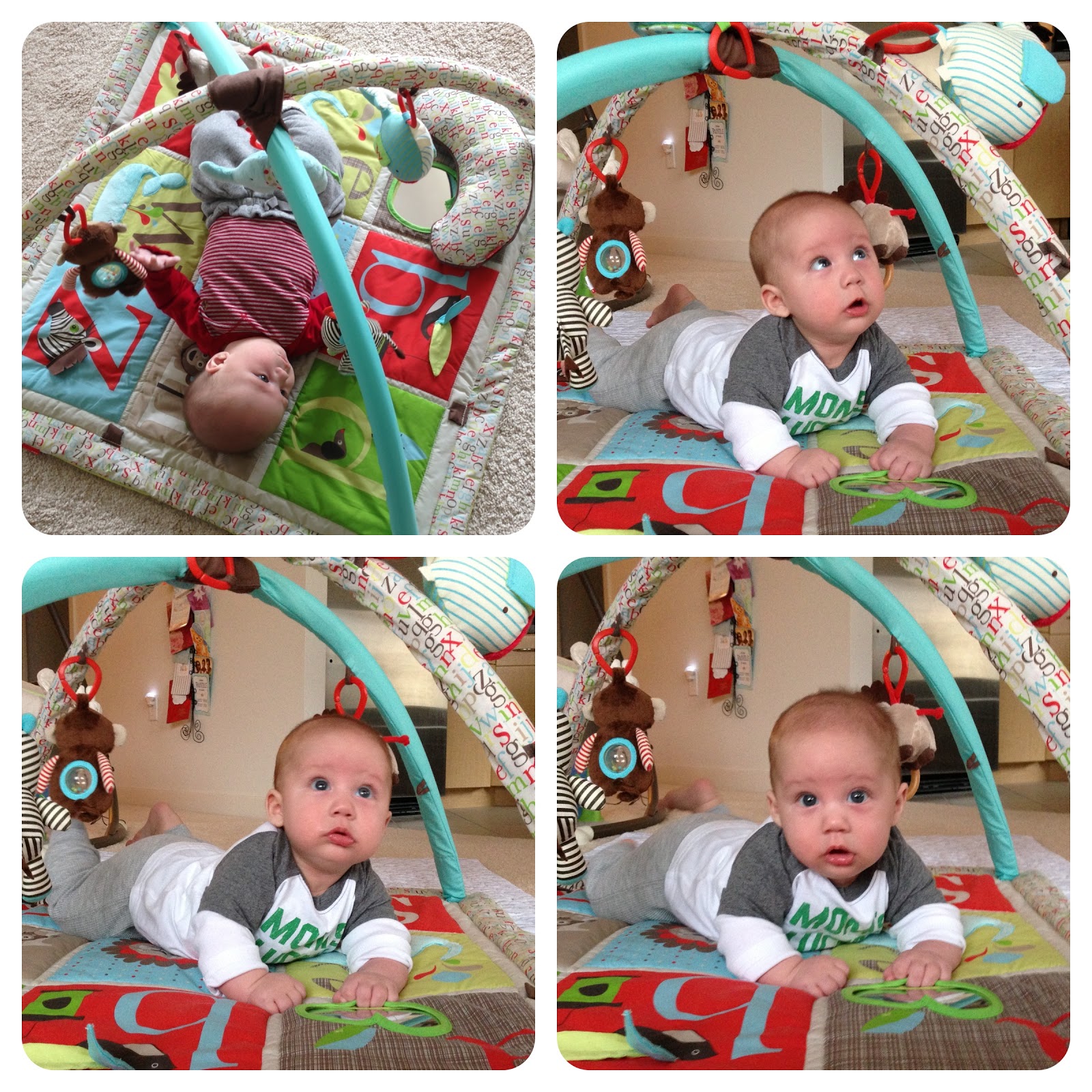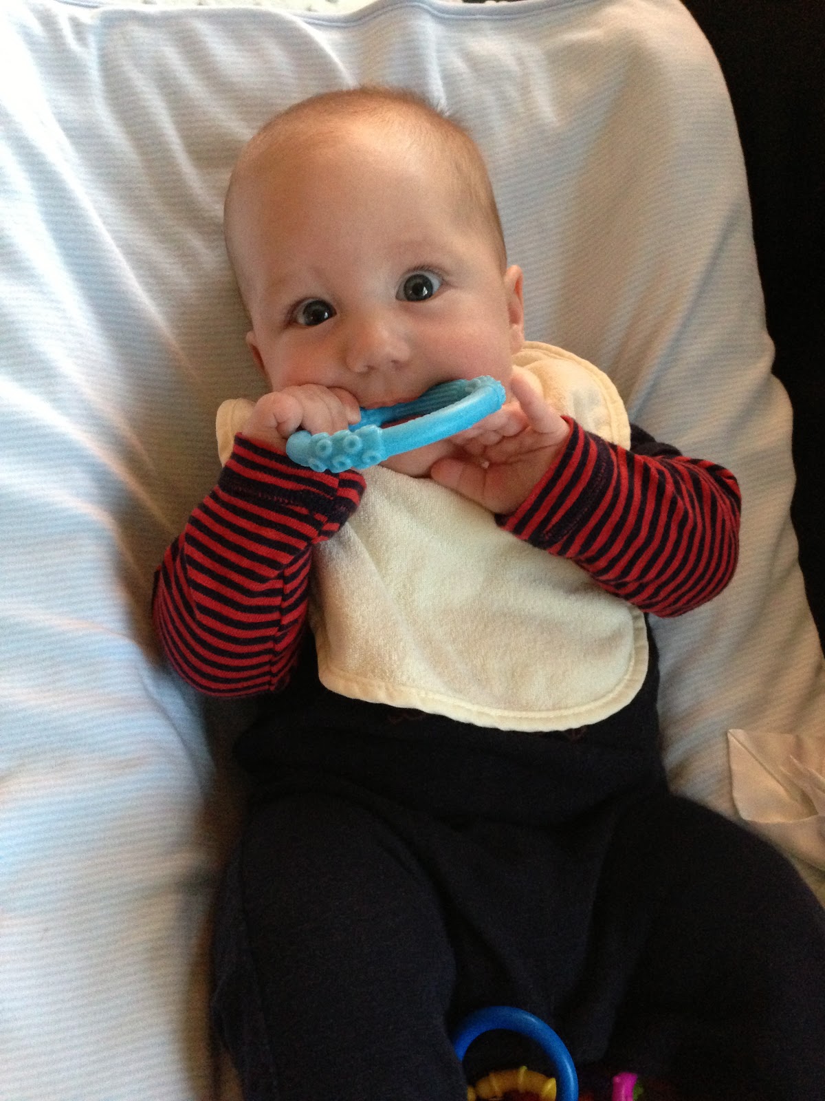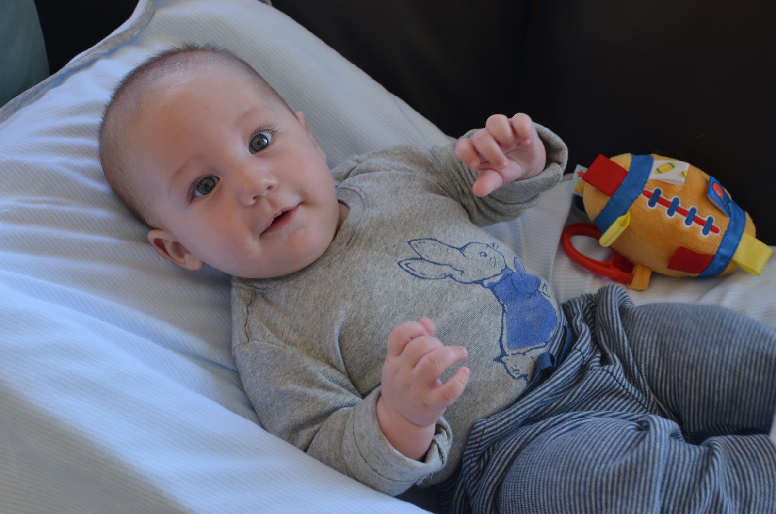 Likes: Noah now loves sitting up (with our help obviously). He also loves playing with his rings, football, and putting anything he can in his mouth. I've also found a spot on his cheek where if I make loud kissy noises on him, he starts to smile big and almost giggle. I can't wait to hear a full laugh from him.