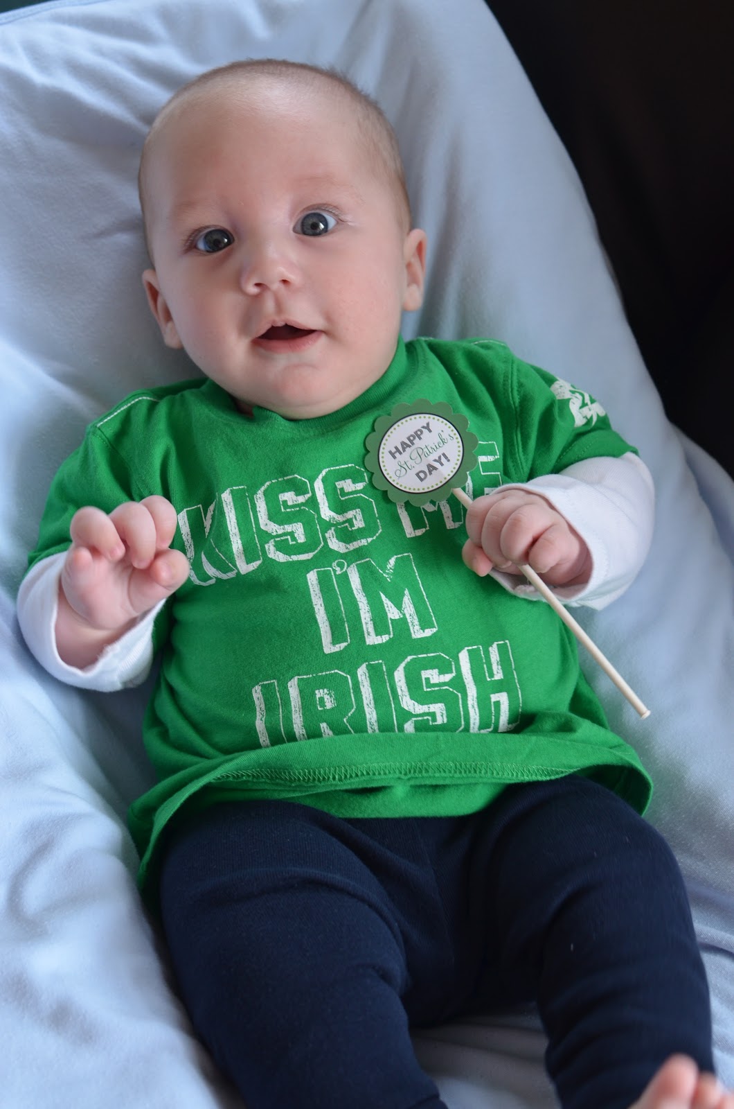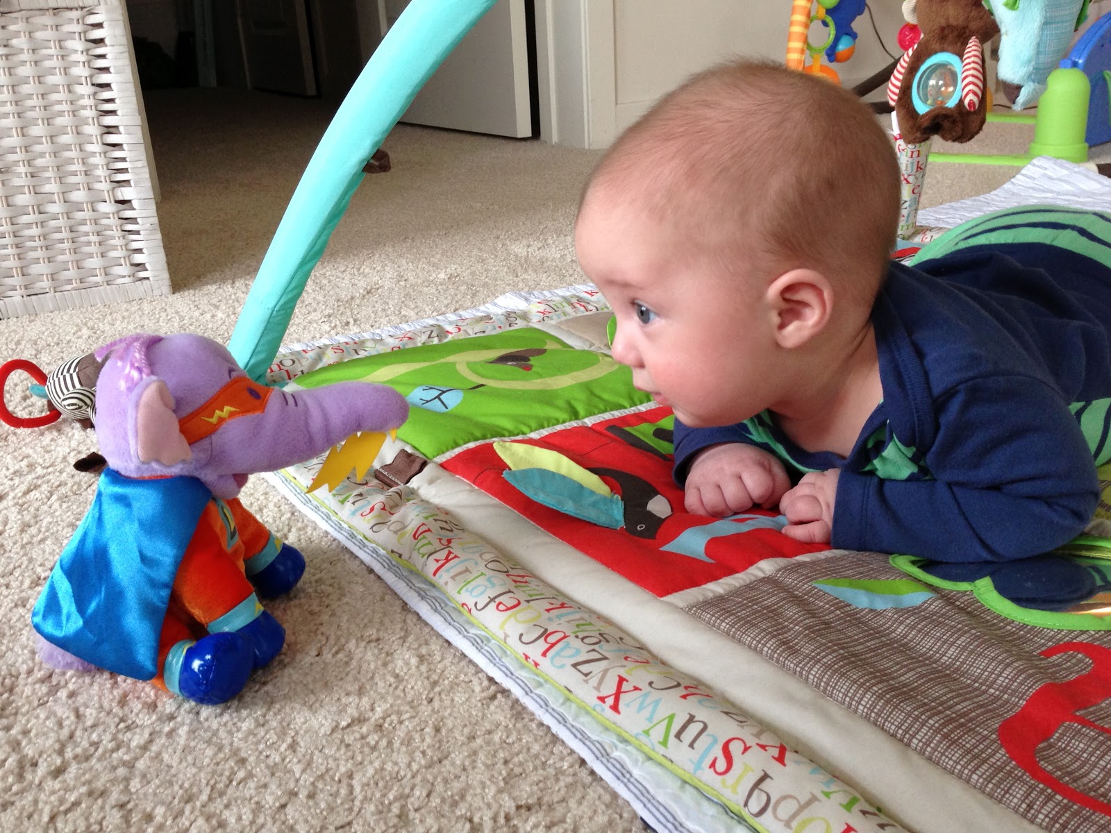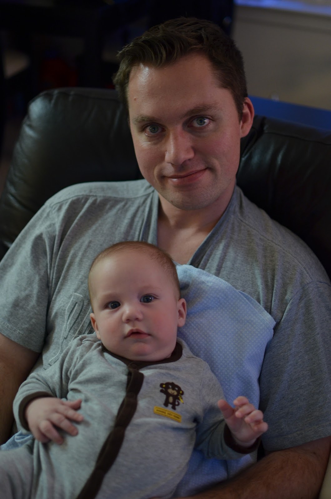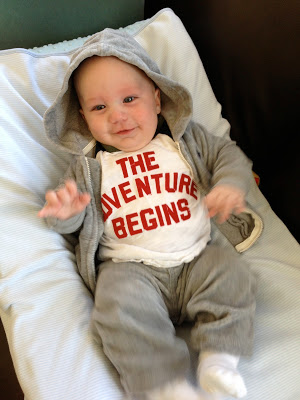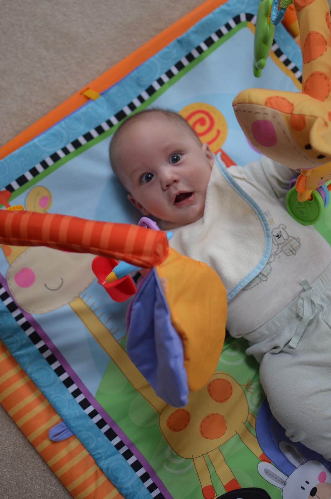 Likes: Noah now loves sitting up (with our help obviously). He also loves playing with his rings, football, and putting anything he can in his mouth. I've also found a spot on his cheek where if I make loud kissy noises on him, he starts to smile big and almost giggle. I can't wait to hear a full laugh from him.