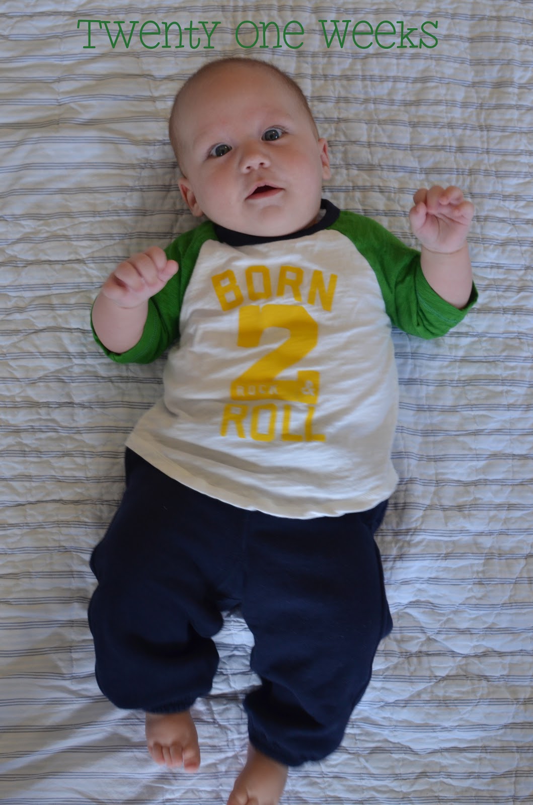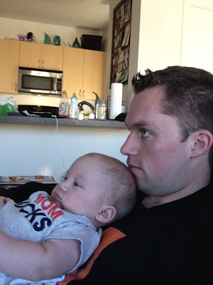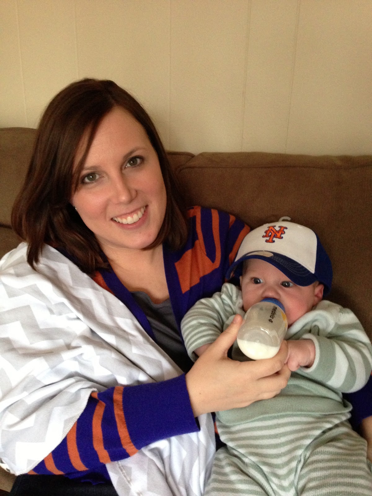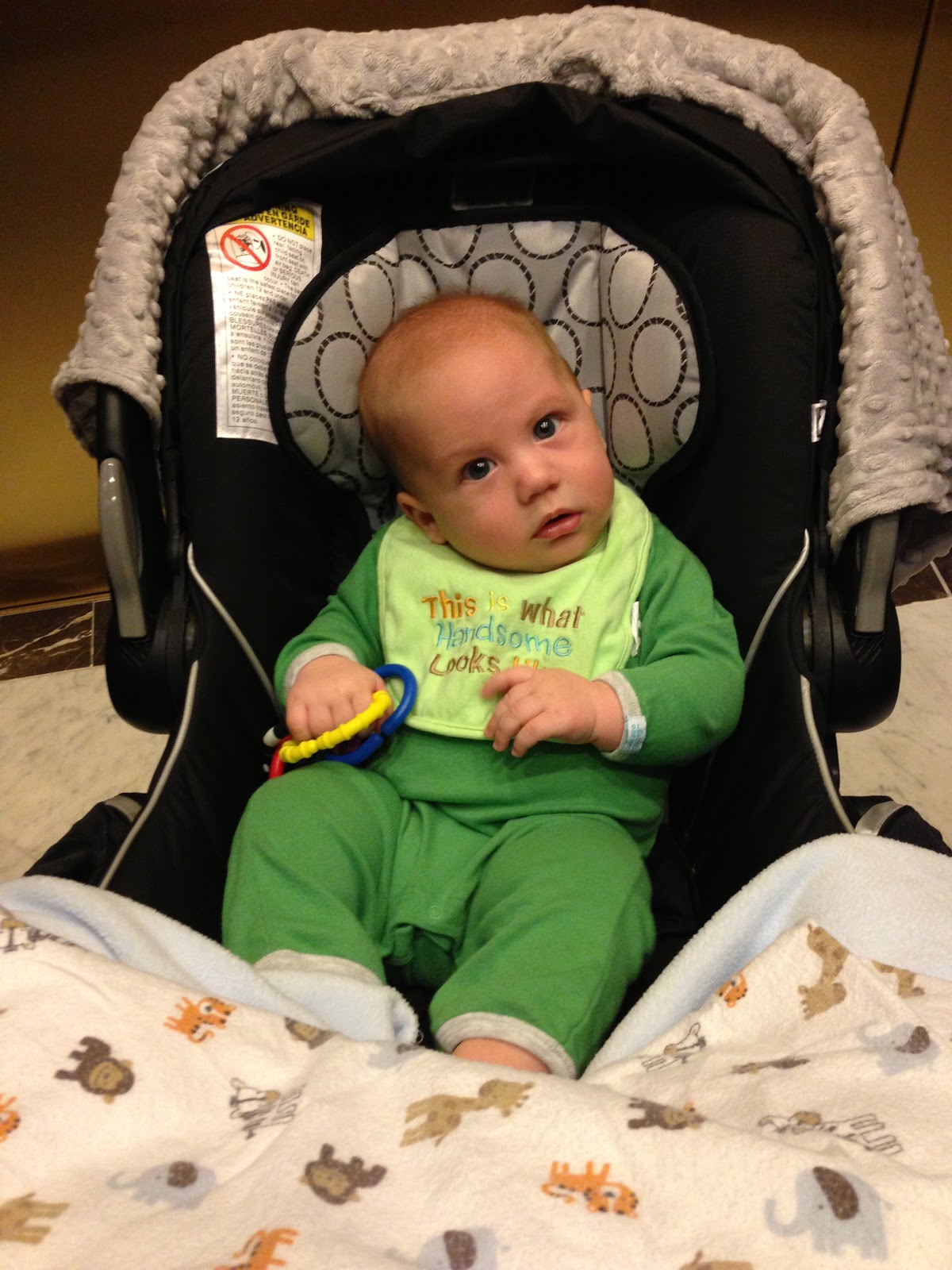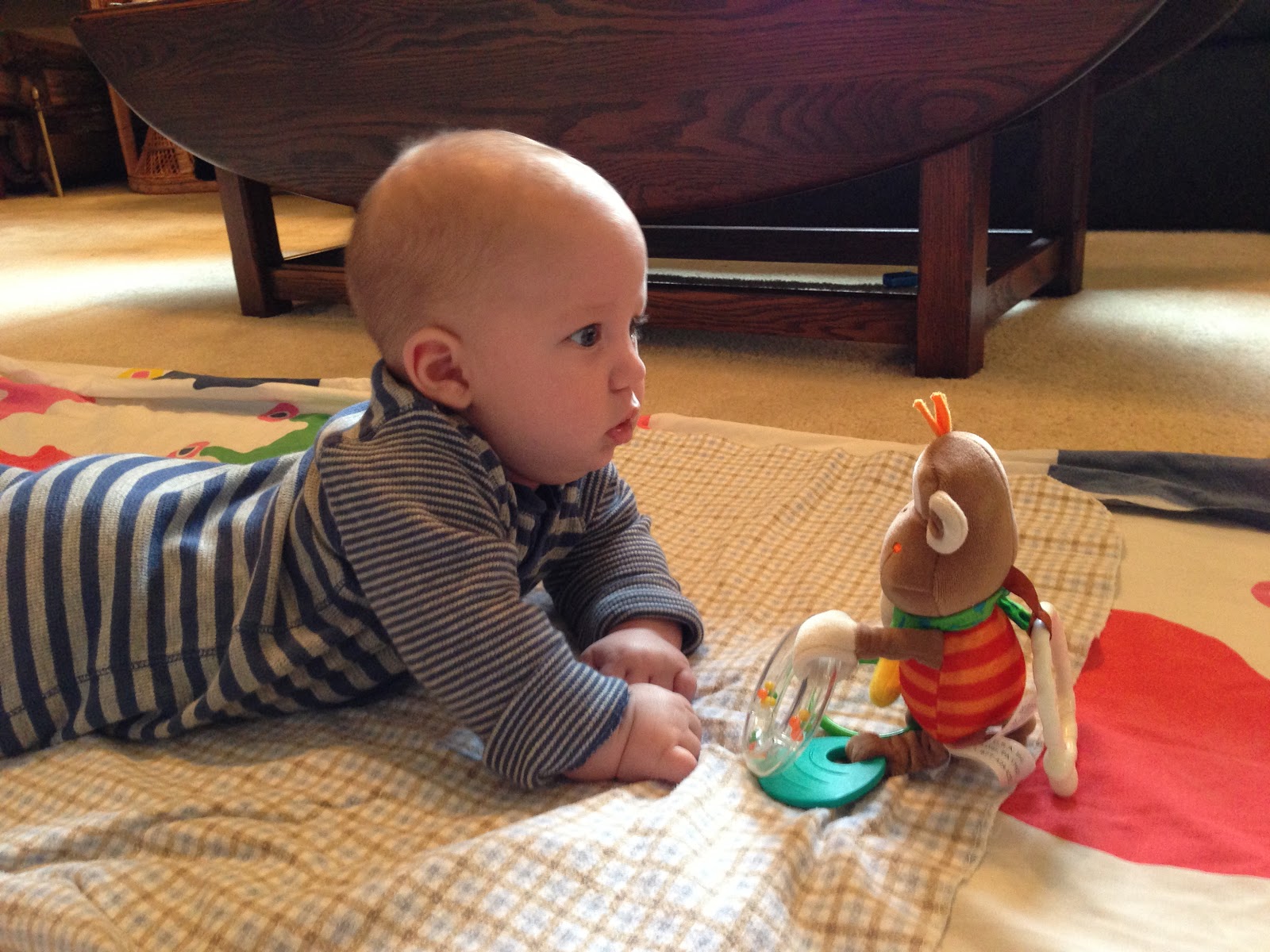 Likes: Noah now loves sitting up (with our help obviously). He also loves playing with his rings, football, and putting anything he can in his mouth. I've also found a spot on his cheek where if I make loud kissy noises on him, he starts to smile big and almost giggle. I can't wait to hear a full laugh from him.