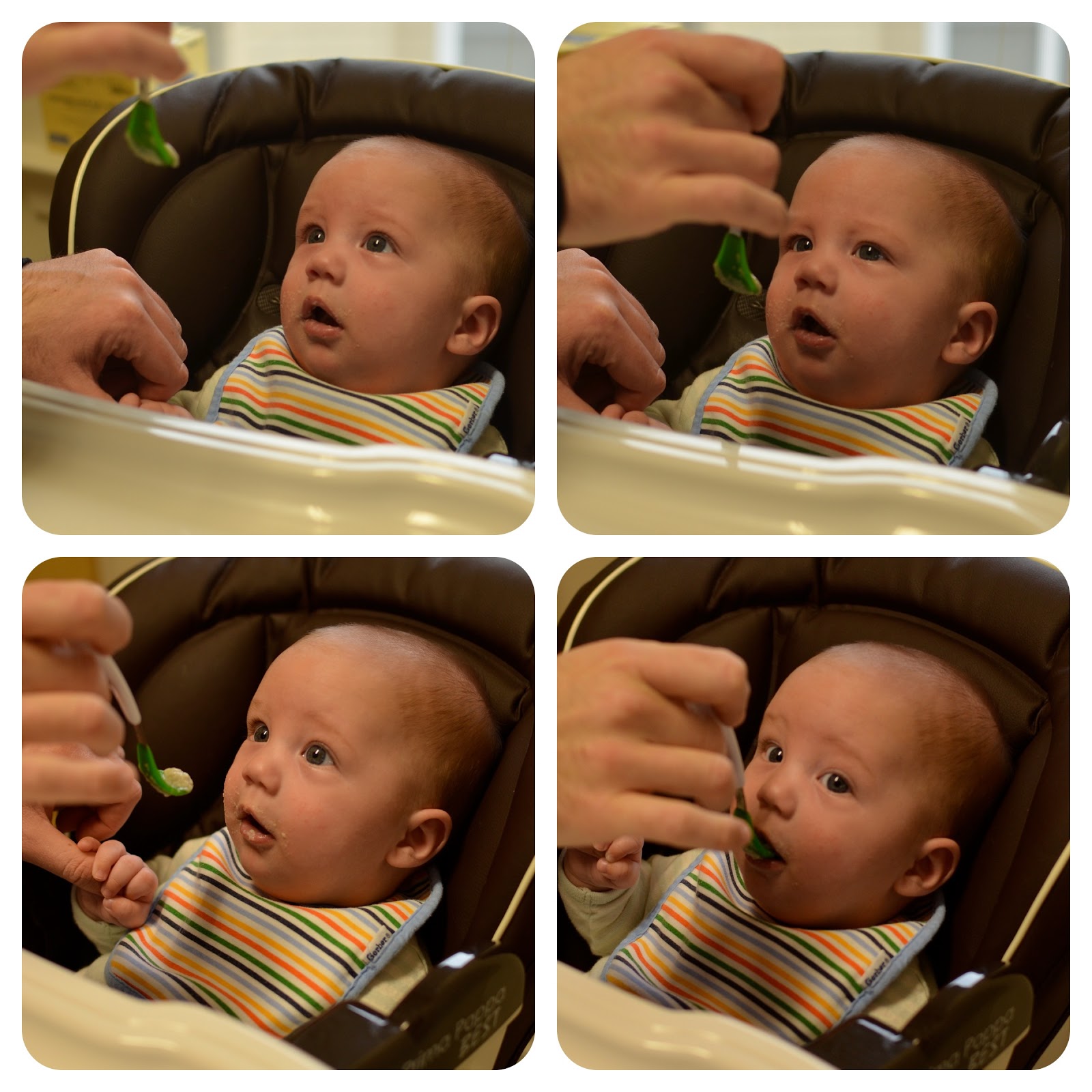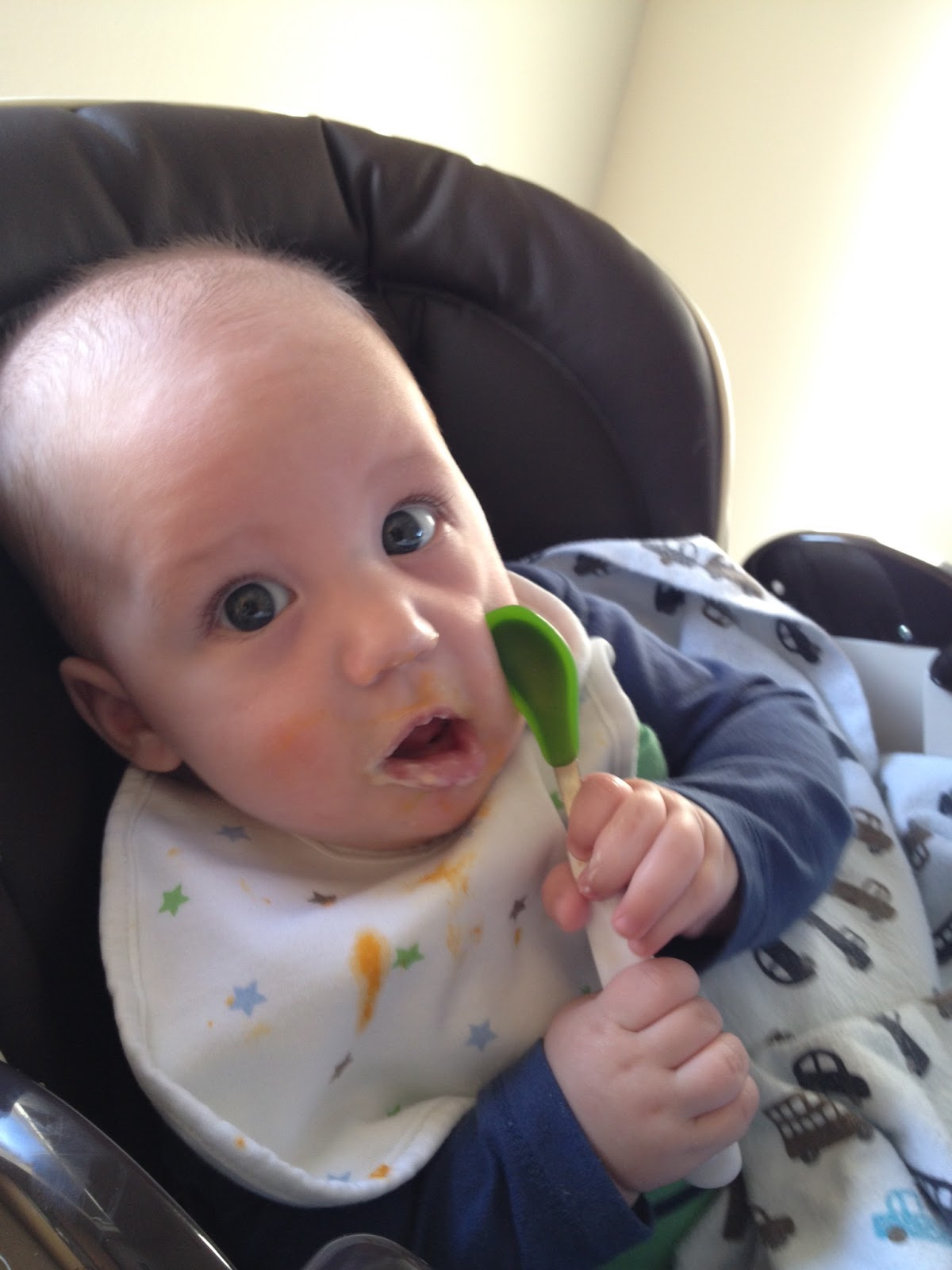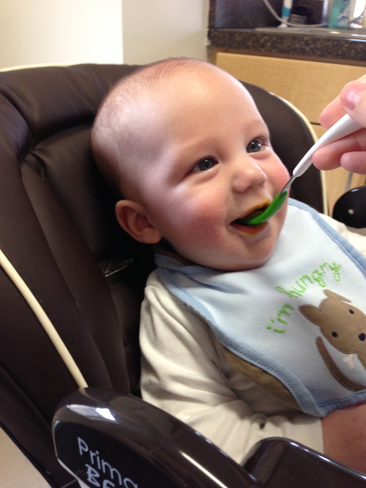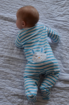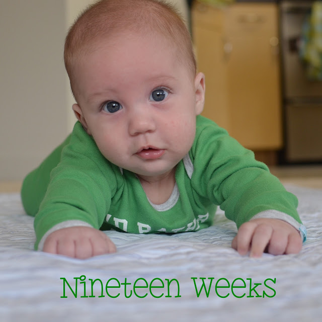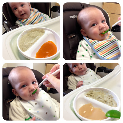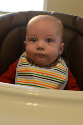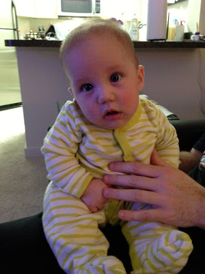 Diet: This week we kept giving Noah new fruits and vegetables. On Sunday, Noah tried squash. On Monday his cheeks were red, but I figured it was from rubbing his face into his burp cloth. He had squash again that afternoon, but then I noticed that he had a slight rash on his stomach. I called and left a message with the doctor. Tuesday morning they called me back and said I should bring him in, but by then the rash was gone. So instead they told me to just stop giving him the squash and to watch for any other symptoms. Thankfully, he hasn't had any more symptoms since.