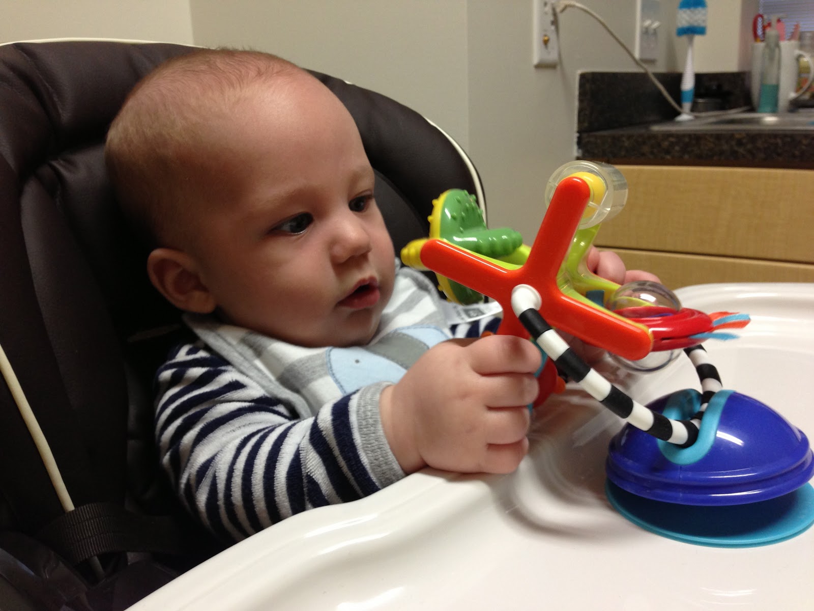 Noah played on his own while I enjoyed some Frosted Mini Wheats. At 8:30, while I prepared Noah's breakfast, he played with his new high chair toy. Today was the first time he grabbed it and spun it around. This morning he had Oatmeal and Peaches :)