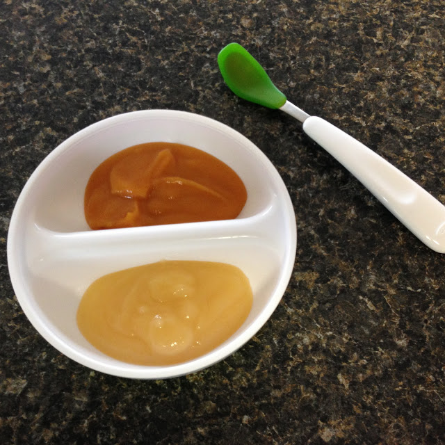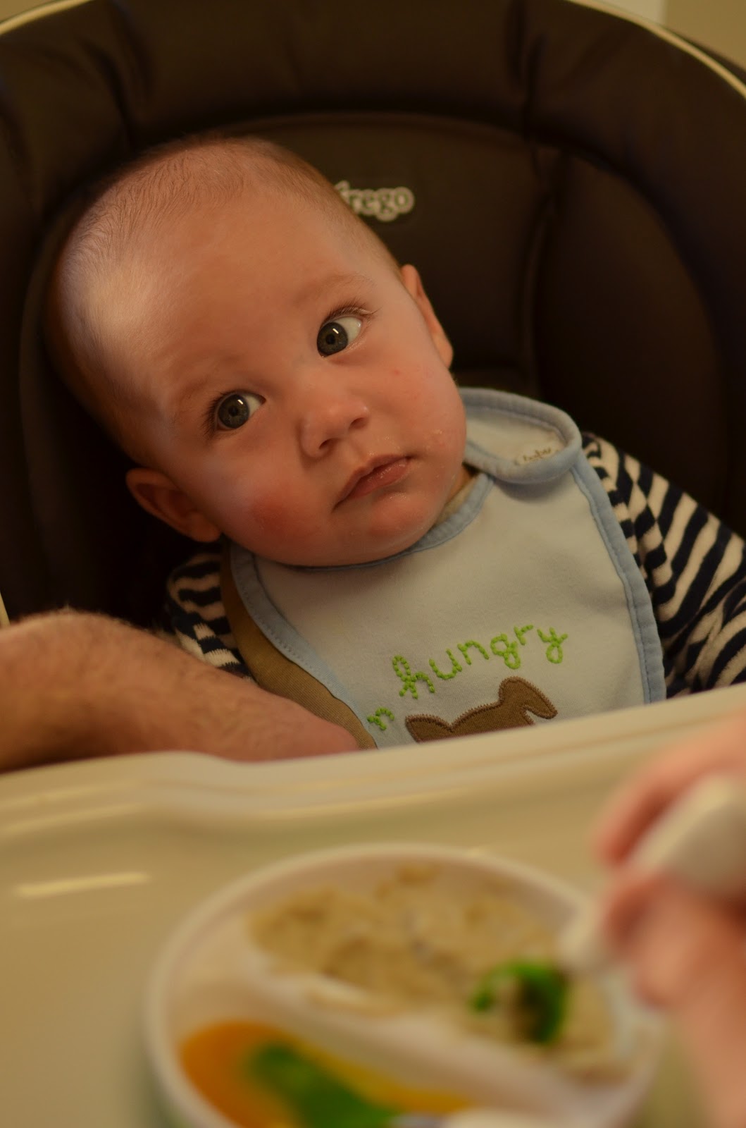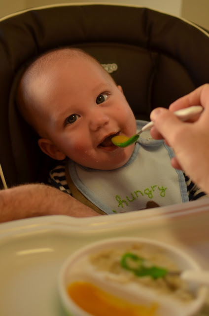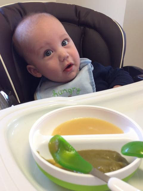 At 12:30 I fed Noah his yummy lunch of sweet potatoes and pears. He loves his lunches and gobbles his fruits and veggies down so quickly!