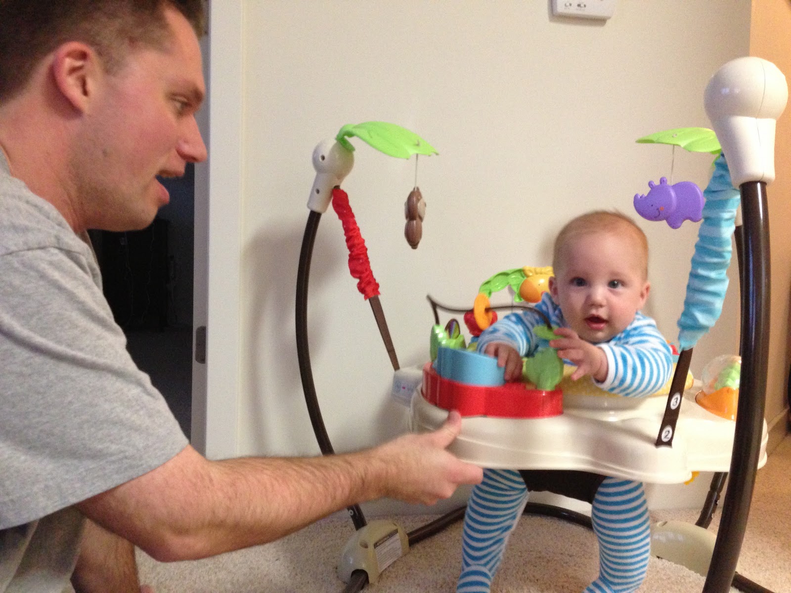 Noah was happy and full, so he sat in his chair while we ate dinner. After dinner, Chris played with Noah in his jumperoo.