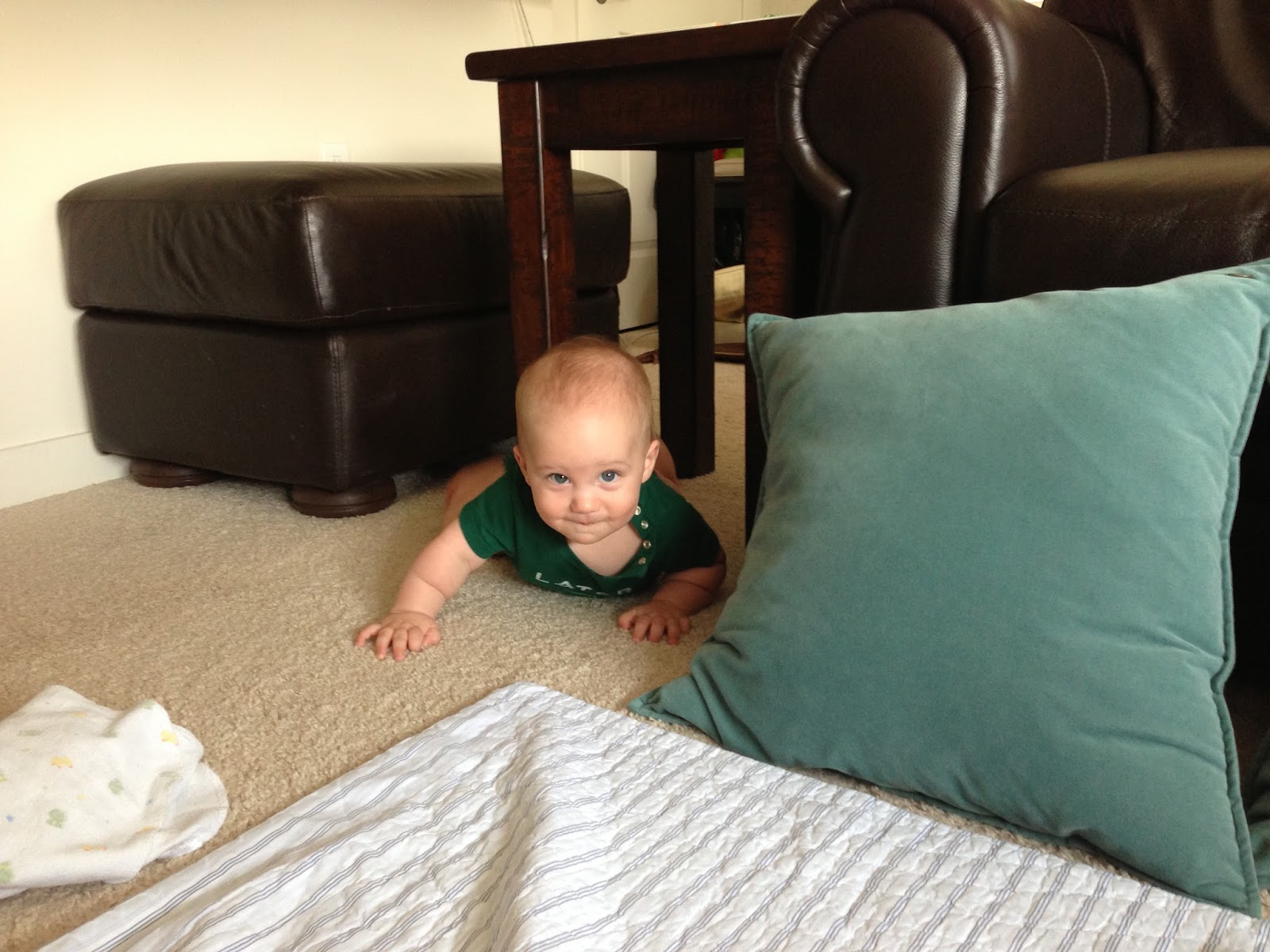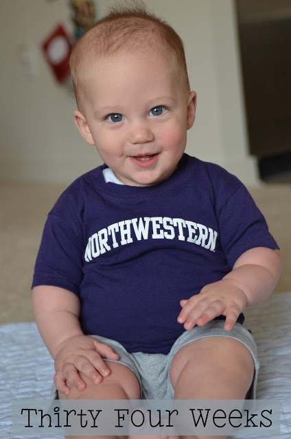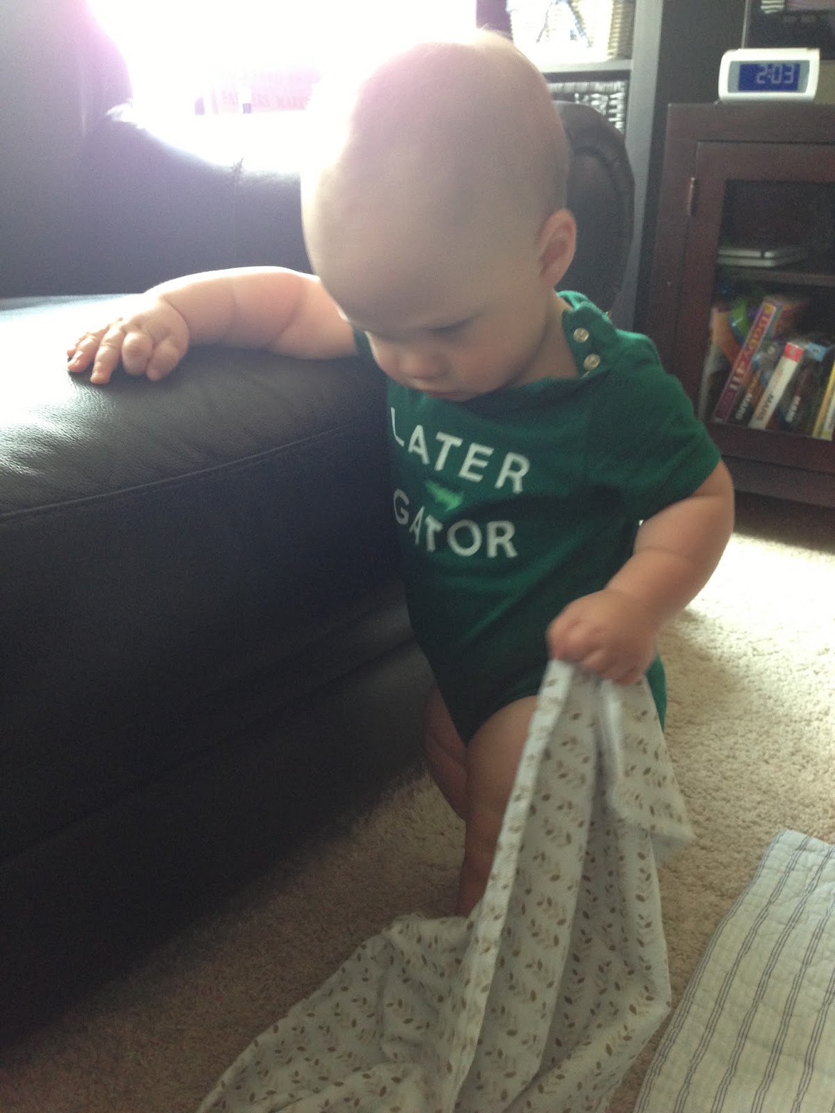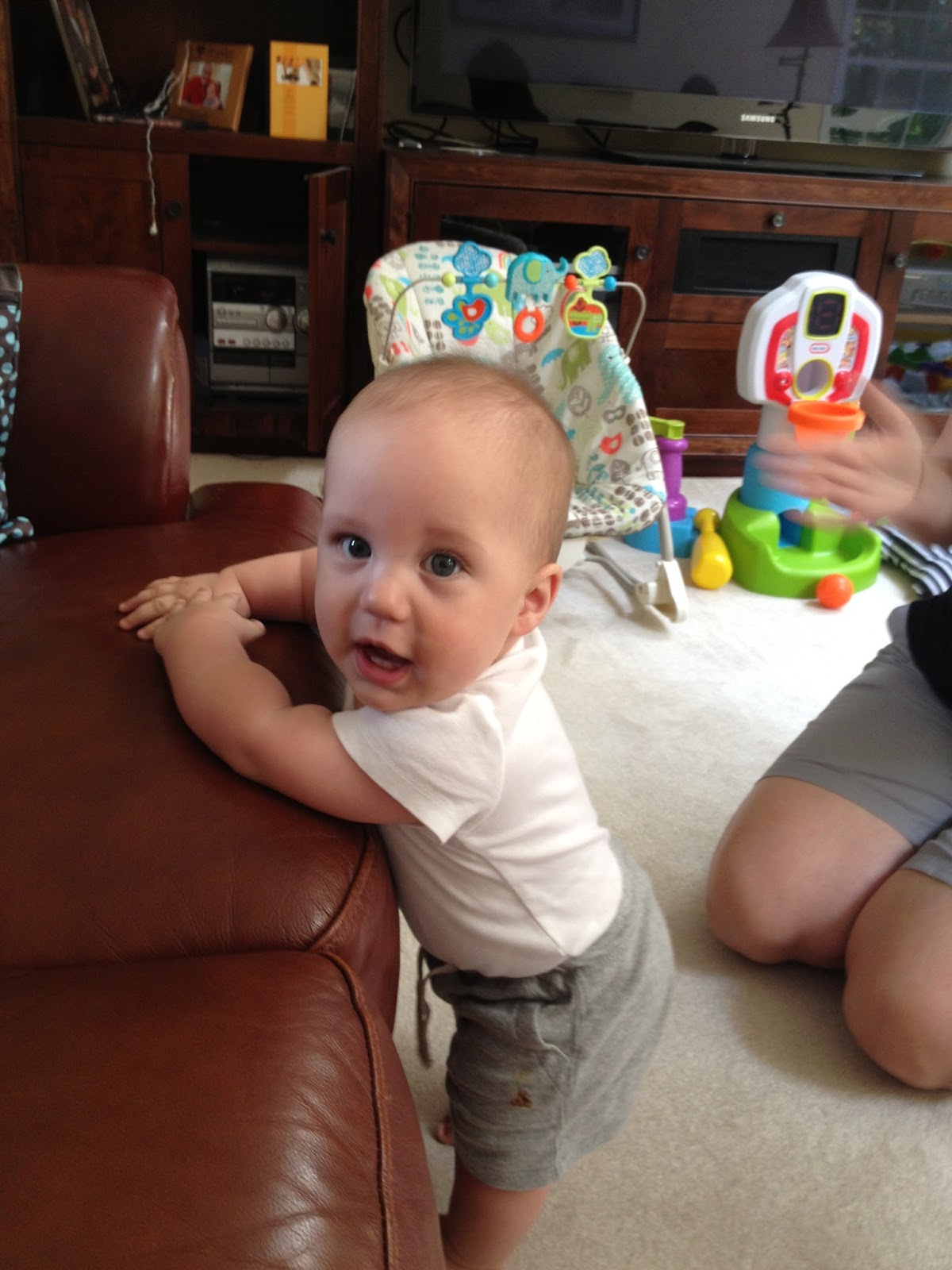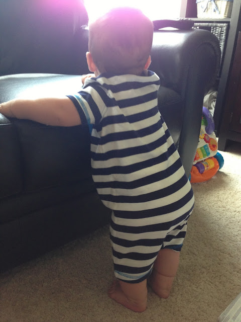 Milestones: Noah is now able to stand while holding onto the couch. For a while I would put him there and he would immediately fall. At the beginning of the week I was impressed that he could just stand there for a while, and then the next day he wowed me by doing it with only one arm supporting him! It's amazing how one day they are just able to do something new!