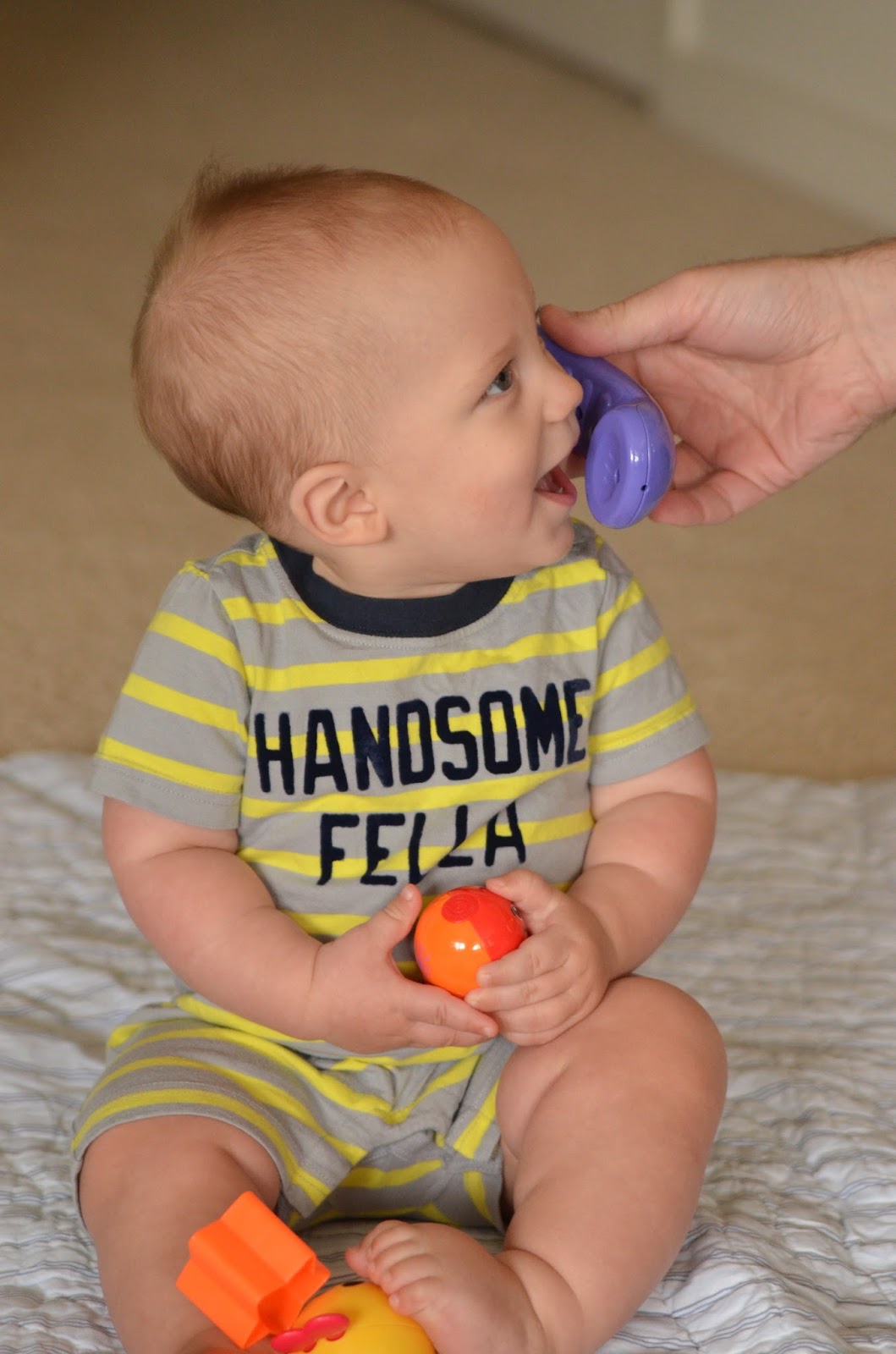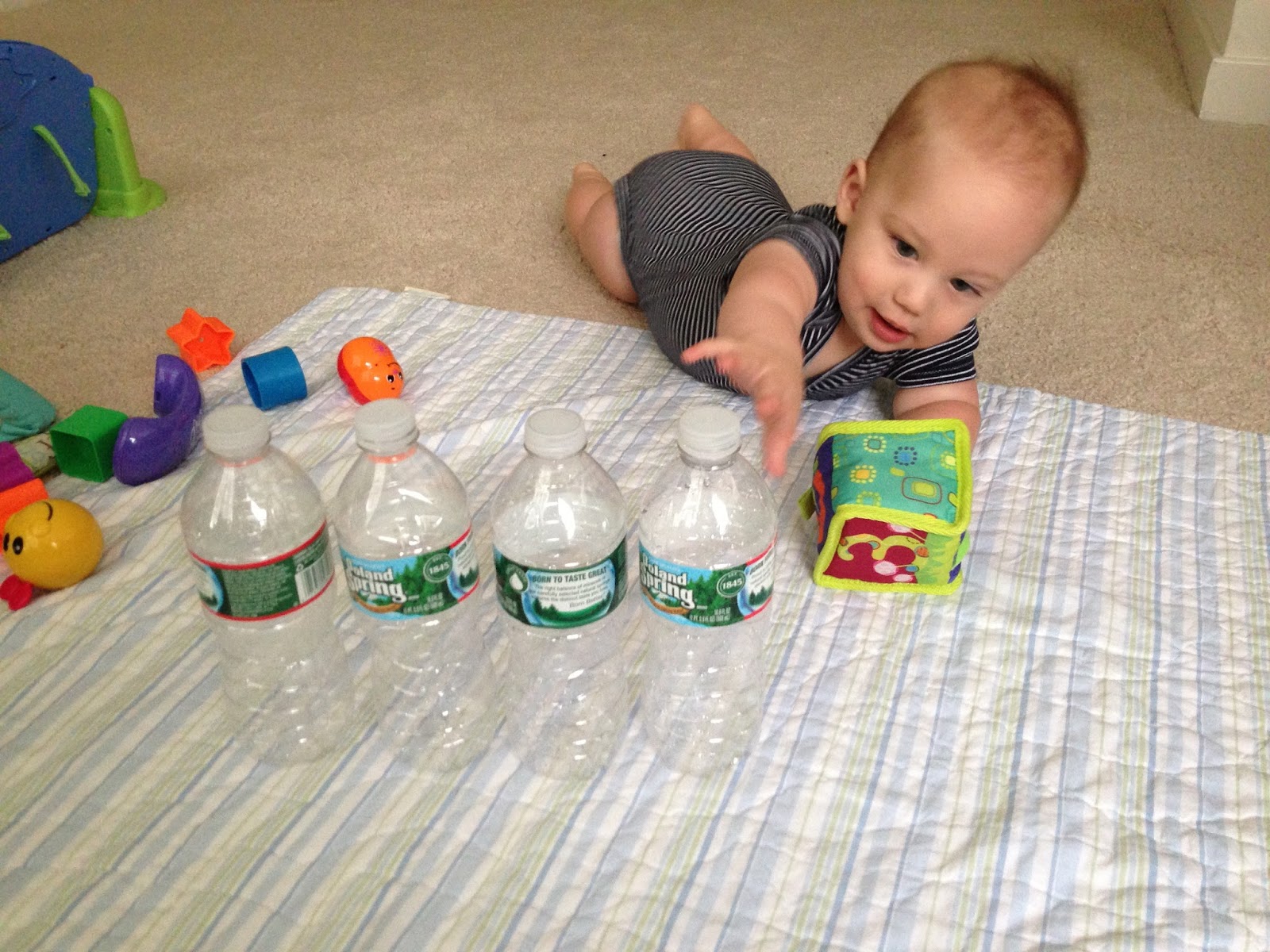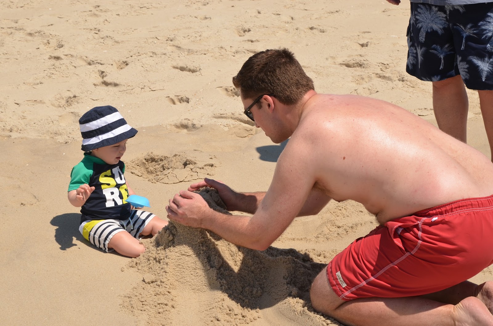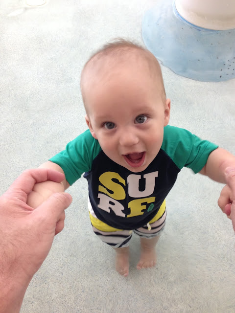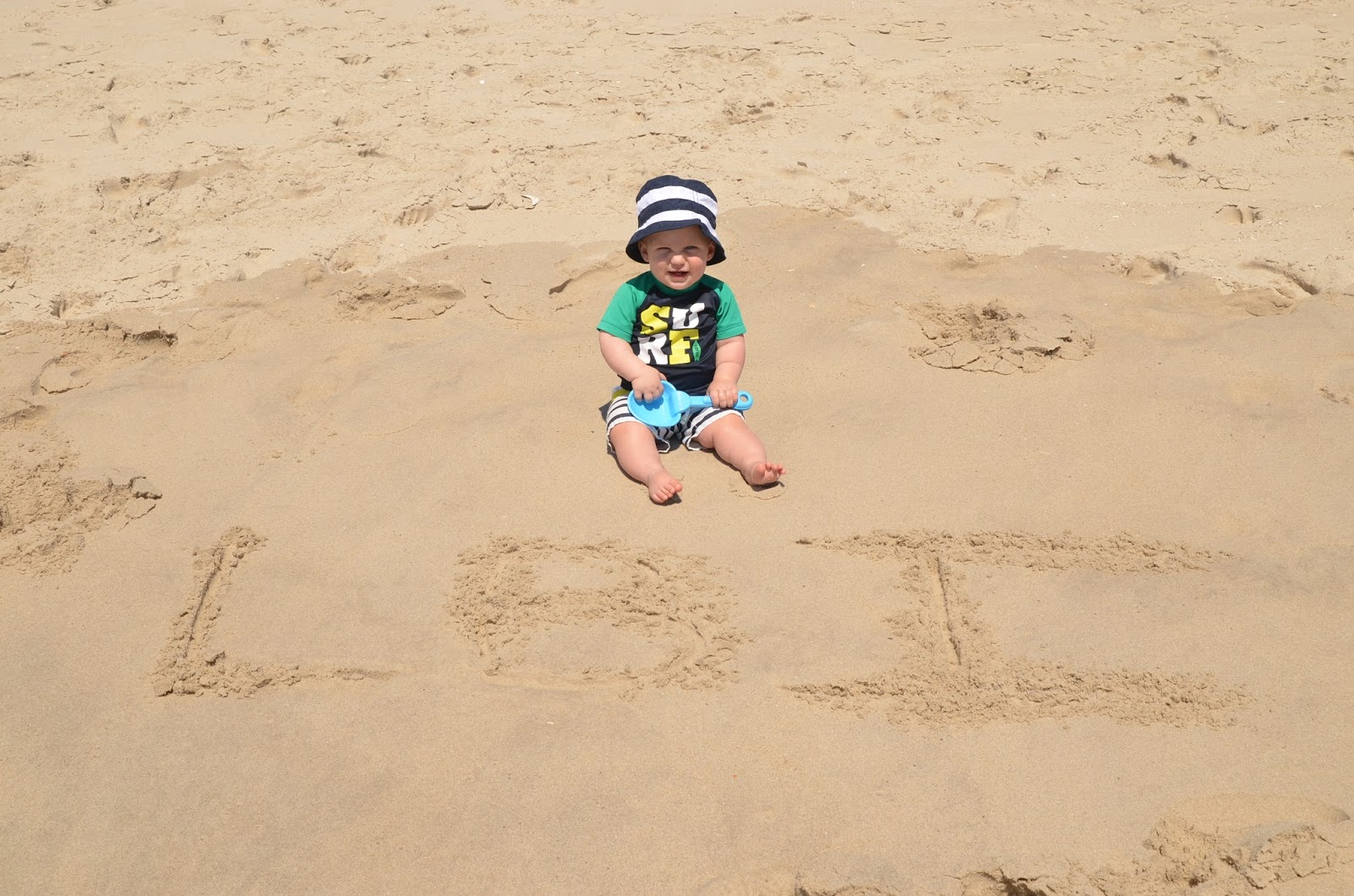 Noah had fun playing with his sand toys while sitting on the blanket. I'm sure he would have loved to sit in the sand, but this way was cleaner and I think it helped with him not eating the sand. We took him back by the water and this time he loved it.