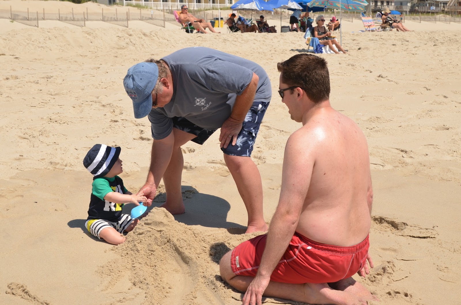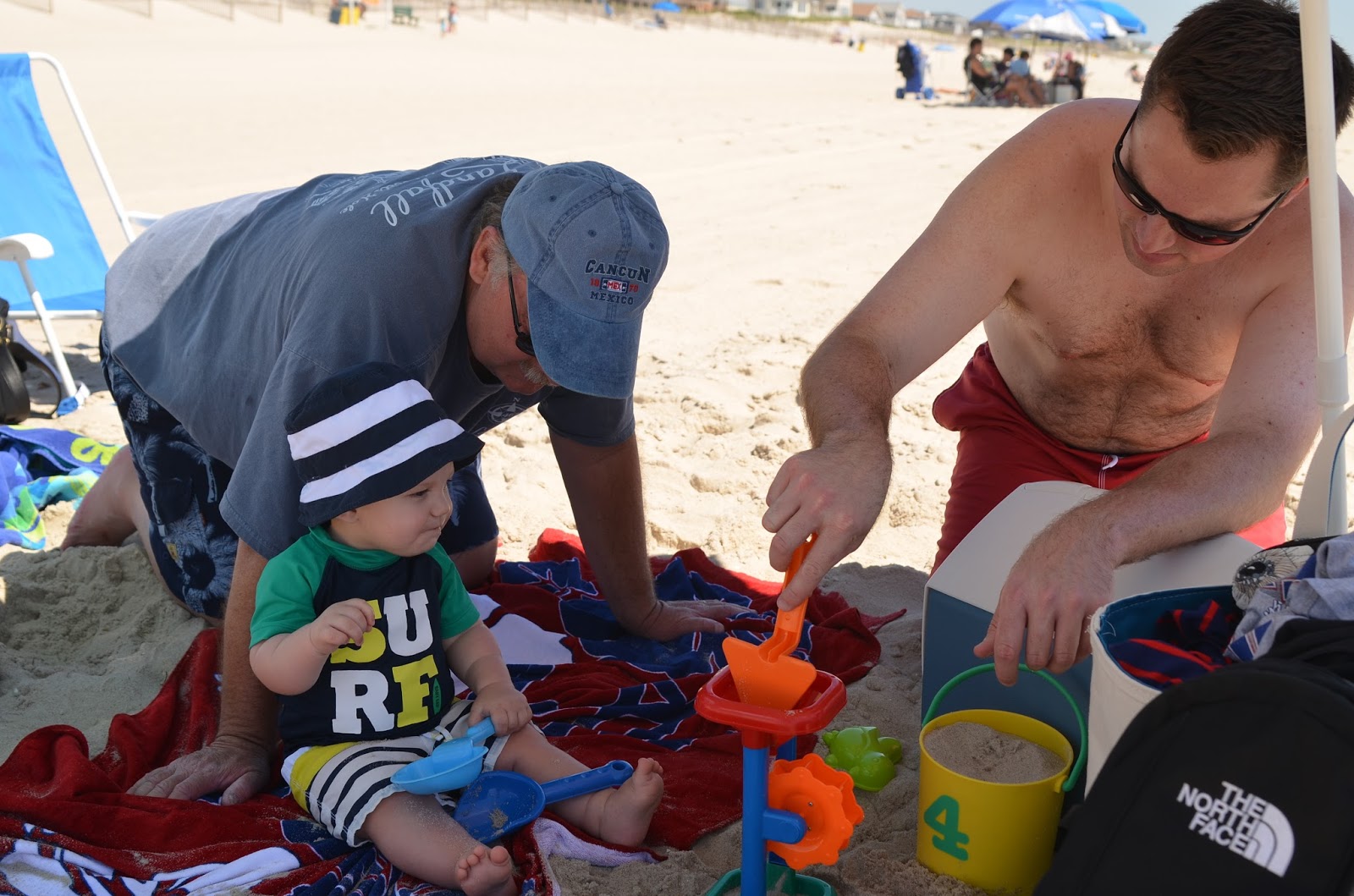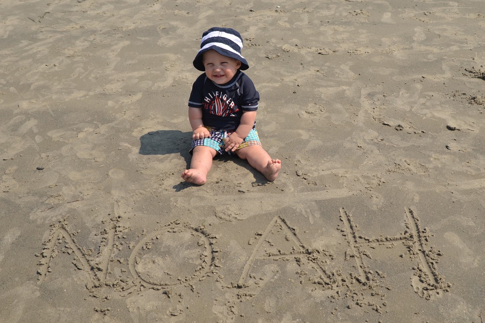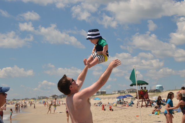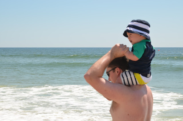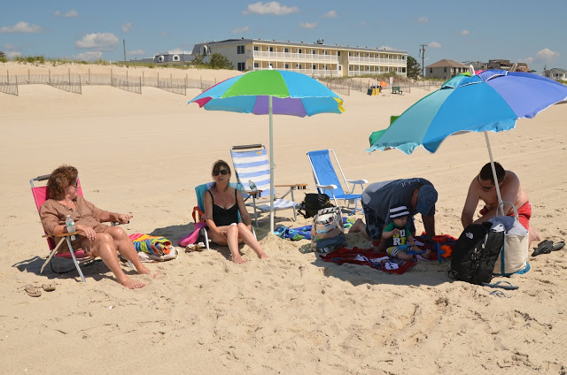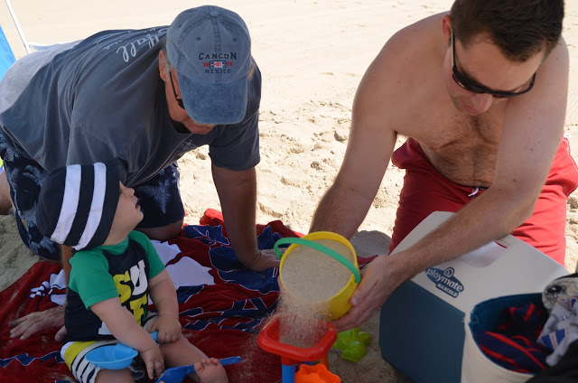 We got there by 10 am and hit the beach. Since Chris' parents had 2 umbrellas, and we were only planning to spend the morning there, we decided not to set up Noah's beach tent this time. While the guys were bringing all the chairs and umbrellas out, Grammy and I took Noah out to the water. He loved it so much in Rhode Island, but I think the waves were a little stronger (and louder) here. I had him stand in the sand and waited for the water to come in. At first we were just too far out so that the water didn't hit his feet, so I moved him a little closer. Well then a wave came in and he got splashed a bit and he did not like it! Thankfully he cheers up super quick (as in as soon as I picked him up)!