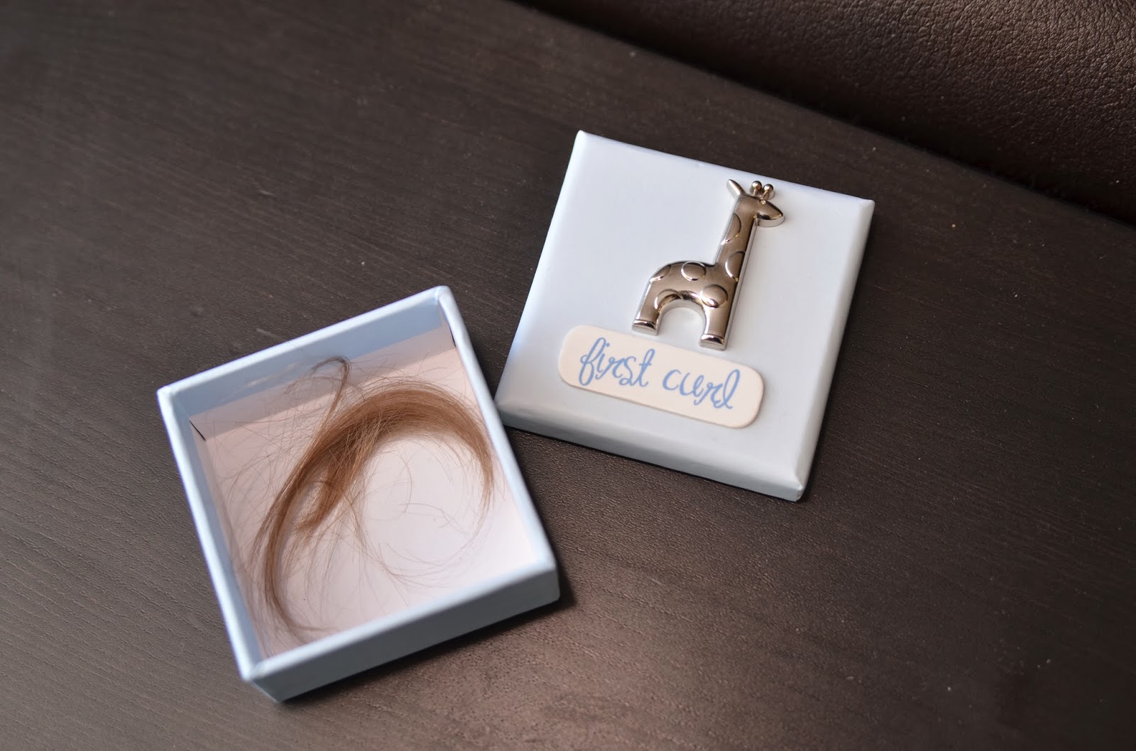 In addition to the certificate that the hair dresser gave us, we decided to save some of his hair as well. When Noah was born, we were given these little decorative boxes. One holds his hospital bracelet, this one holds his first curl, and the last will hold his first tooth.