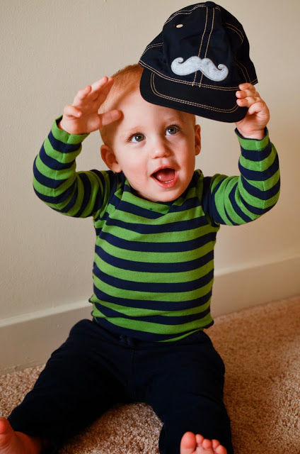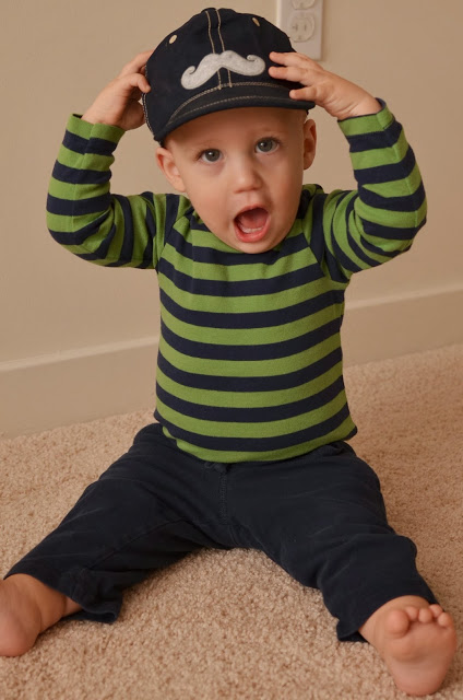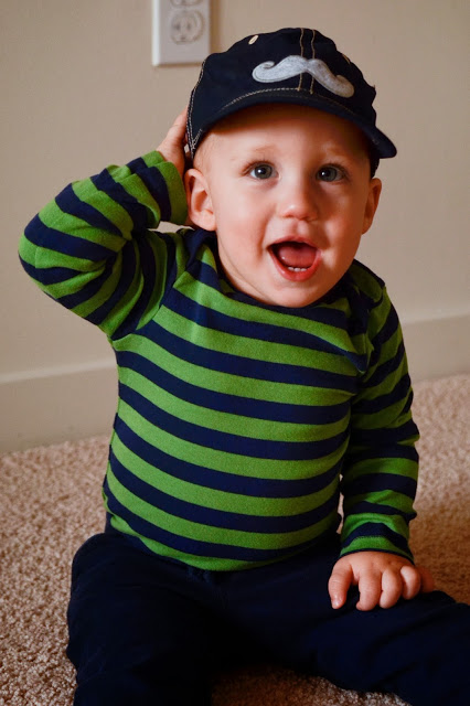 Since this is the last day of November, I figured I'd say good bye to it with some cute pictures of Noah. Movember is a global charity that encourages men to grow a mustache during the month of November to bring awareness to prostate and testicular cancer and men's health in general. Since Noah can't grow a mustache (he can barely grow hair on the top of his head!), we got him this super cute hat from Gap (no longer available).