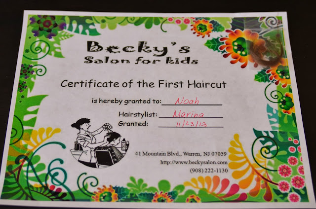 Noah had his FIRST haircut on Saturday. While Noah really doesn't have any hair up top and in front, it was getting pretty long in the back. And it didn't have enough curl to bounce up, instead it just looked like he had a lot of bad hair days. My hairdresser recommended we go to this place in town that specializes in kids' haircuts. They even have little cars for the kids to sit in! It only took 5 minutes, and when we were done, they gave us a certificate documenting Noah's First Haircut with a little bag of his hair attached! (Sorry the pictures aren't that great... we just used our iPhone)