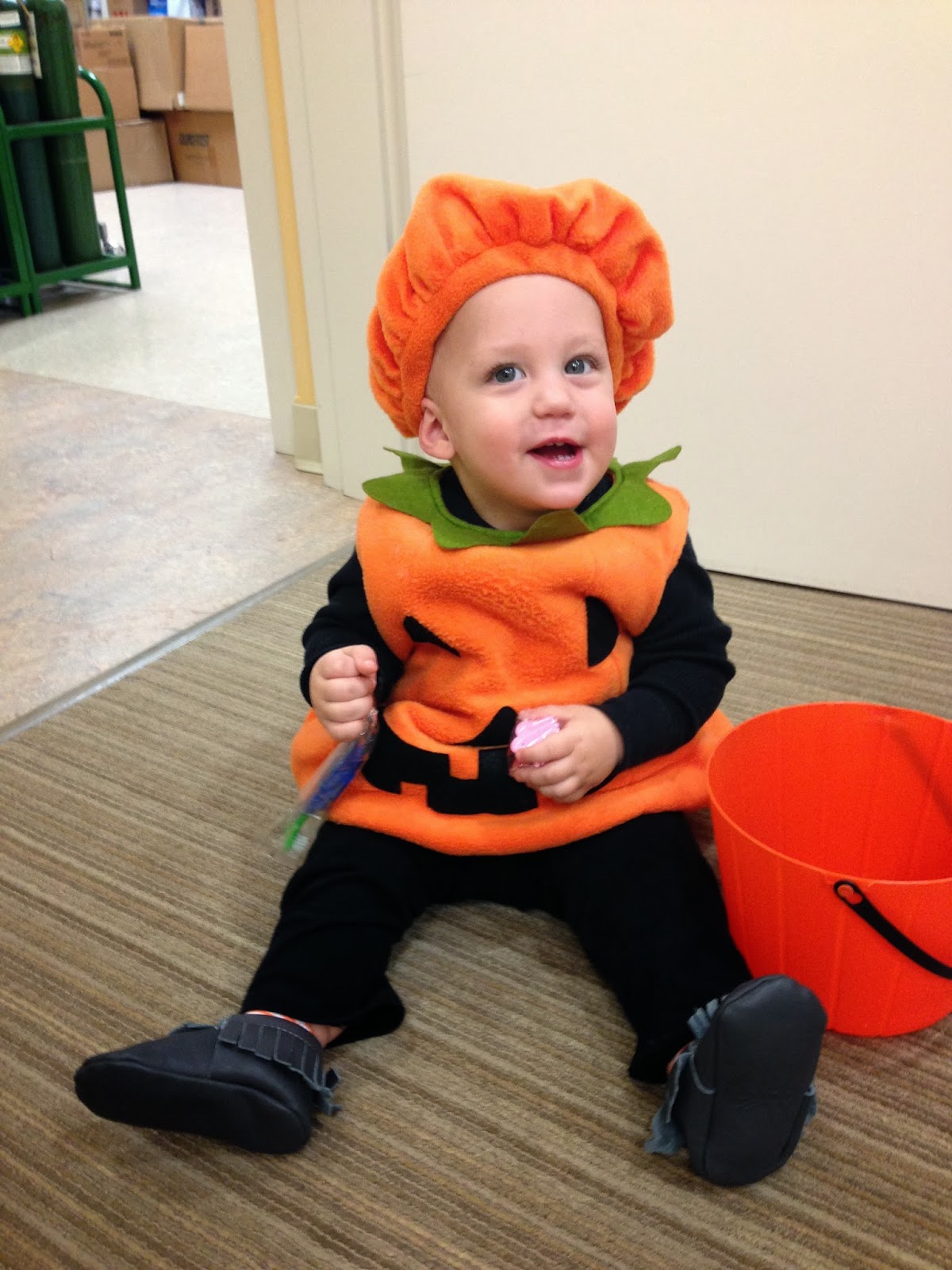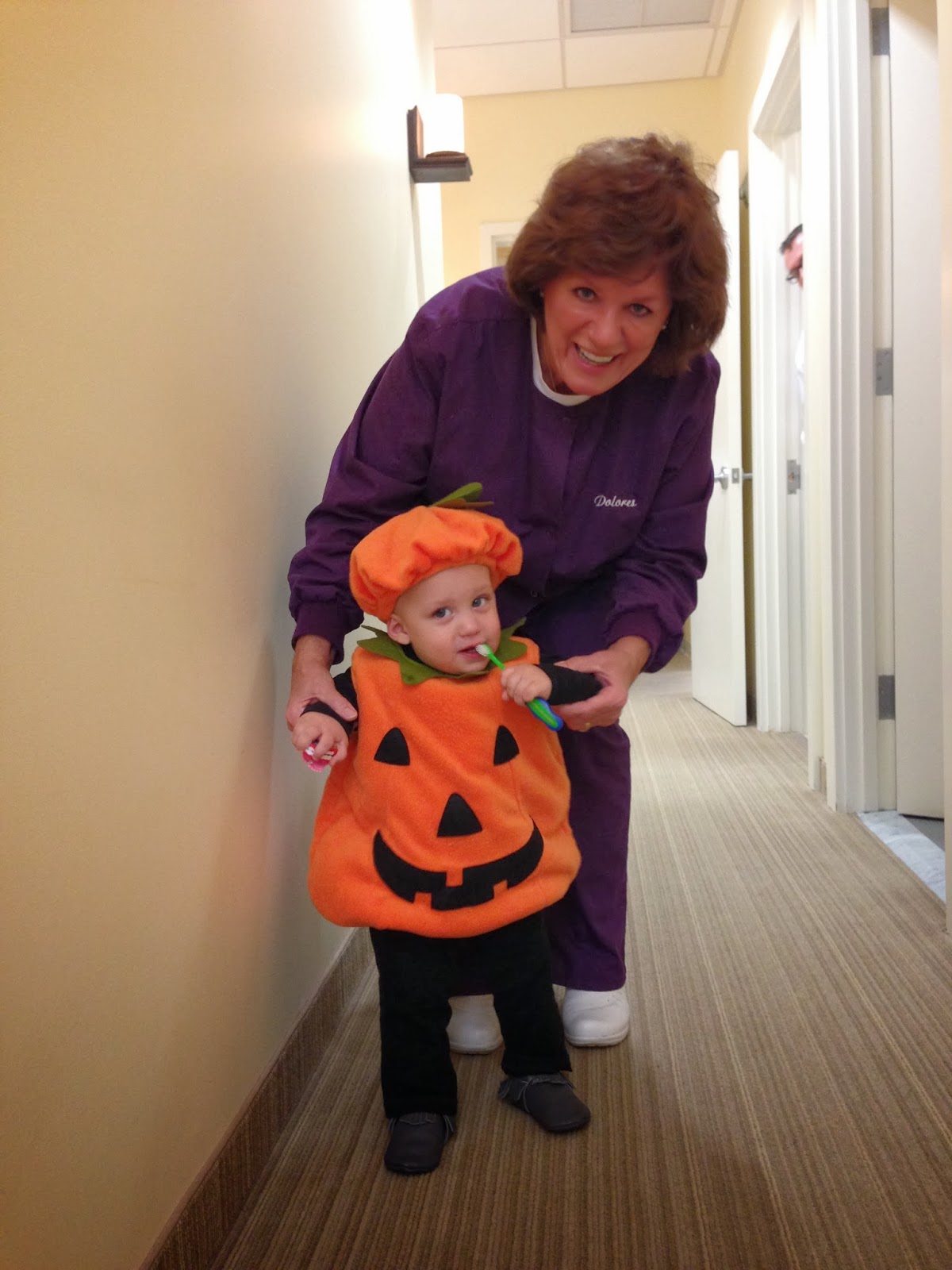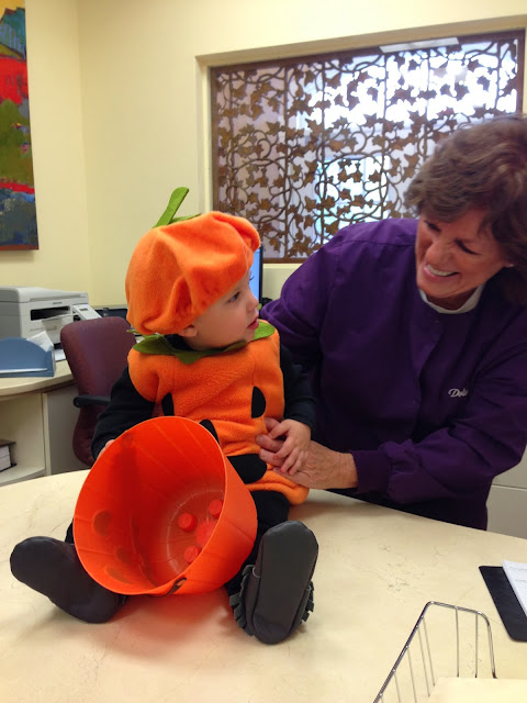 We kept it pretty low key on actual Halloween and didn't actually go trick or treating like the title of the blog post might imply.  Instead, we just made a few stops, showing off Noah as a pumpkin. We stopped by the dentist where Grammy works and all her co-workers oohed and aahed.