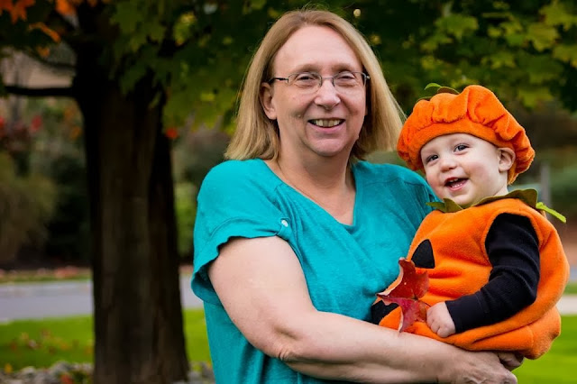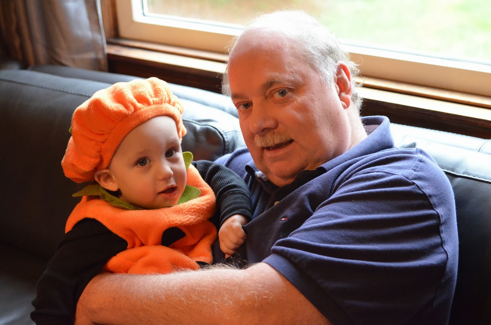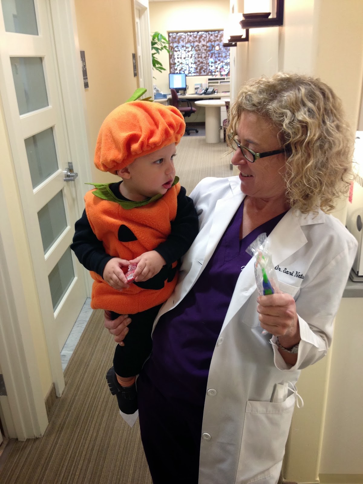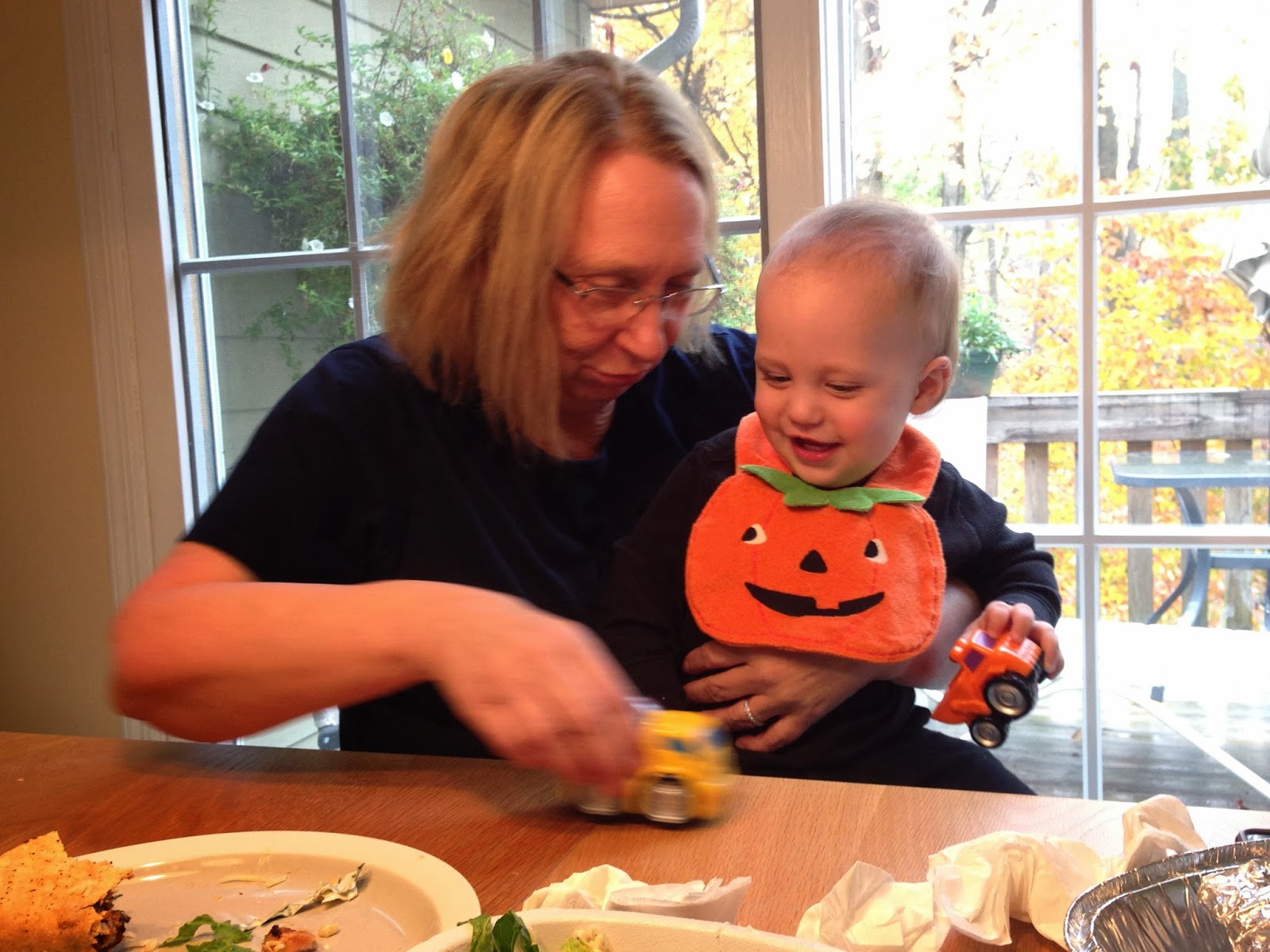 We kept it pretty low key on actual Halloween and didn't actually go trick or treating like the title of the blog post might imply.  Instead, we just made a few stops, showing off Noah as a pumpkin. We stopped by the dentist where Grammy works and all her co-workers oohed and aahed.