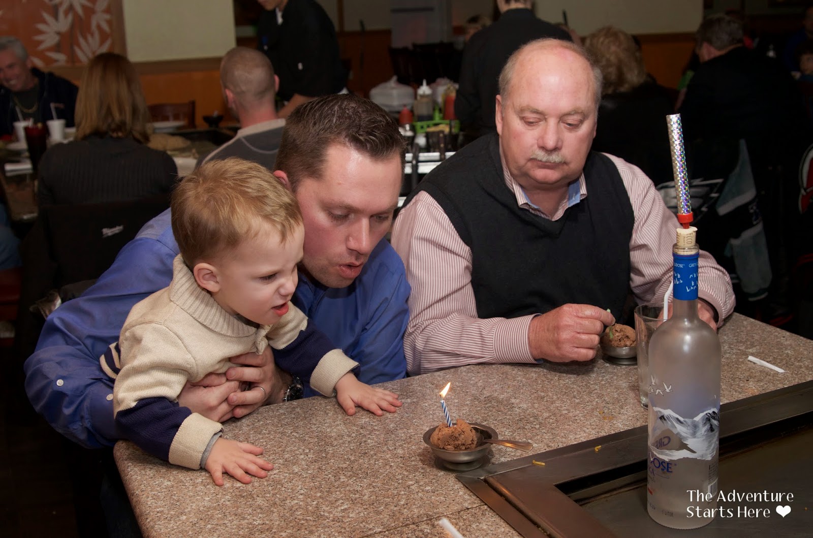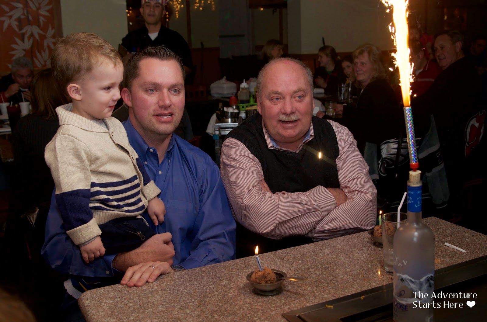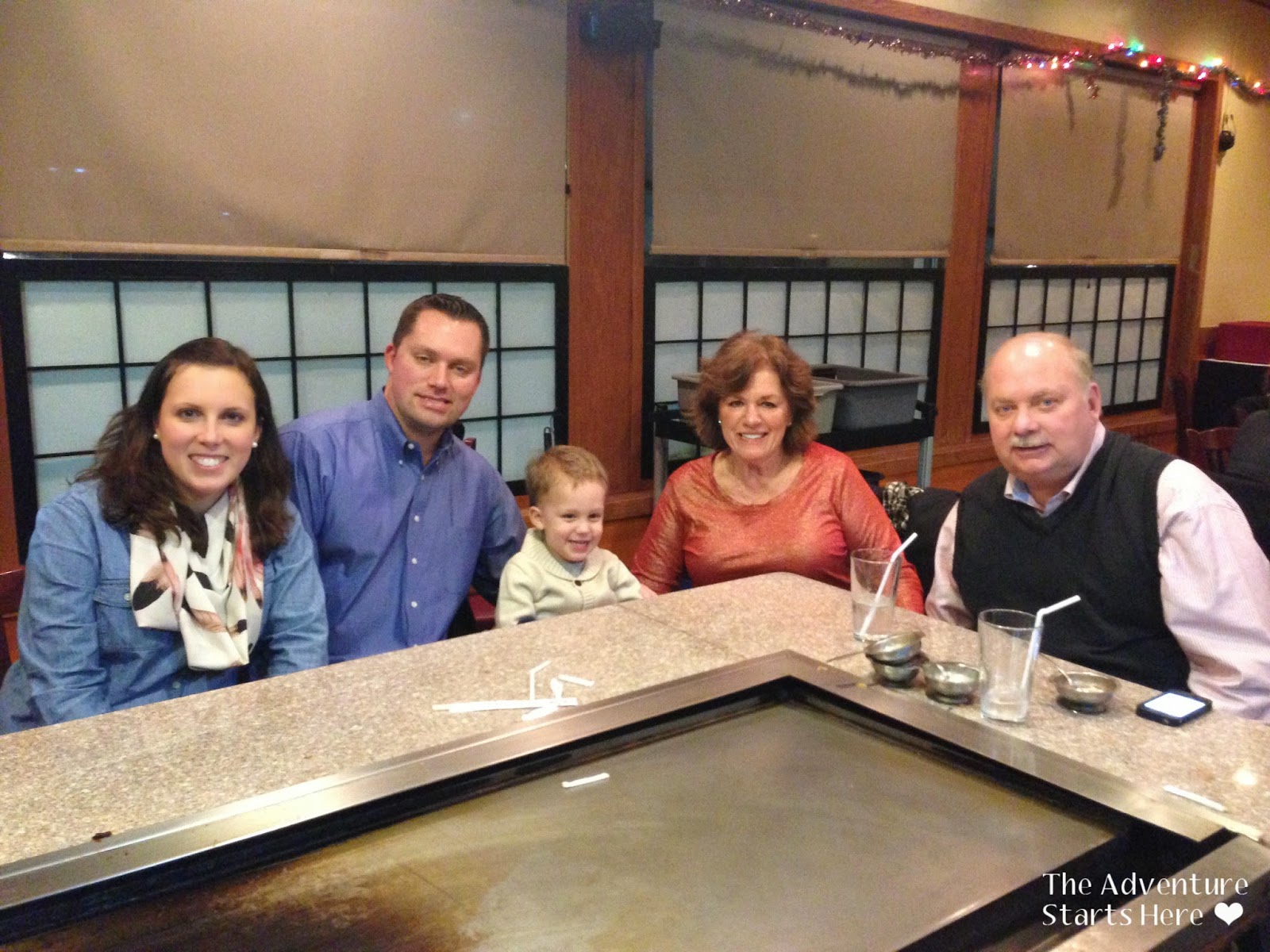 On Sunday night, we went out for Hibachi with Chris' parents to celebrate both Chris and his dad's birthdays.  Noah loved the spectacle of it all when we went with my family, so we thought it would be fun to take him again.   This time he was more interested in the "show" when it was happening at other tables and not as much at our own table.  Instead, he just wanted to climb all over a nearby booth ;)  He was interested in eating the rice and noodles and was even able to use the kid chopsticks all on his own!  We ended the evening with some ice cream and a big sparkler!