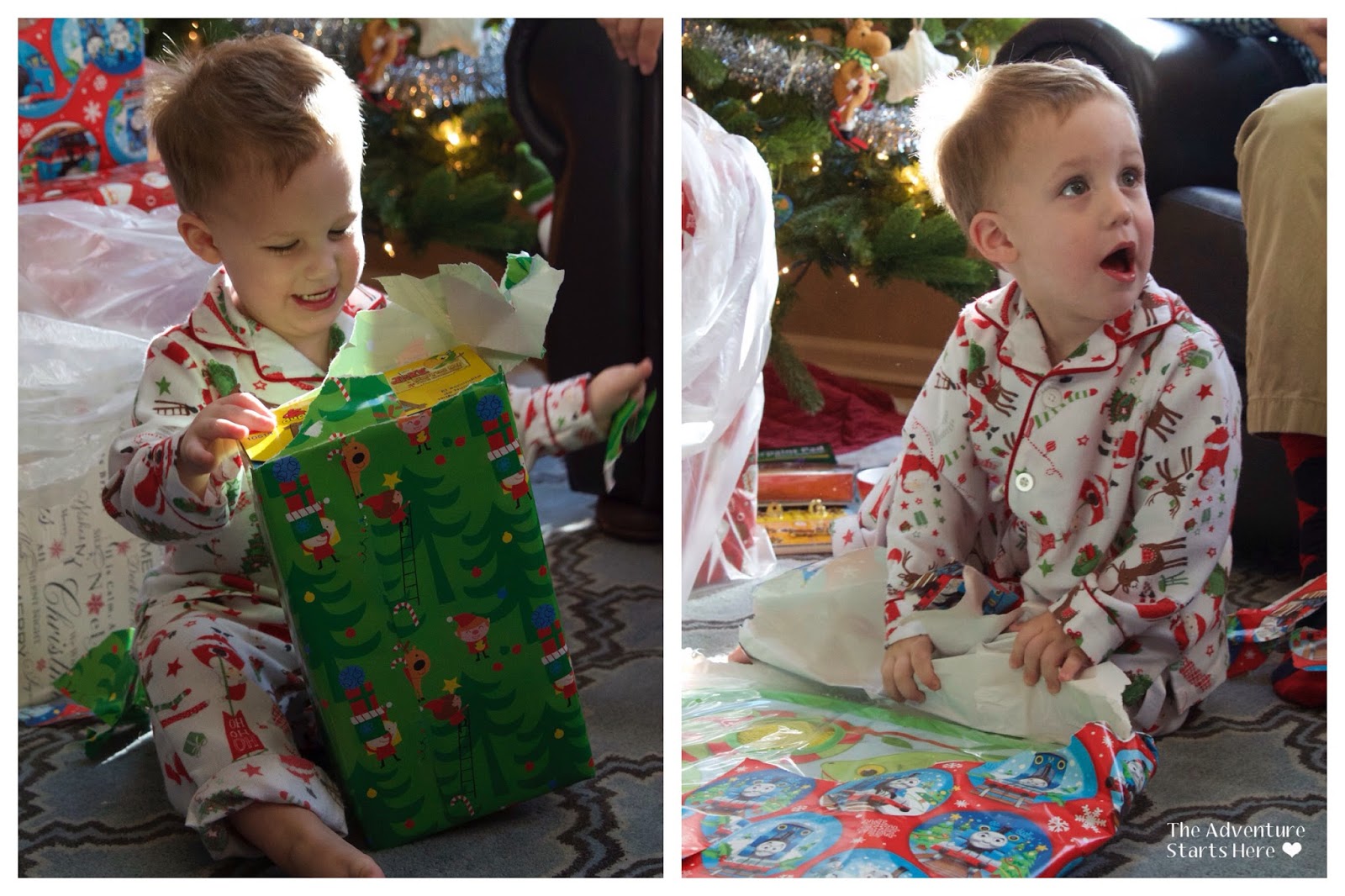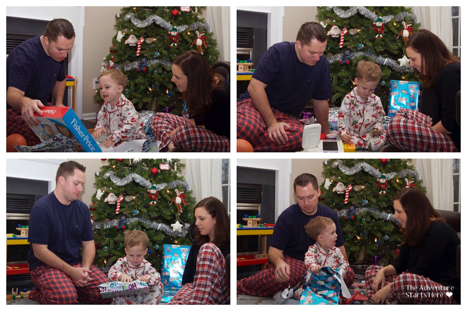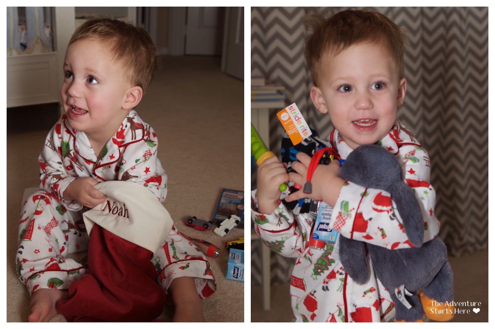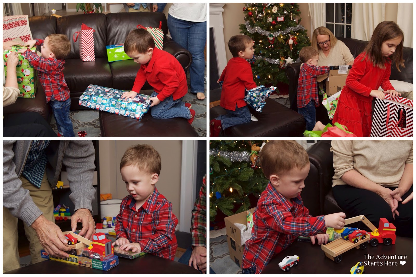 Christmas Day was all about opening gifts from Santa and my family.  Since Noah isn't old enough to wake up earlier from excitement, he woke up at 7:30 like he usually does.   I grew up where Santa left our stockings in our room (our outside our door) and we were allowed to open it when we woke up.  I was notorious for getting up super early (like before 5 am early) on Christmas, so this gave my parents some extra sleeping time or time to get dressed and ready to go downstairs.  We've continued this tradition and Noah found his stocking on his changing table and opened it in his room.  We purposefully filled it with things that could keep him entertained for at least 30 minutes (books, stickers, Curious George & Thomas DVDs, matchbox cars, etc).  Chris and I took turns reading books and using the stickers while I brushed my hair and teeth and Chris grabbed some donuts and hot chocolate at Dunkin Donuts.  We couldn't have planned it better!