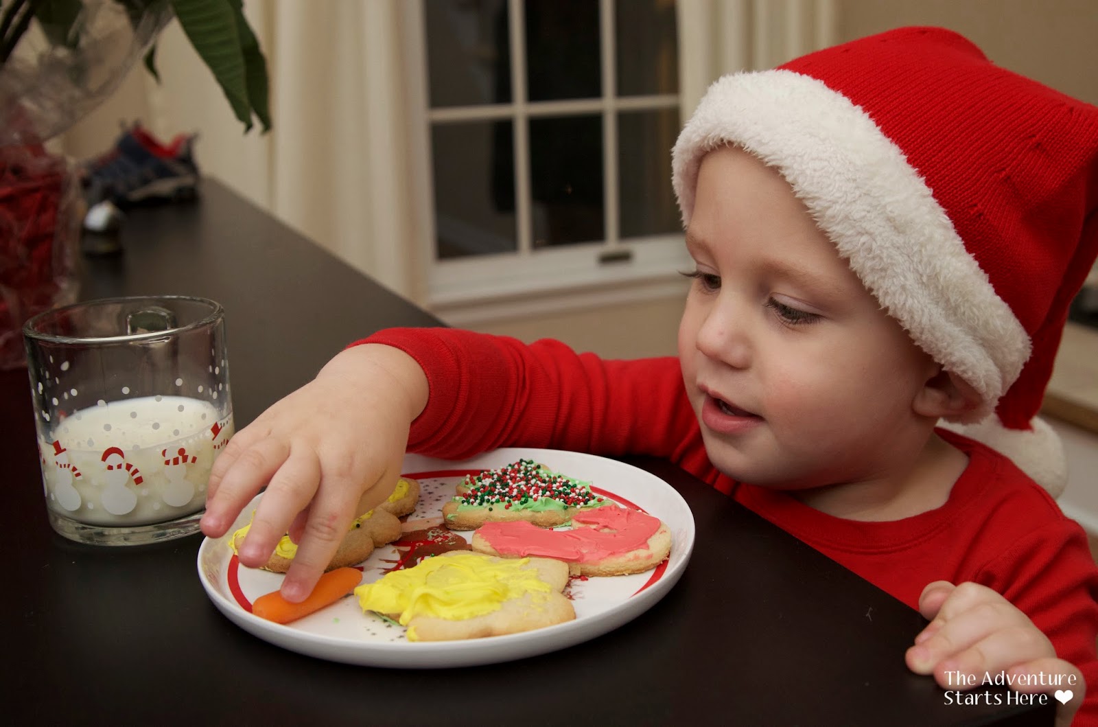 When we got home, we immediately changed Noah into his PJs and came downstairs to leave some cookies and milk for Santa and a carrot for Rudolph.  I guess Noah didn't realize they were for Santa, because he proceeded to eat a whole cookie!  Noah then unwrapped his last Christmas book and we read "The Night Before Christmas" in front of the tree.  Noah was really into it and thought it was cool when I pointed out the cookies, milk, and carrots left out for Santa just like we did!  I love seeing Noah's face when it all clicks and makes sense to him!