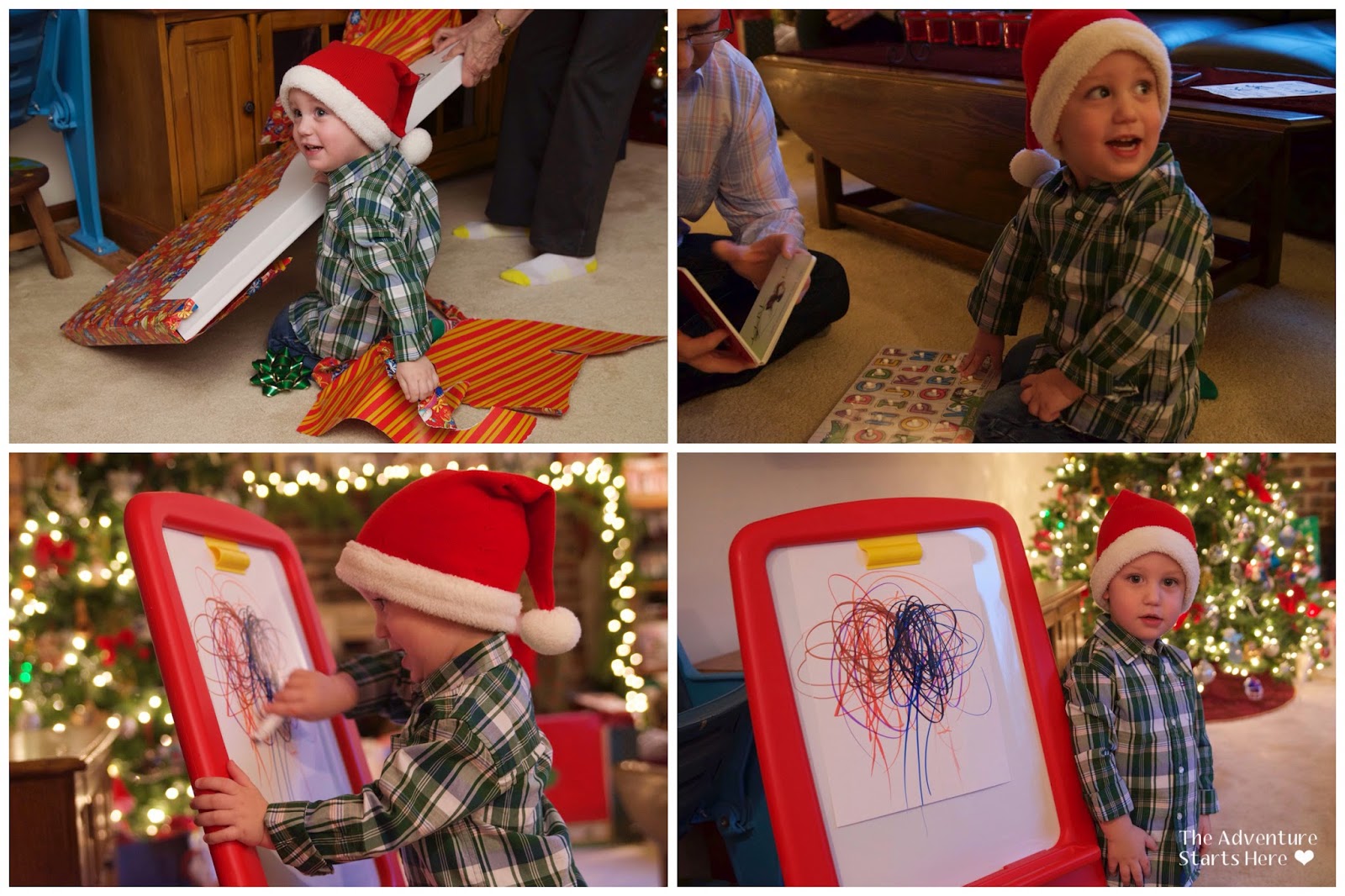 On Christmas Eve, we went over to Nonna & Granddad's house for dinner.  We celebrated with Chris' brother, Chris' Great Uncle & Aunt and their son, as well as a family friend.  The night was full of good food and everyone opening gifts.  I think Noah's favorite gift of the night was the easel from Uncle Bobby & Aunt Judy!