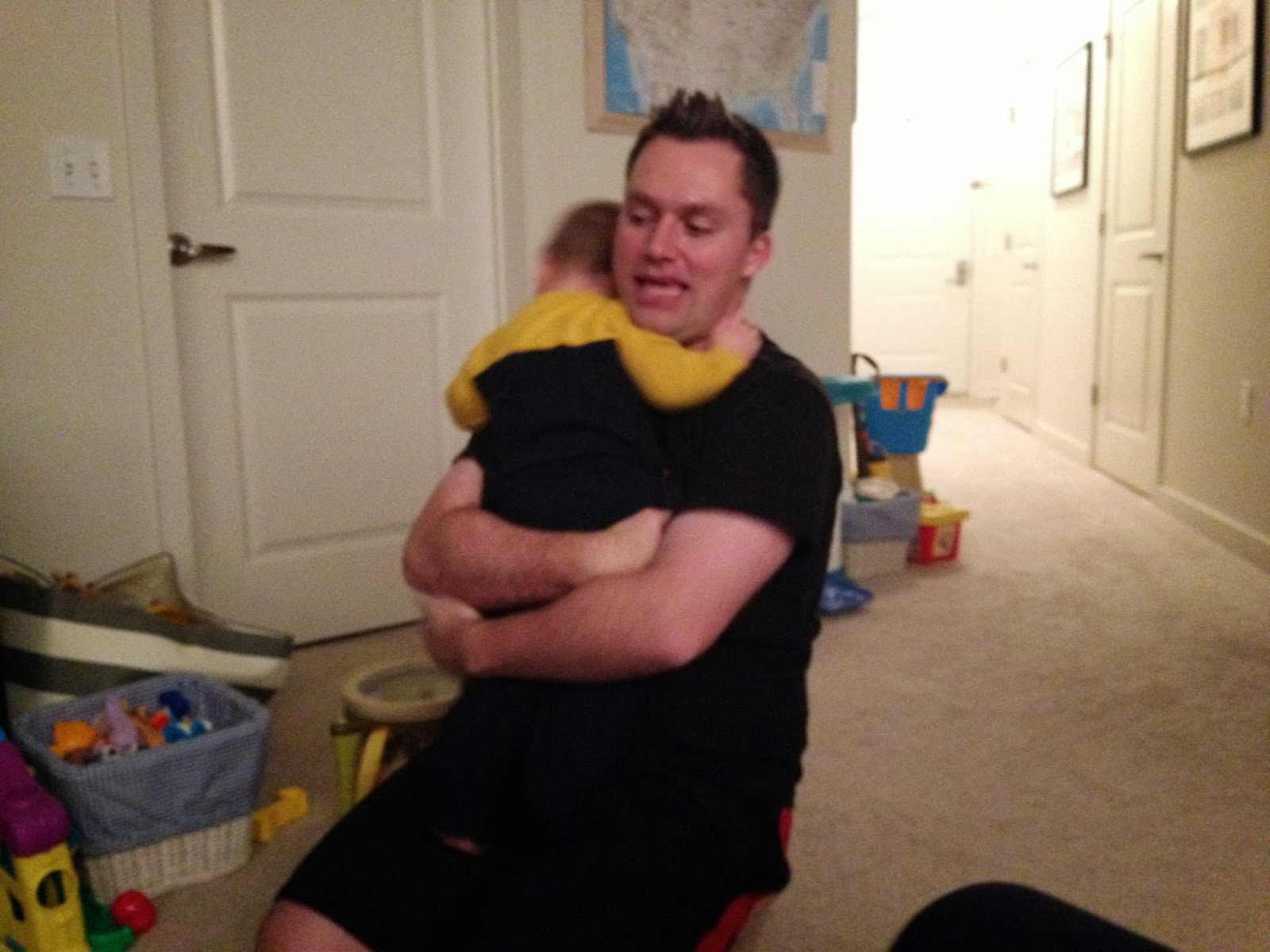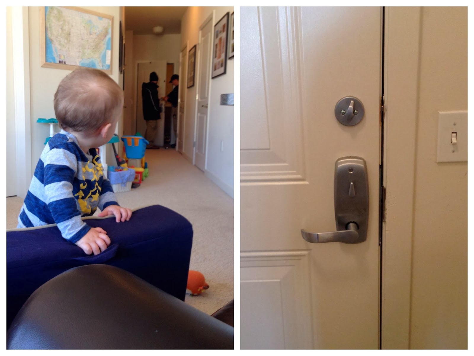 Ever since Noah figured out how to open our front door, we've been scared that he is going to get his fingers stuck and really hurt himself. It's one of those doors that automatically unlocks when you pull the handle. So we asked maintenance to install a deadbolt and we finally got it on Wednesday! Noah was very interested and wouldn't take his eyes off them installing it!