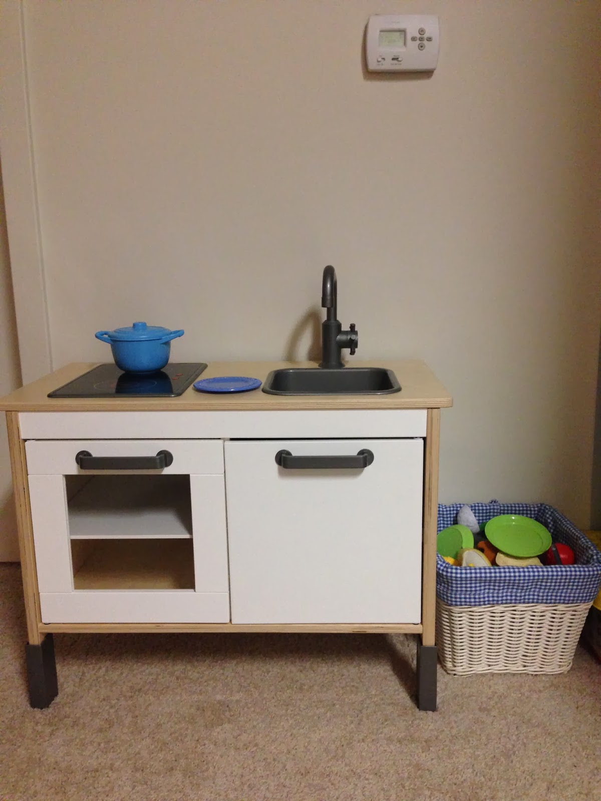 Noah got a new toy kitchen! The Fisher Price kitchen he got for Christmas kept collapsing. The bottom part would cave in whenever he pushed on it. After "fixing" it numerous times, we decided it's not worth it. Instead, we are returning it (I think it might be defective) and we got the Ikea play kitchen instead! It took a long time, but we (98% Chris) were able to put the base of it together last night. We plan to assemble the hutch tonight.