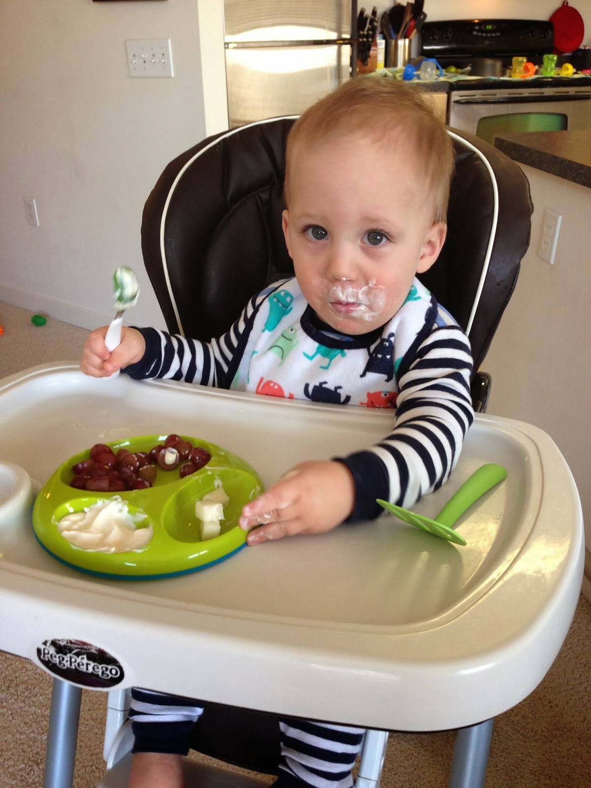 Two new teeth popped through this month. Just like in the past, we were so focused on the last molar coming through, that I was unaware that his first canine was also about to come in. I've read that the top teeth usually come in first, but Noah got his bottom middle teeth before his top ones as well, so I'm definitely not surprised. Teething this time was no fun (like usual) and he was drooling non stop. He also went through a phase of trying to bite me, and succeeded one or two times.