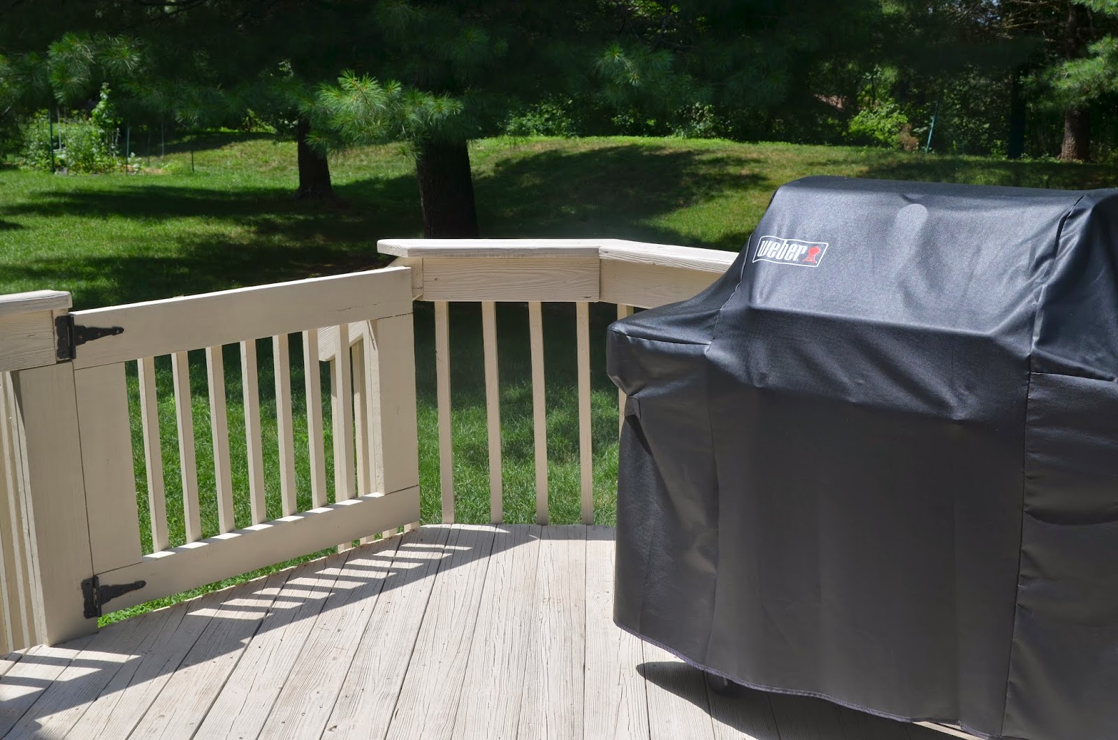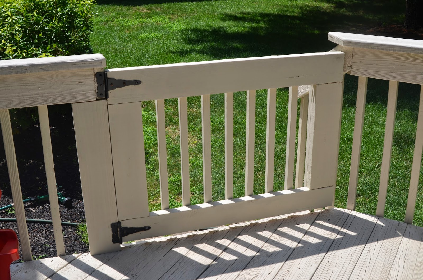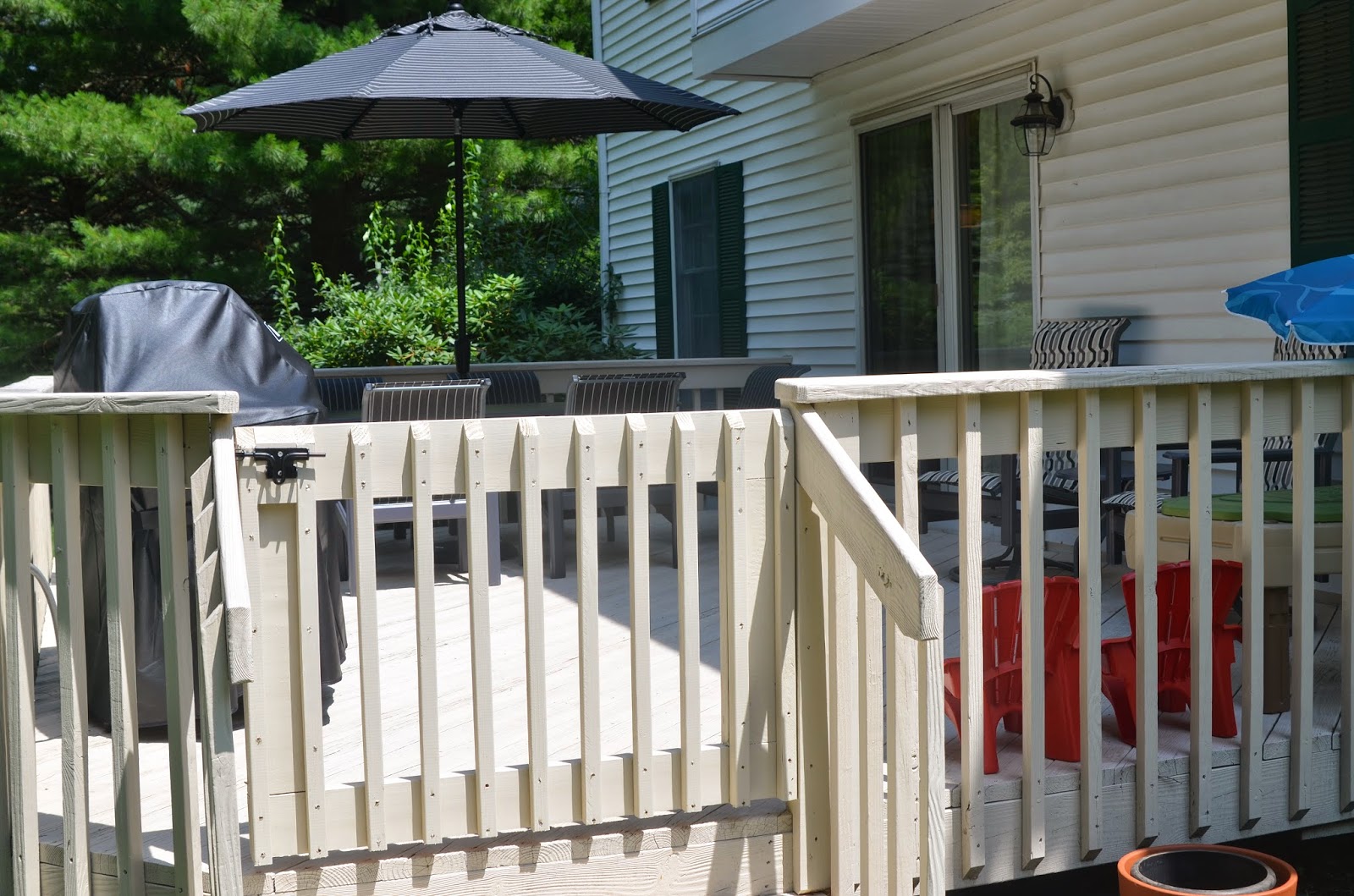My parents got Noah his water table and grill (both from Toys R Us).  Noah loves to be outside!  Since Noah has his toys he's happy to stay out longer and let us sit and relax after dinner.  We had our handyman build this gate and my dad paint it to match the deck.  I had seen the idea on Young House Love and knew I wanted one.  It's such a relief to know Noah won't escape or fall down the stairs.  I was so impressed with how it turned out.  I showed him one picture for maybe 10 seconds and he built it the next day!  Man I wish I was handy!