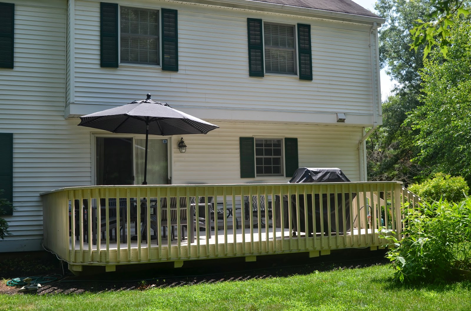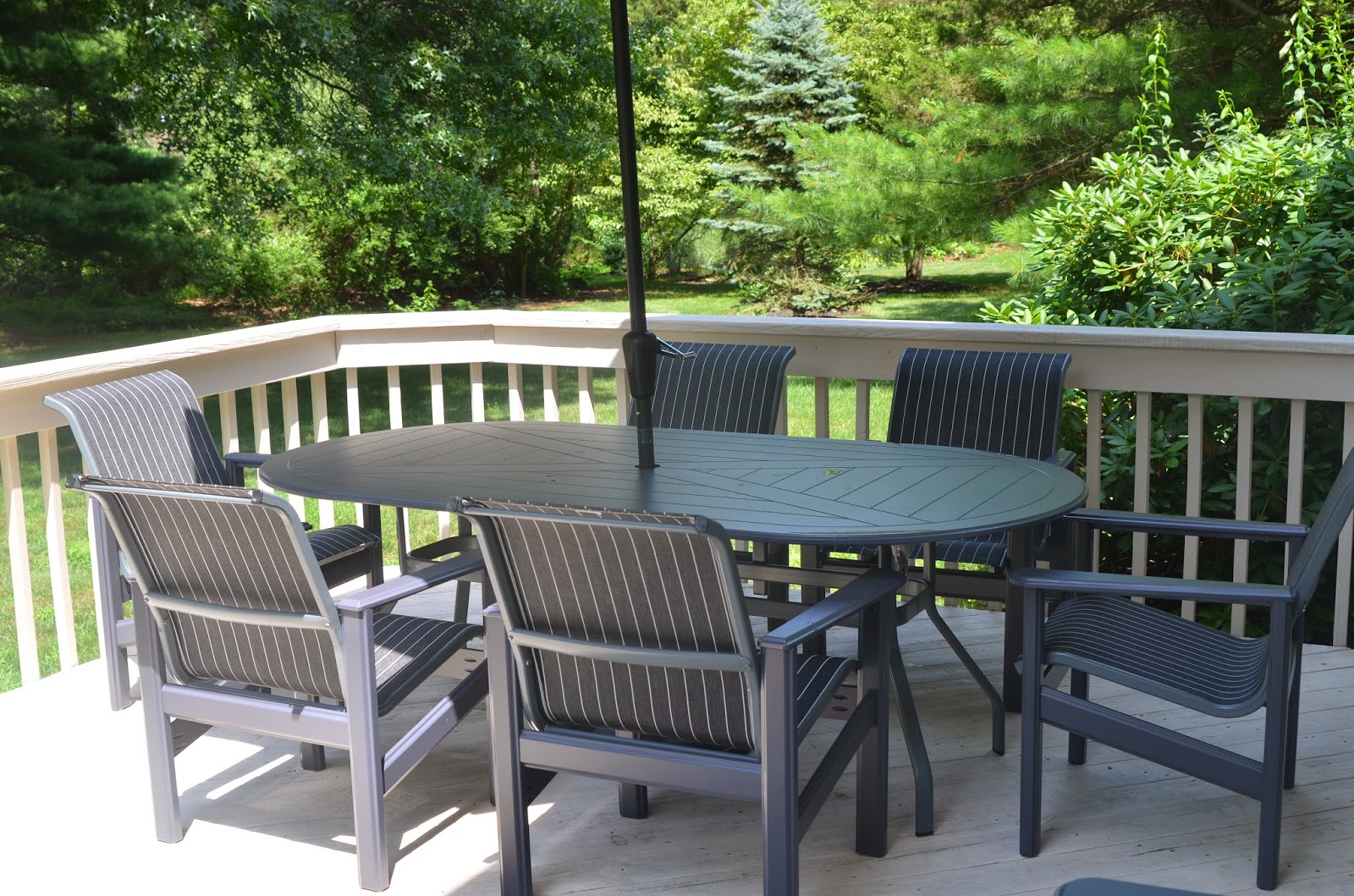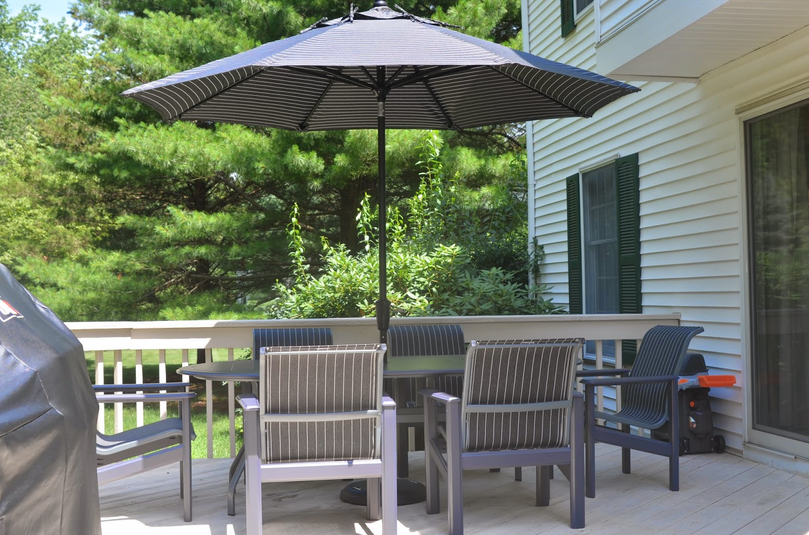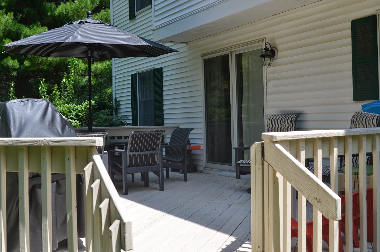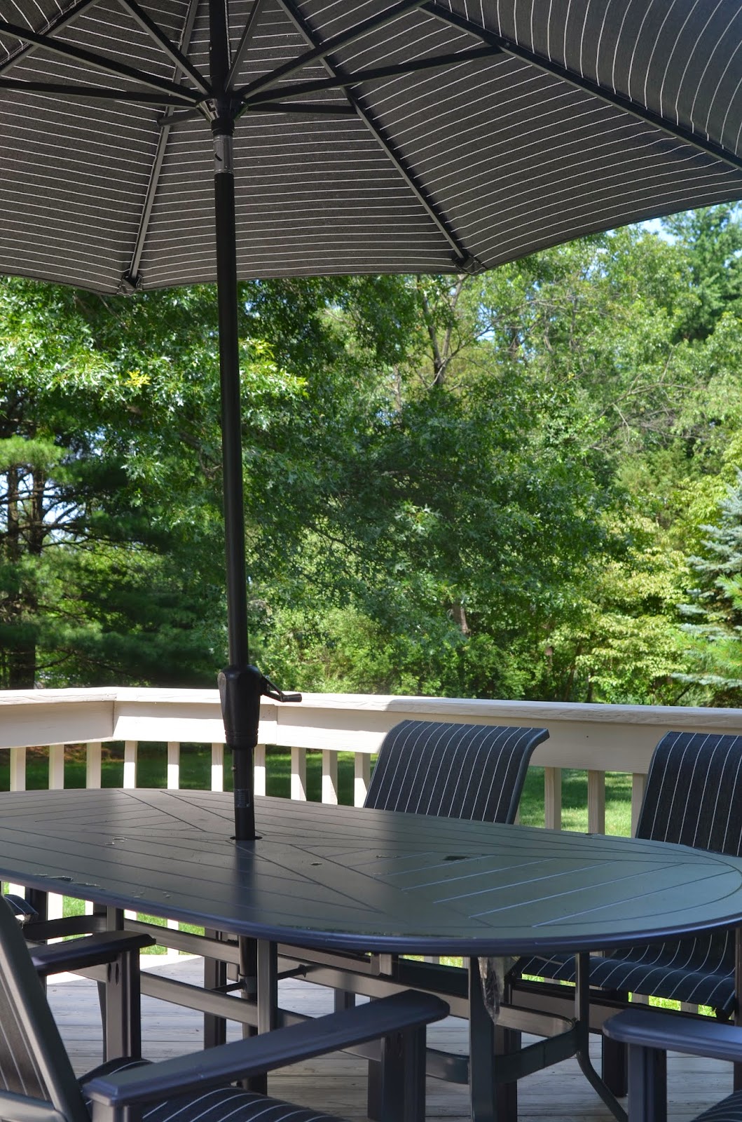 One of the first spaces we had completed in the new house was our deck.  Since we had to buy everything new, it was all delivered before we even moved in.  We spent many afternoons sitting out there waiting for deliveries or eating lunch while Noah played.  And now that we've moved in we still eat most meals out there!