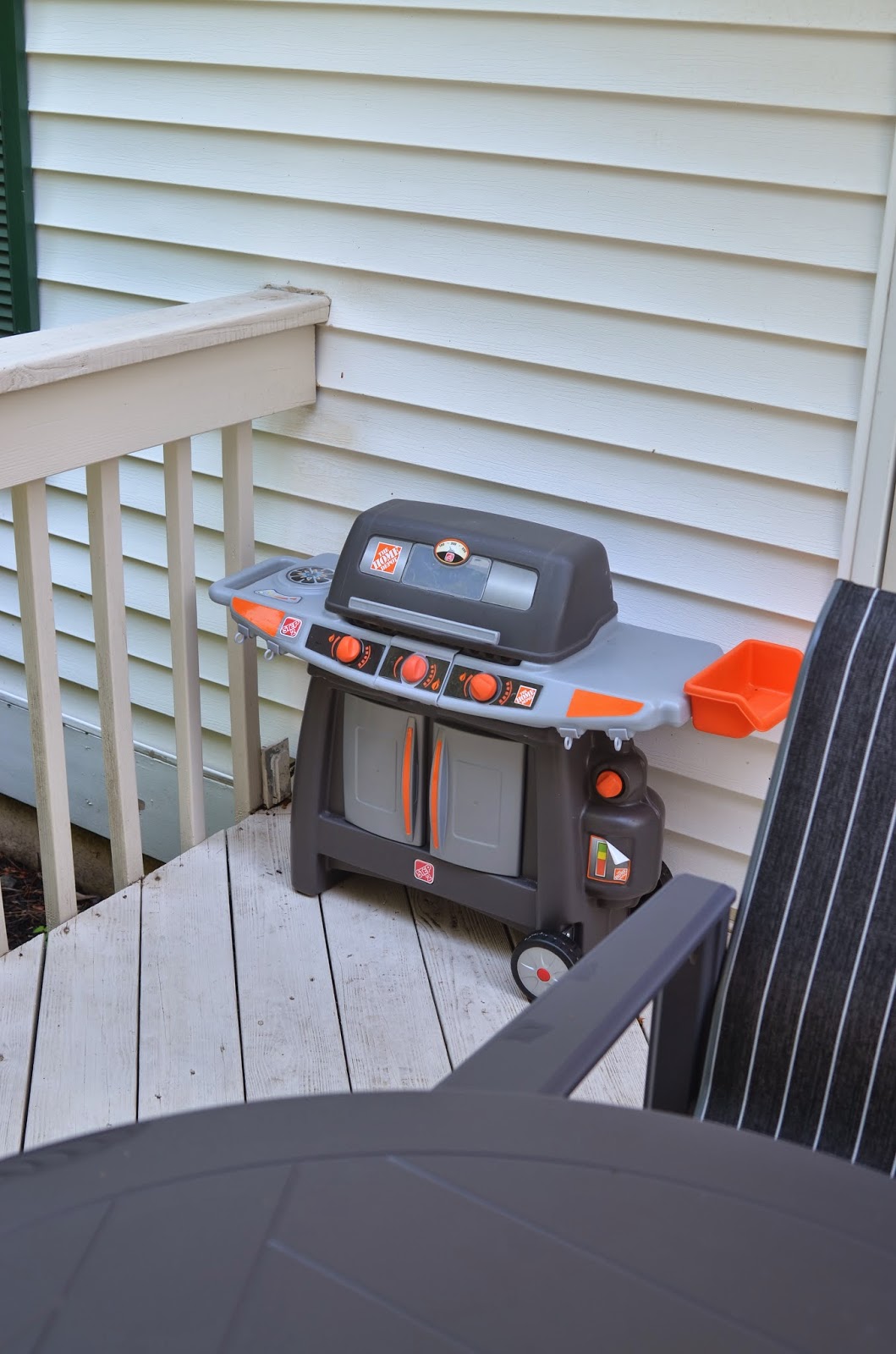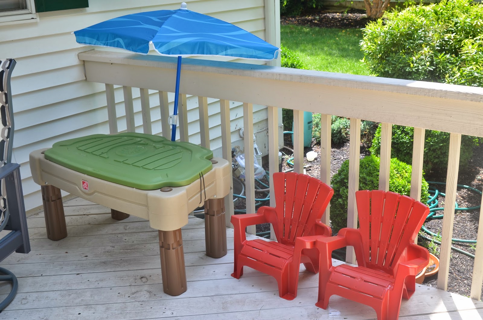 We also got Noah some plastic Adirondak chairs from Amazon.  They can be connected with a table and mini umbrella but we prefer the separated.  Thankfully our deck is in the shade most of the time too.