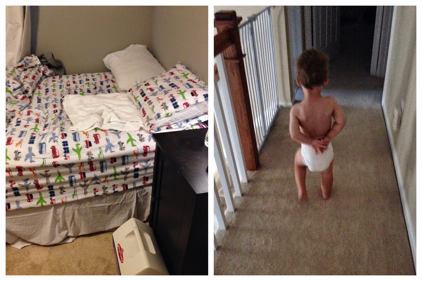 Since being sick last week, Noah hasn't been a fan of his crib.  Last night he started off the night in his big boy bed and I joined him around 9:30 (I was exhausted).  He wakes up multiple times wanting bottles.  We've watered down the milk a lot since he drinks so much during the night.  At 1:45, he woke up and I noticed my shirt was wet from a bottle that spilled on me.  I went to change my shirt, put a towel down over the wet spot, and decided to change Noah's diaper (we have lots of leaks overnight).  He woke up multiple more times, but for good at 7:30