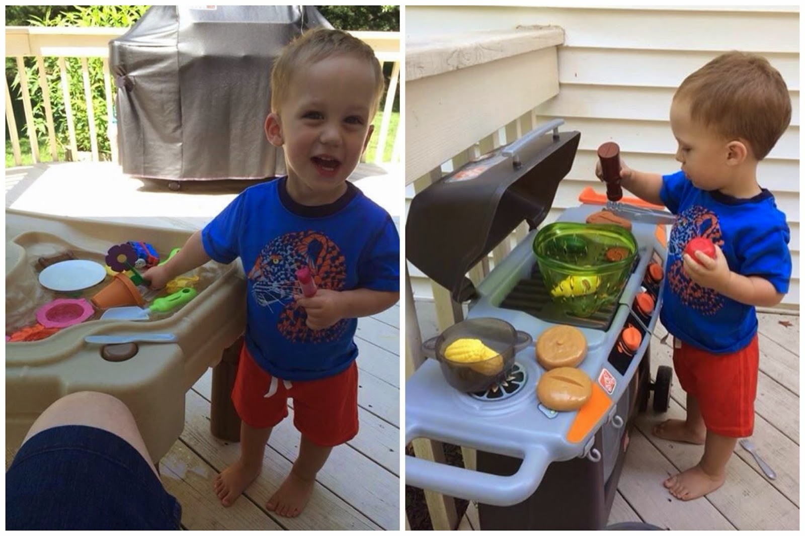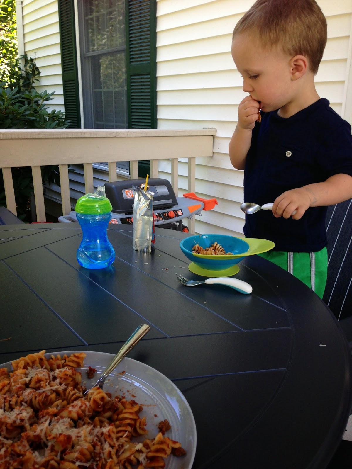 11:26... We drove home and I immediately put our leftover pasta in the microwave.  We ate lunch outside on our deck.  Noah then played with his grill while I caught up on some blogs.  He came over to watch some videos with me and then got super upset when that was over.  I decided he must be tired and we went up for nap.