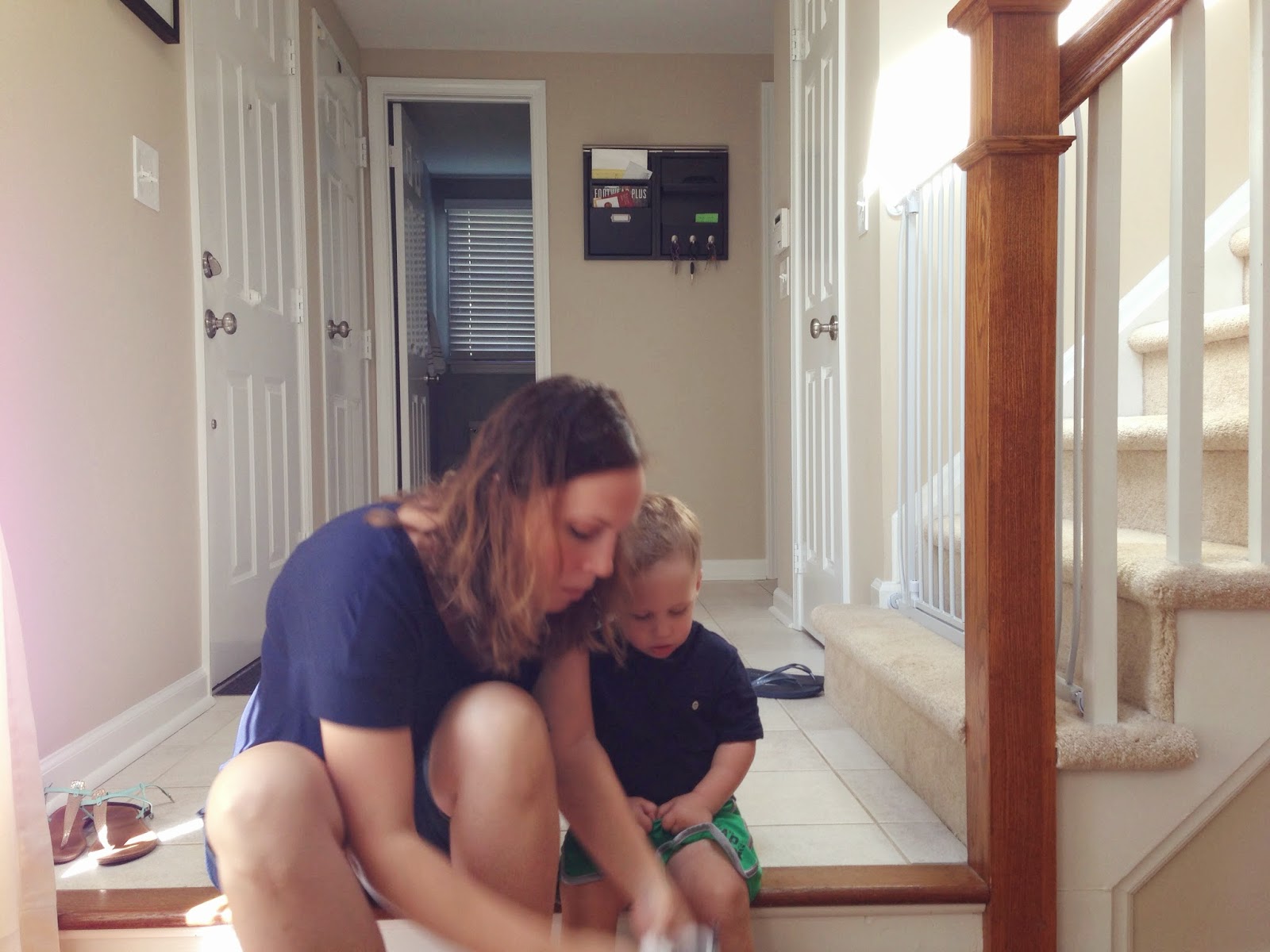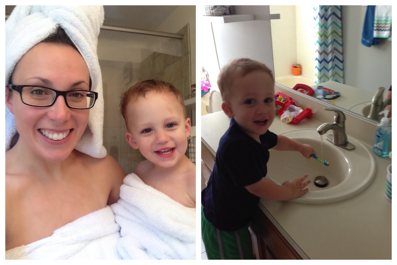9:17… Noah likes to come in the shower with me now.  He used to hate the shower, but now that we have a large one where he doesn't have to be under the water the entire time, he loves to play in it.  I love it because it allows me to take a longer shower.  I then get him dressed, I get dressed, quickly do my makeup and we are headed downstairs.