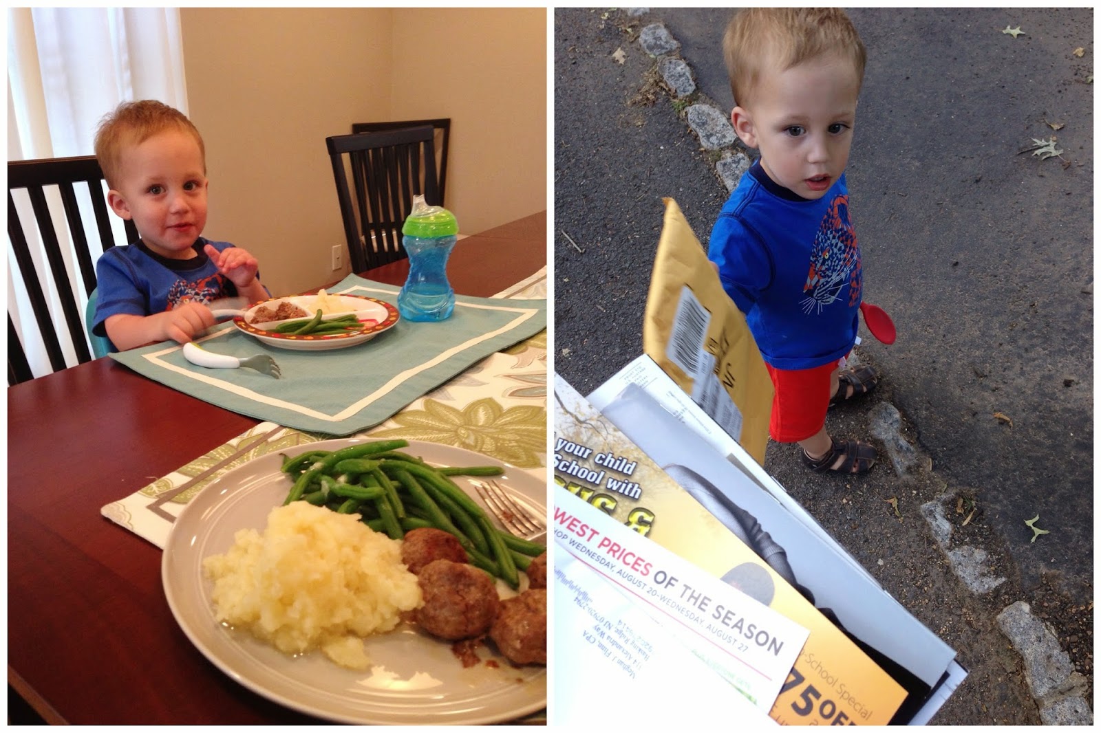 6:06... We sit down for dinner.  Noah eats all his meat, most of his potato, and only 1 or two green beans.  I was surprised, since last time he inhaled the green beans!  After dinner I load the dishwasher (and run it) and clean the pans.