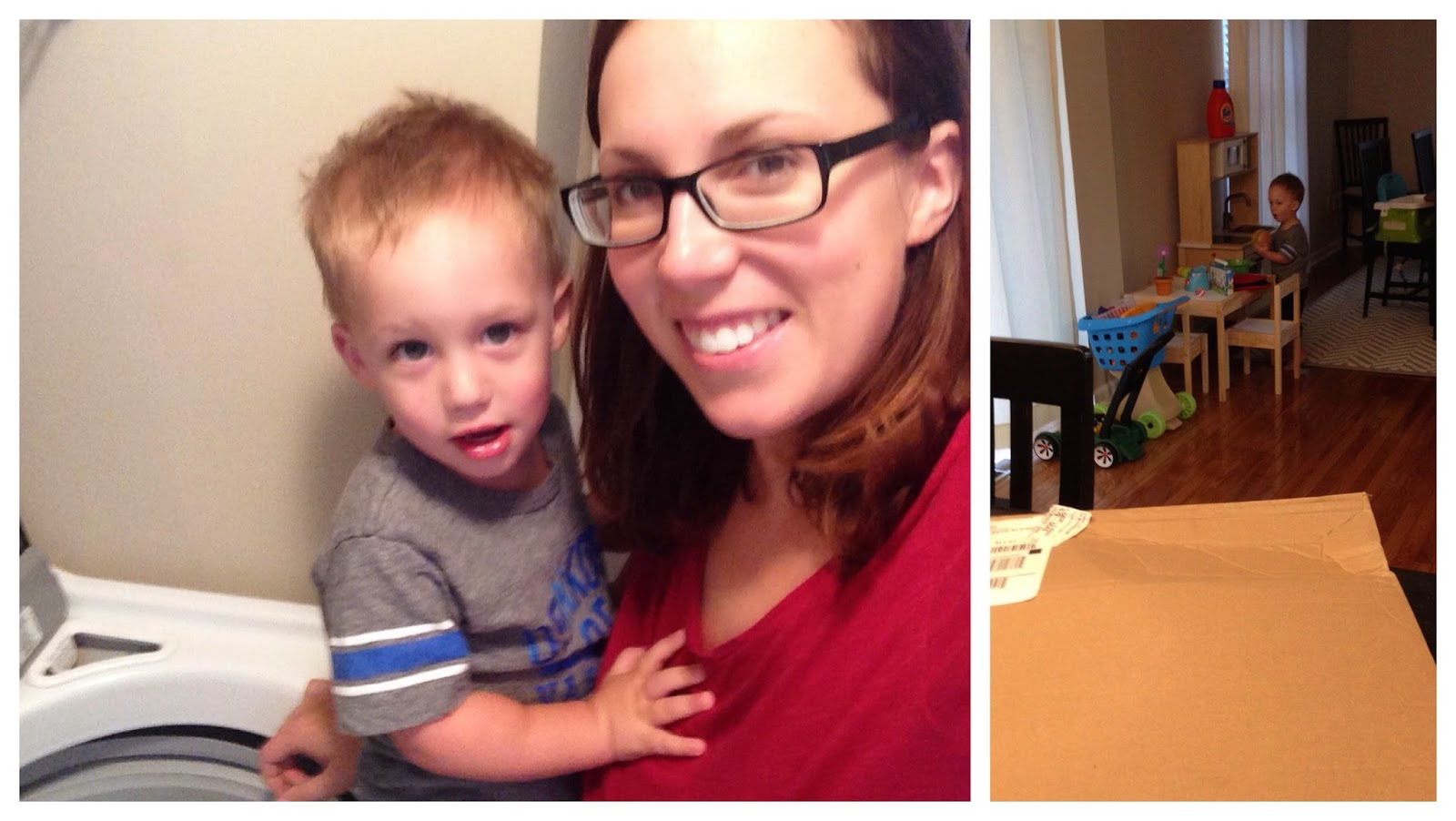 7:59... I bring Noah downstairs and he helps me do his laundry - another favorite activity!  Noah goes to play and I put the bottles in the dishwasher, put the clean pots away, and open my Loft package :)