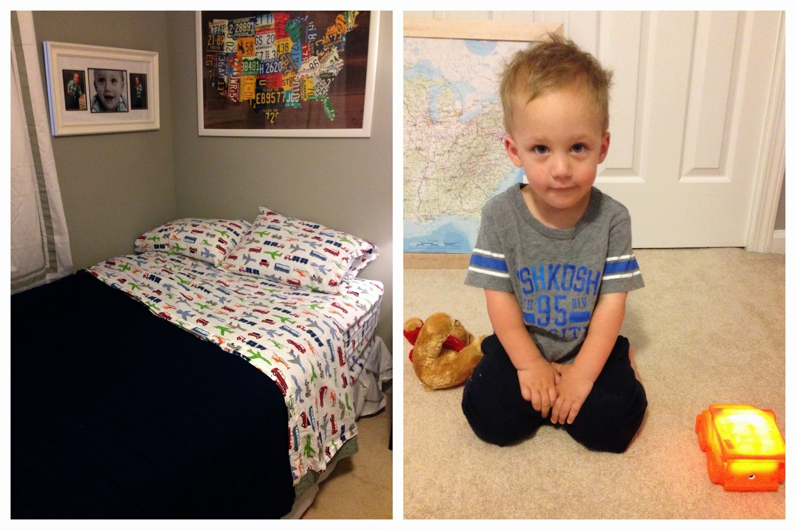 1:45… I see Noah standing up in his crib on the monitor and he's crying.  I go in to rock him and then bring him into his big boy bed in hopes he will sleep a bit longer.