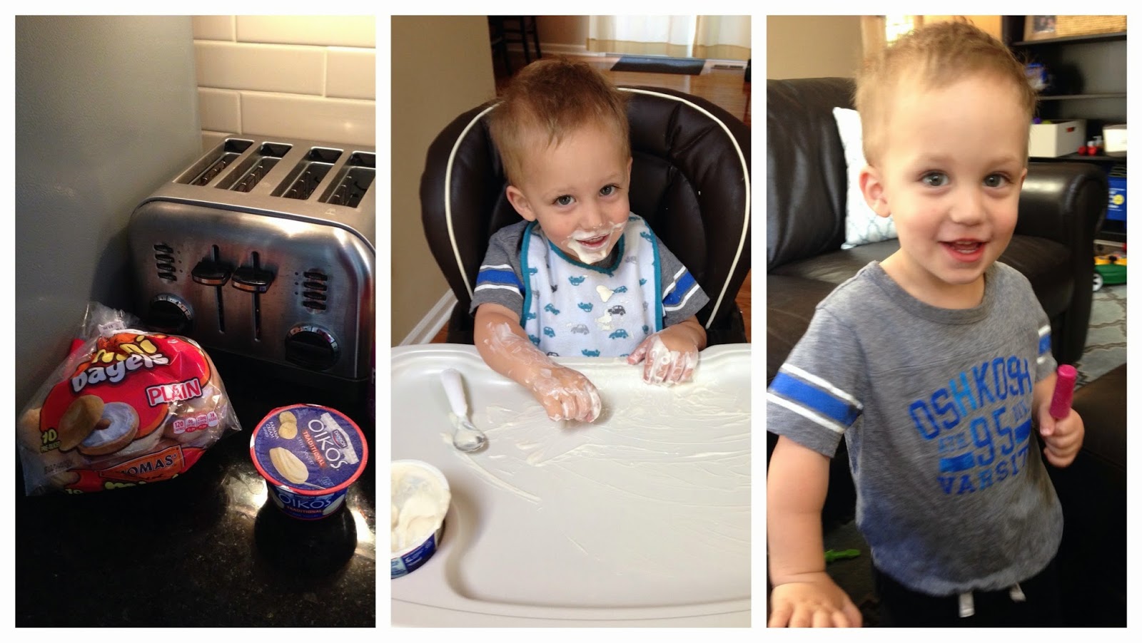 8:12... I get Noah's yogurt and put my mini bagels in the toaster.  We then eat breakfast while I watch The Fosters on the DVR.  Noah gets so dirty eating his yogurt that I sometimes don't even know where to begin with cleaning him up!  He then played while I finished my show.  We were about to go up to shower when he walks into the living room holding a popsicle.  I chose to give in and avoid a mini tantrum.  He quickly ate the popsicle and we went upstairs to get ready.