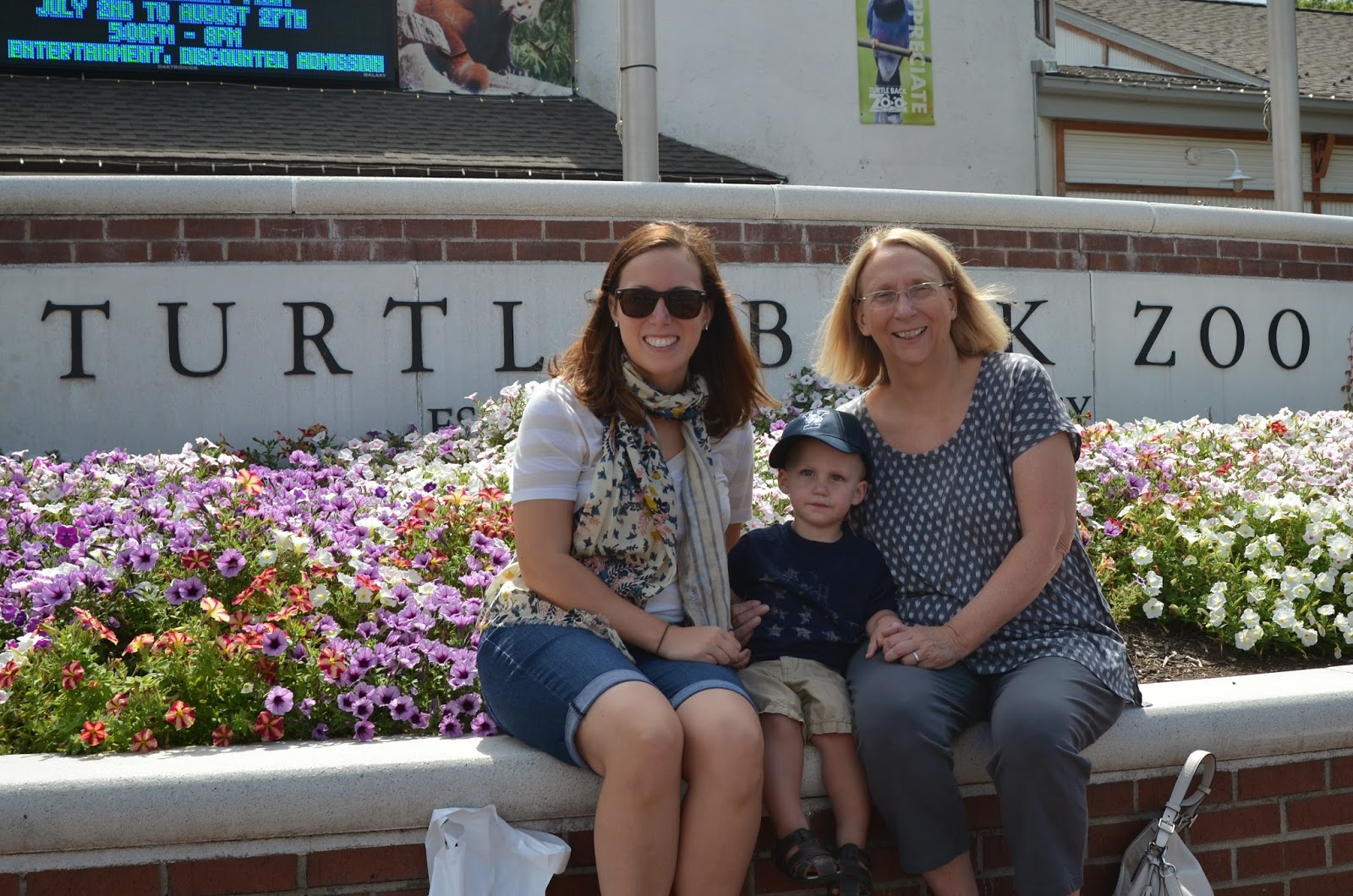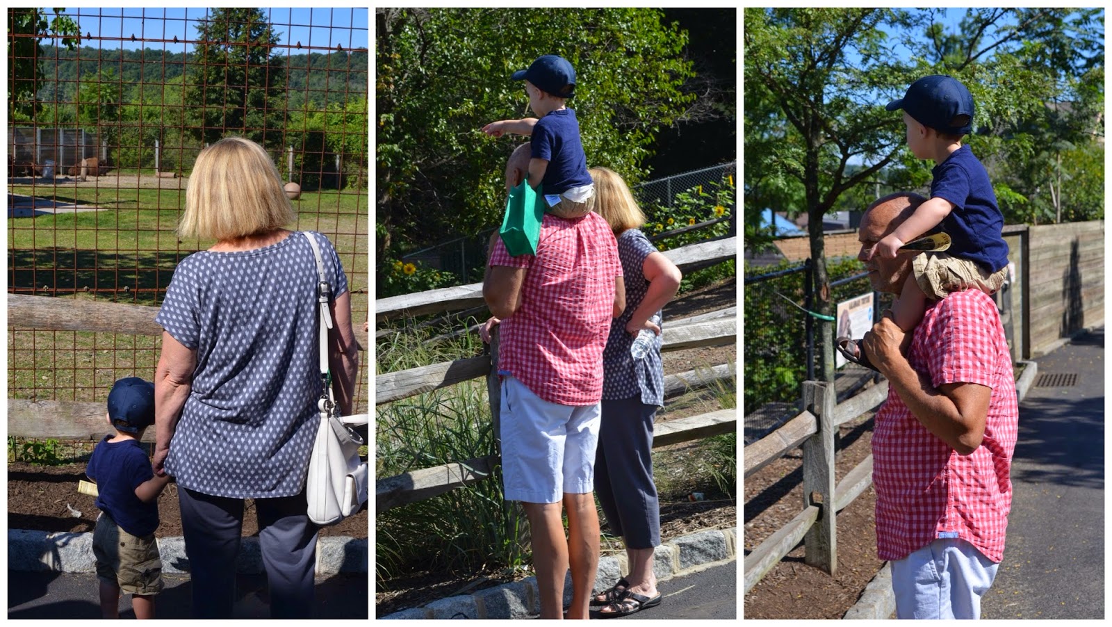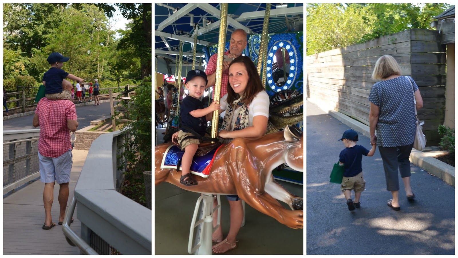 Yesterday, Noah and I spent the morning at the zoo with my parents.  We got a membership a few months back and decided it was time we showed Grandma and Grandpa what it was all about.  The weather was beautiful... mid 70s and low humidity :)  I hate going when it's too hot, so this was perfect.  We got there a few minutes before the zoo opened and immediately went to the train.  The last few times Noah and I have gone, the line for the train was ridiculously long because of field trips.  We never wanted to wait, so the last time we went on the train was last summer!  Today we were one of the first ones on and didn't have to wait in line.  Noah was a little nervous at first, but got into it really quickly.  We then walked around to look at the animals.  This zoo isn't very large, but it's very hilly.  We brought the stroller, but Noah preferred riding Grandpa's shoulders or walking.  We saw some bison, tortoises, penguins, wolves (that looked pretty angry), and emu.  We had fun feeding the birds and one even landed right on the stick and stayed for a while!  I think Noah's favorite was seeing the horses.  It was the only time he actually let out an excited gasp :)  Our last stop was at the carousel.  Noah rode on the mountain lion and my dad came with us too and rode the crocodile (or was it an alligator... how do you tell the difference?).  Noah has been scared in the past, but this time he did really well and wanted to ride a second time.  We finished our trip by going to the gift shop (perks of going with Grandma and Grandpa).  My expectation was for him to pick a stuffed animal (maybe a horse?).  Instead, he immediately went to the trucks... at least it was a "zoo truck"!  He was so sweet and picked out two, one for him and one for grandpa to play with (my dad ended up leaving it for Chris).  My mom didn't want him to leave without some sort of animal, so she also got him a stuffed fish and a toy turtle to play with in the bath ;)  We had a great morning and had some good naps when we got home!