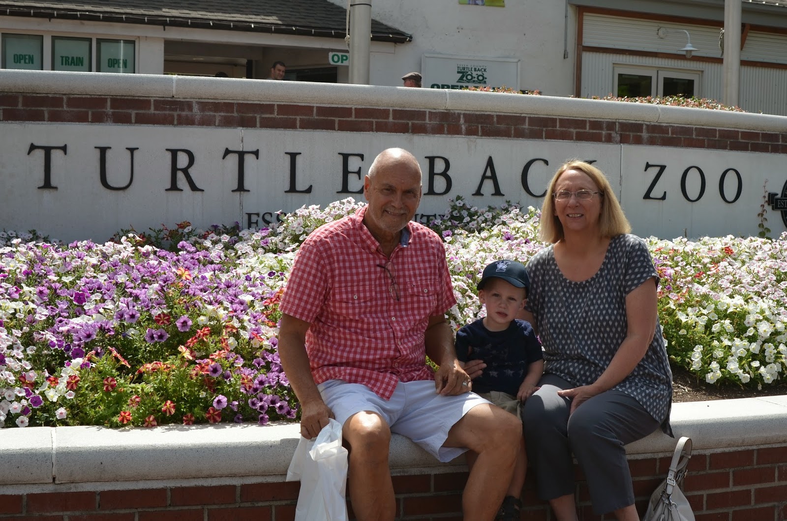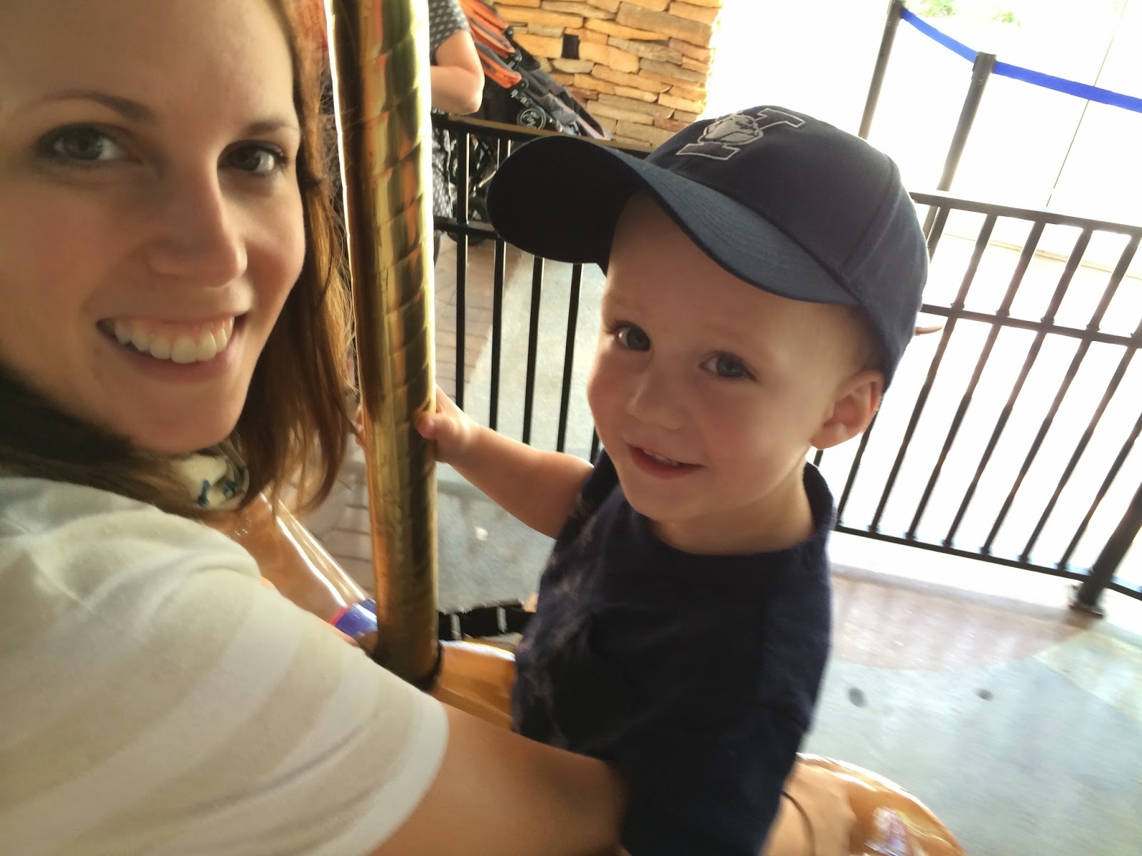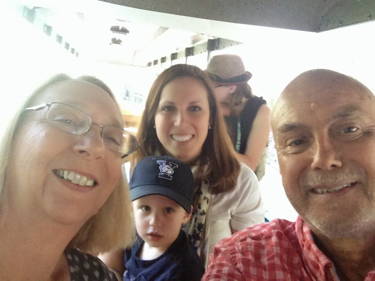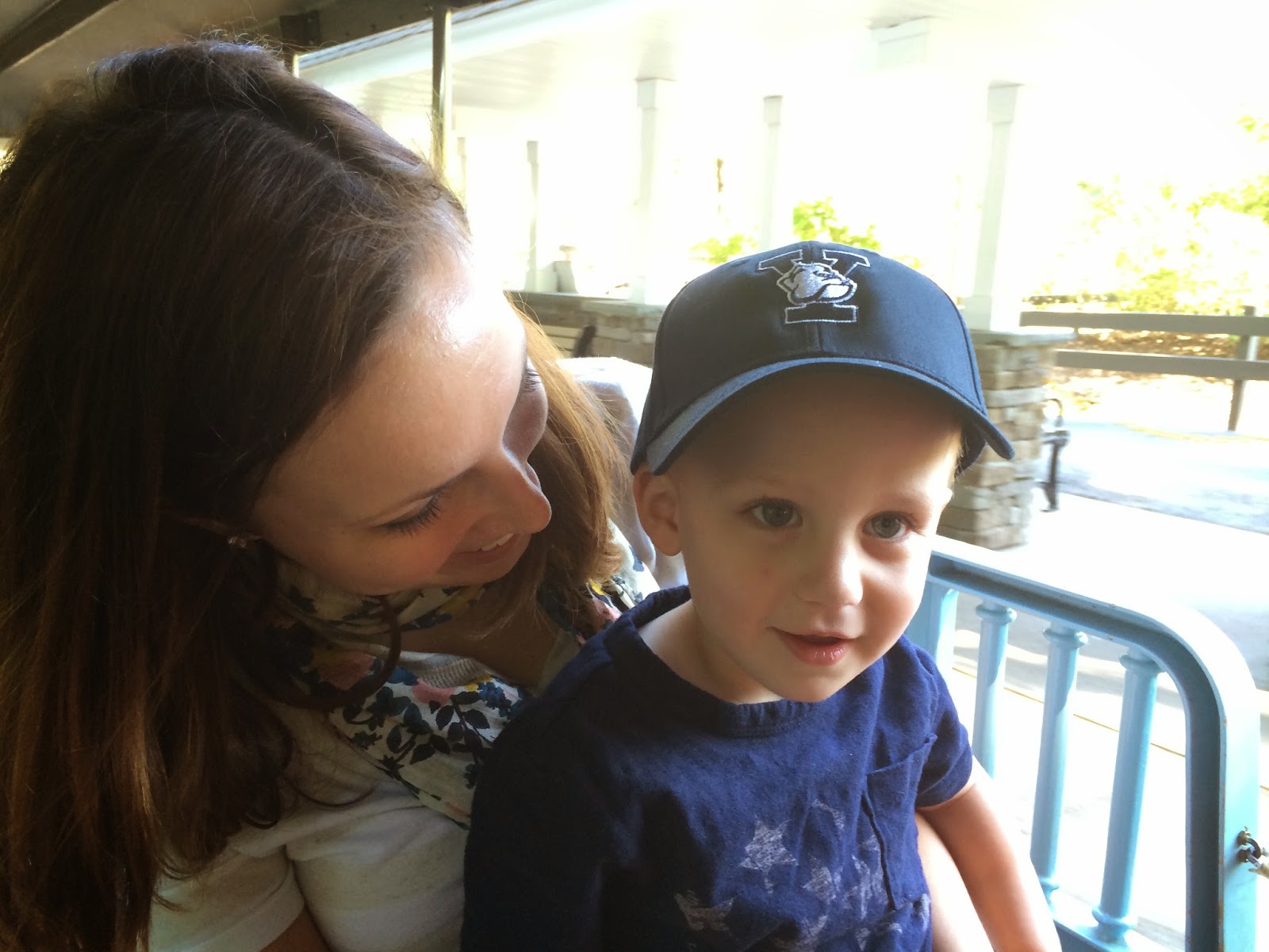 Yesterday, Noah and I spent the morning at the zoo with my parents.  We got a membership a few months back and decided it was time we showed Grandma and Grandpa what it was all about.  The weather was beautiful... mid 70s and low humidity :)  I hate going when it's too hot, so this was perfect.  We got there a few minutes before the zoo opened and immediately went to the train.  The last few times Noah and I have gone, the line for the train was ridiculously long because of field trips.  We never wanted to wait, so the last time we went on the train was last summer!  Today we were one of the first ones on and didn't have to wait in line.  Noah was a little nervous at first, but got into it really quickly.  We then walked around to look at the animals.  This zoo isn't very large, but it's very hilly.  We brought the stroller, but Noah preferred riding Grandpa's shoulders or walking.  We saw some bison, tortoises, penguins, wolves (that looked pretty angry), and emu.  We had fun feeding the birds and one even landed right on the stick and stayed for a while!  I think Noah's favorite was seeing the horses.  It was the only time he actually let out an excited gasp :)  Our last stop was at the carousel.  Noah rode on the mountain lion and my dad came with us too and rode the crocodile (or was it an alligator... how do you tell the difference?).  Noah has been scared in the past, but this time he did really well and wanted to ride a second time.  We finished our trip by going to the gift shop (perks of going with Grandma and Grandpa).  My expectation was for him to pick a stuffed animal (maybe a horse?).  Instead, he immediately went to the trucks... at least it was a "zoo truck"!  He was so sweet and picked out two, one for him and one for grandpa to play with (my dad ended up leaving it for Chris).  My mom didn't want him to leave without some sort of animal, so she also got him a stuffed fish and a toy turtle to play with in the bath ;)  We had a great morning and had some good naps when we got home!