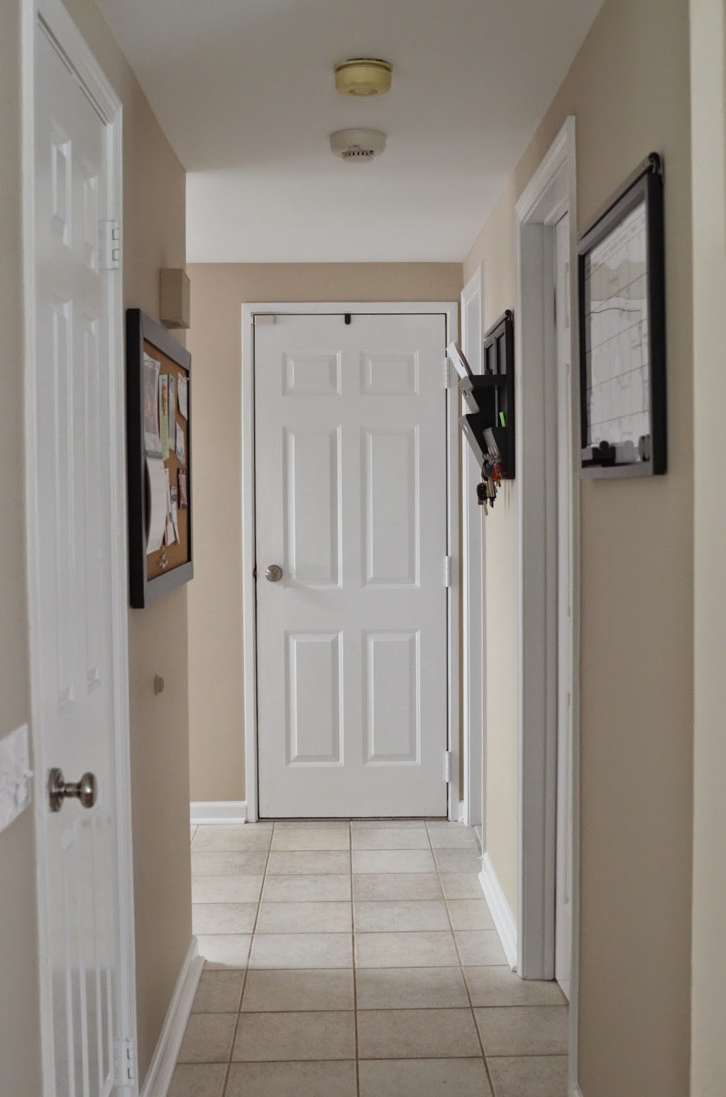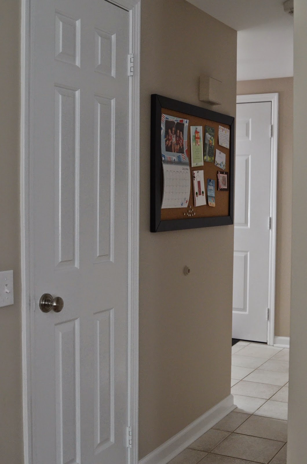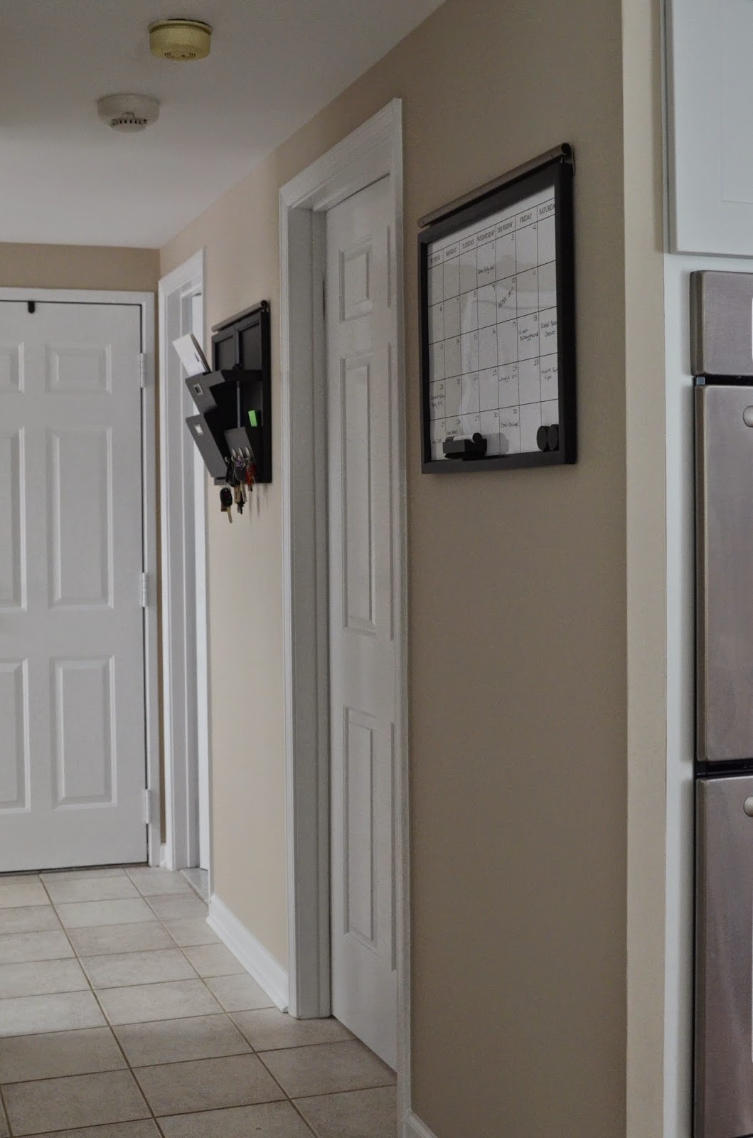 Our new house has a circular layout on the main floor. When you enter the front door, if you turn right you enter the living room. Walk through there and it's the dining room and the kitchen. Off the kitchen there is a hallway that will lead you back to the front door. In this hallway there are many doors... the kitchen closet (or a second pantry), the laundry room, powder room, and garage. Since this is a hallway that we use a lot, but is not necessarily used much by guests, I decided to use it as a command center to get more organized.