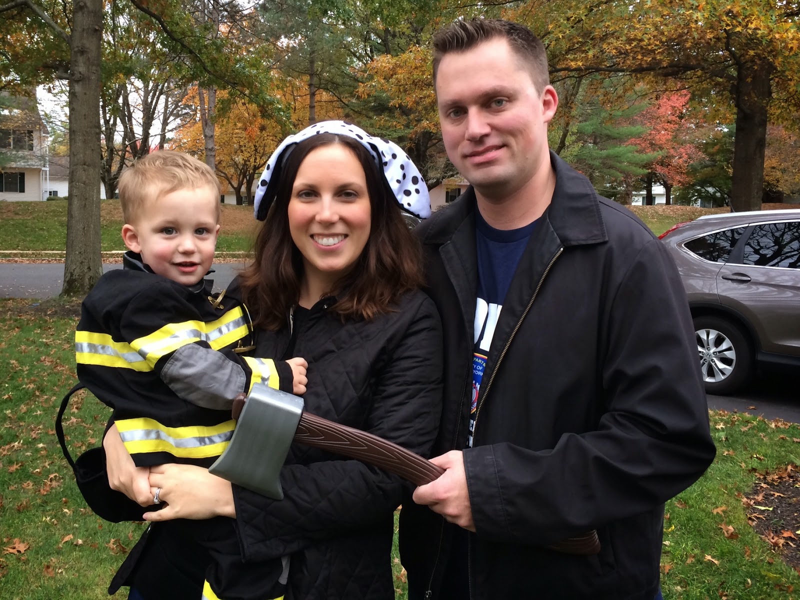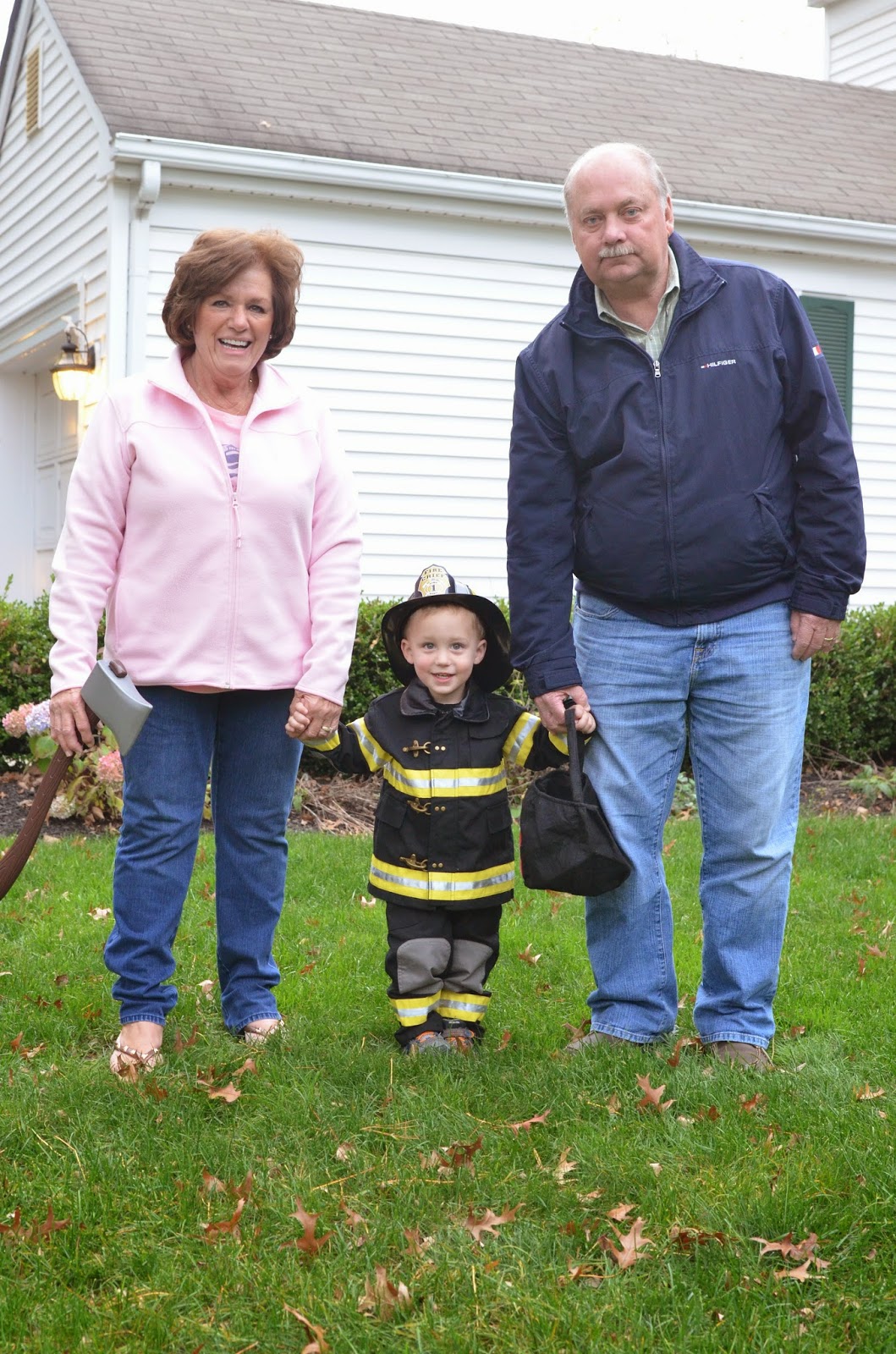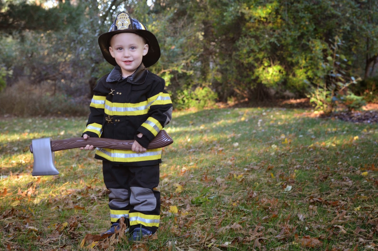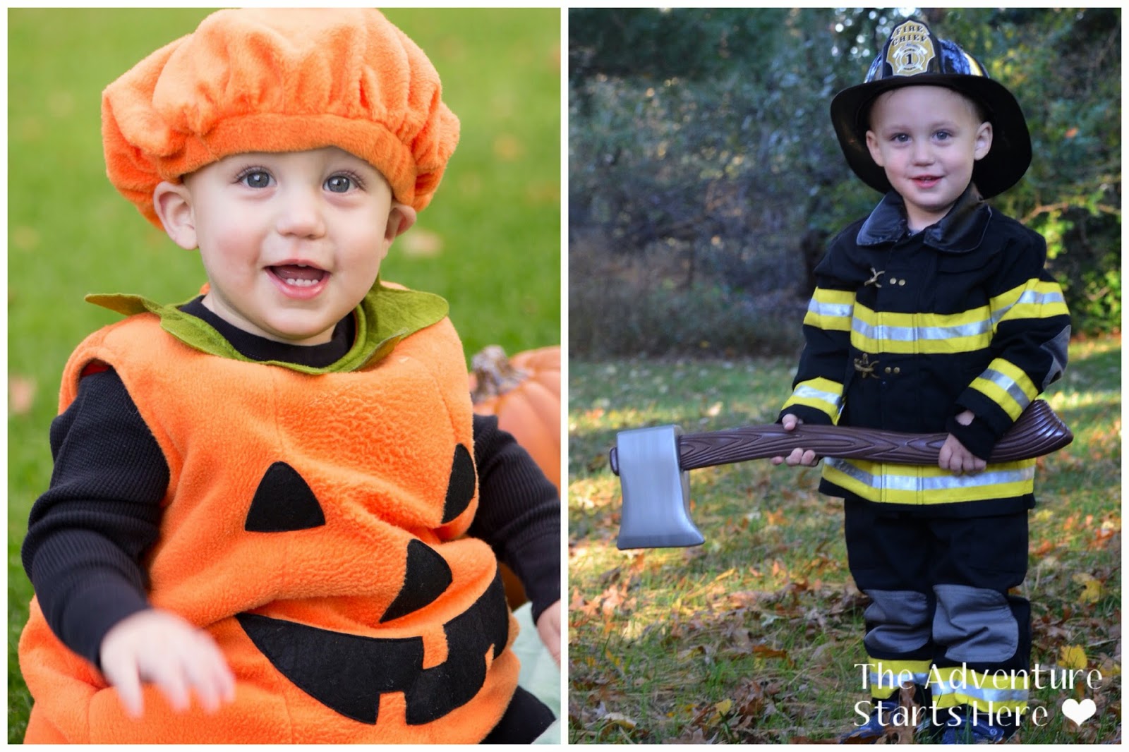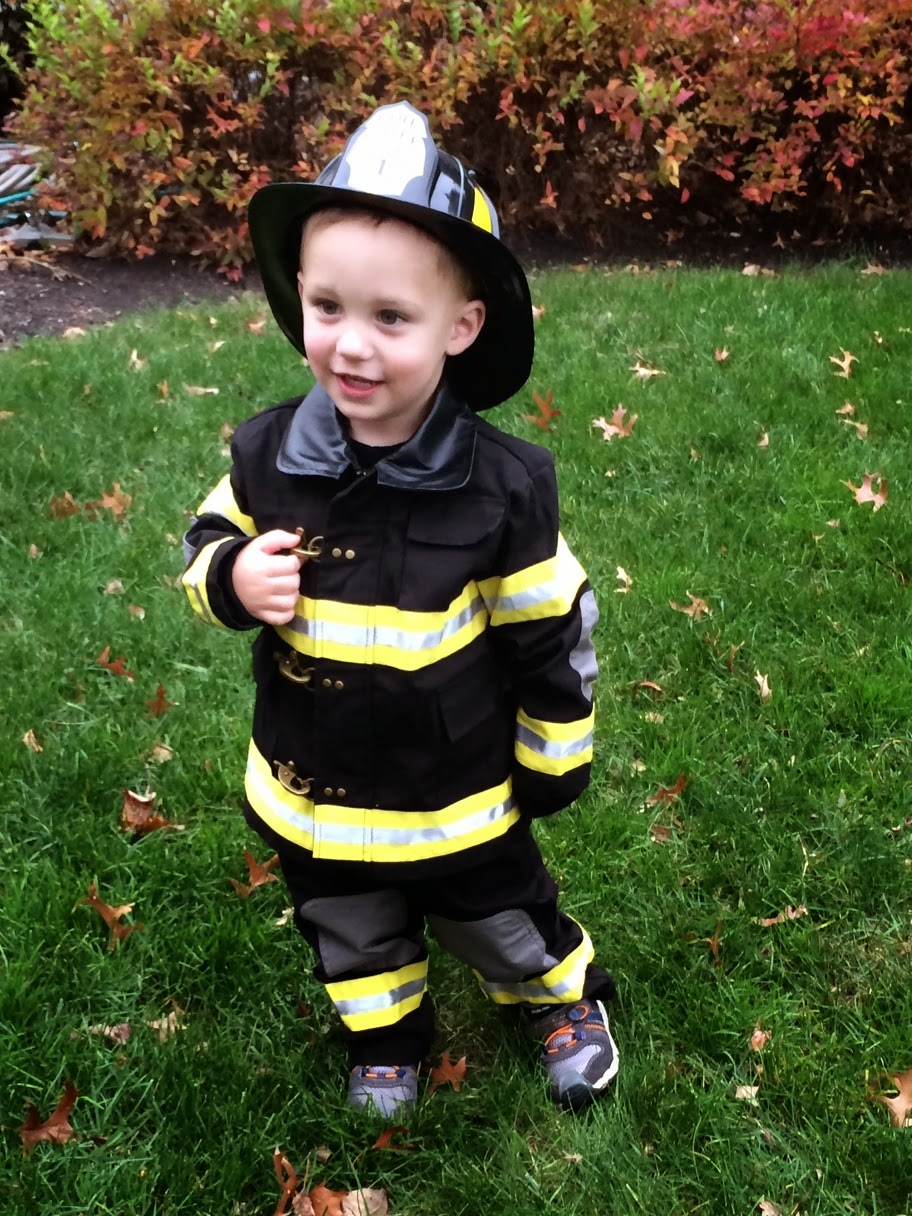 Who doesn't love a comparison shot... here's Noah last year dressed up as a pumpkin and this year dressed up as a firefighter! Last year he wasn't walking, let alone standing, and this year he's running around with an axe ;)