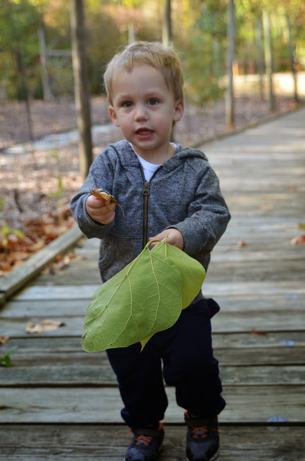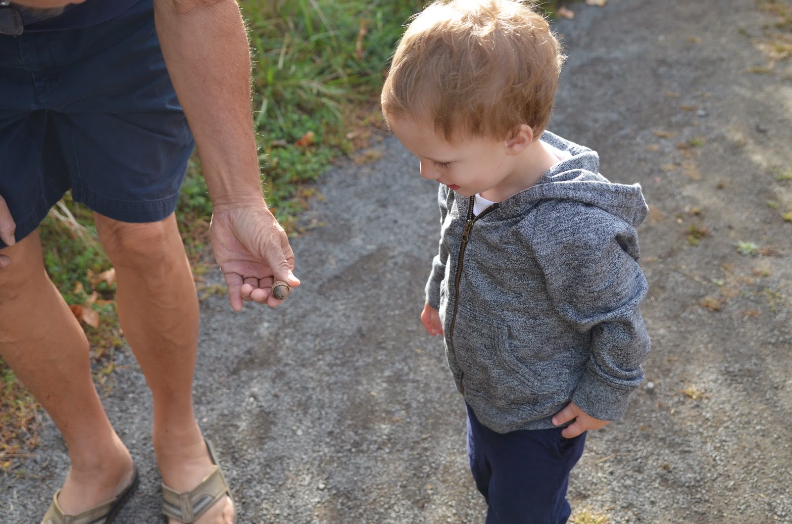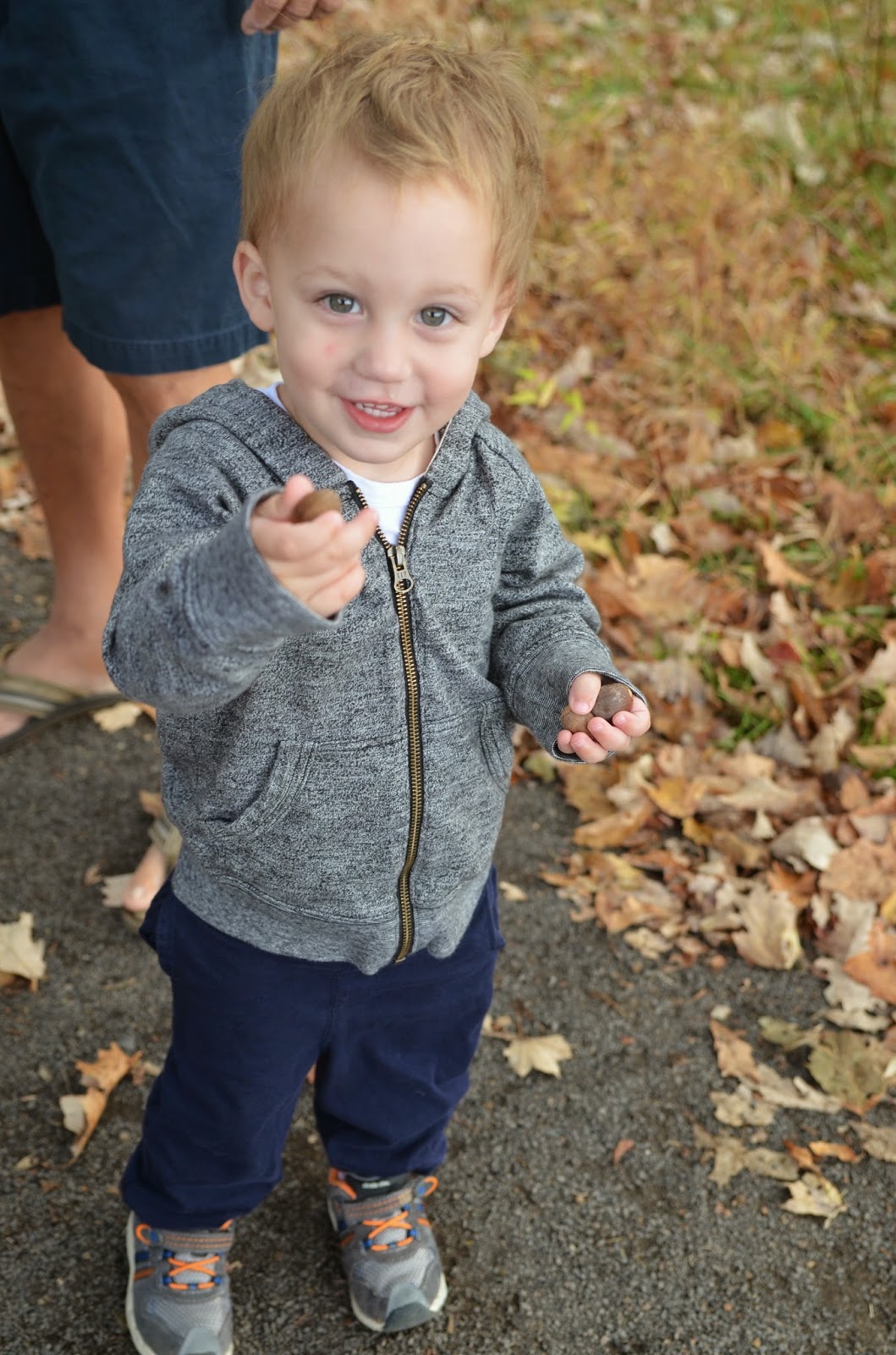 Last week, Noah and I went on a nature walk with my parents.  It was my dad's birthday and we were looking for an activity to do together.  It was a nice fall day, so we decided to go to a nearby park and explore.  Noah walked almost the whole thing and only went on my dad's shoulders for a few minutes!  He had so much fun collecting acorns, sticks, and leaves.  At first he didn't want to touch the leaves, but by the end he was picking them all up!