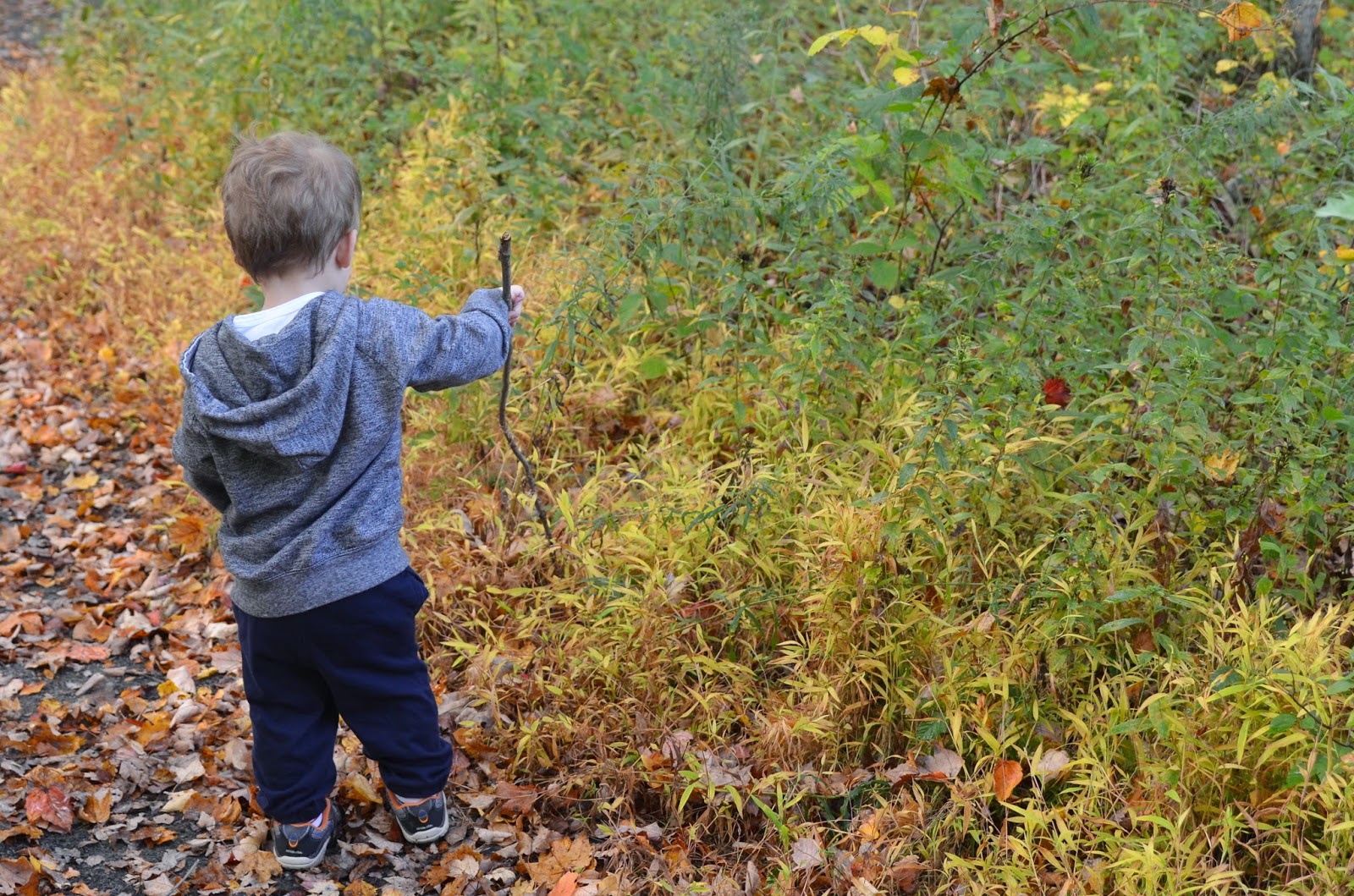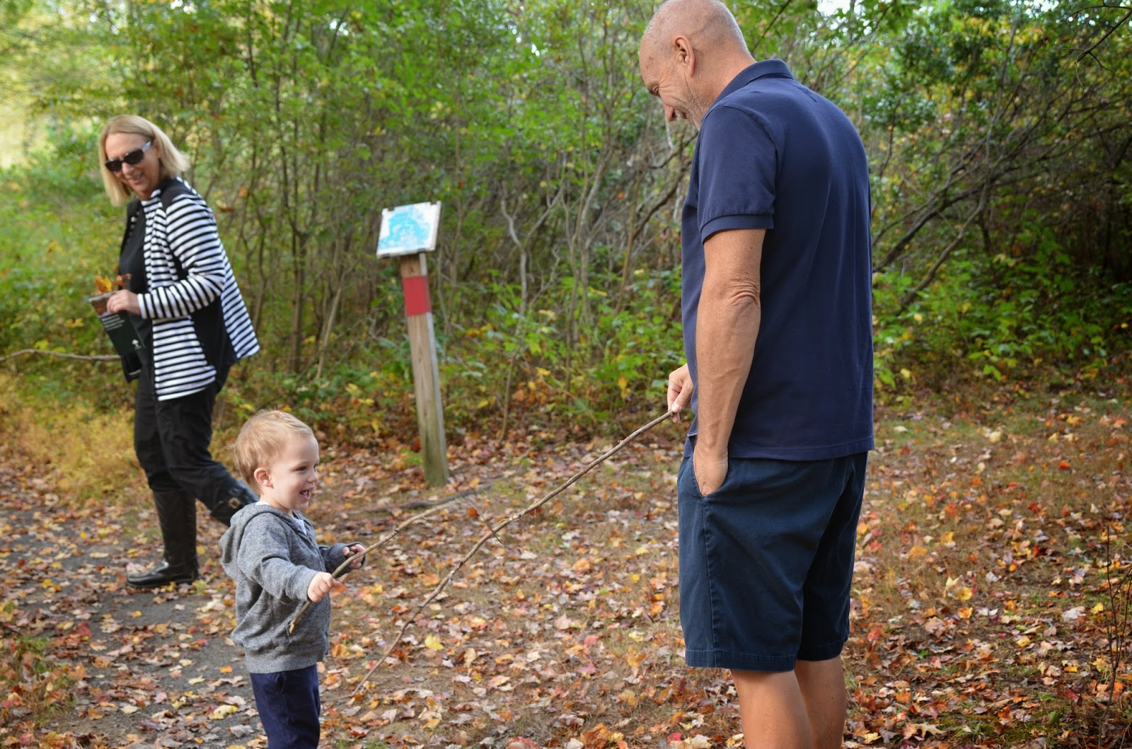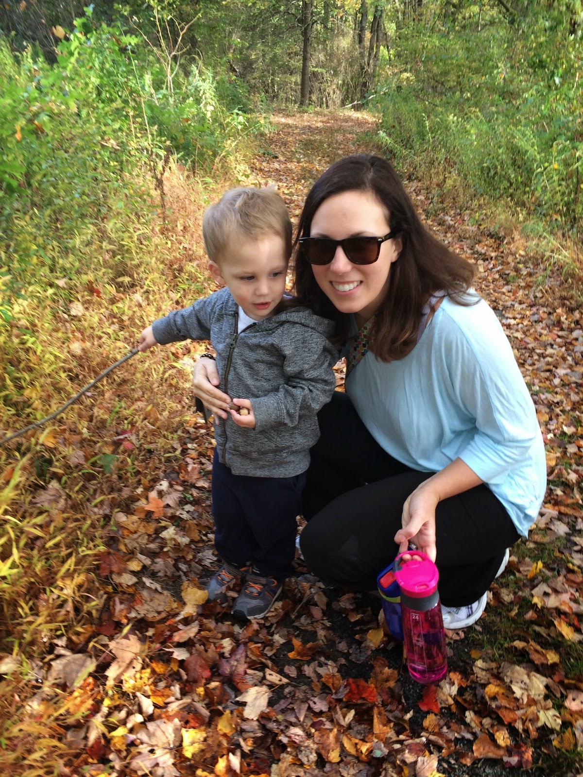 Last week, Noah and I went on a nature walk with my parents.  It was my dad's birthday and we were looking for an activity to do together.  It was a nice fall day, so we decided to go to a nearby park and explore.  Noah walked almost the whole thing and only went on my dad's shoulders for a few minutes!  He had so much fun collecting acorns, sticks, and leaves.  At first he didn't want to touch the leaves, but by the end he was picking them all up!