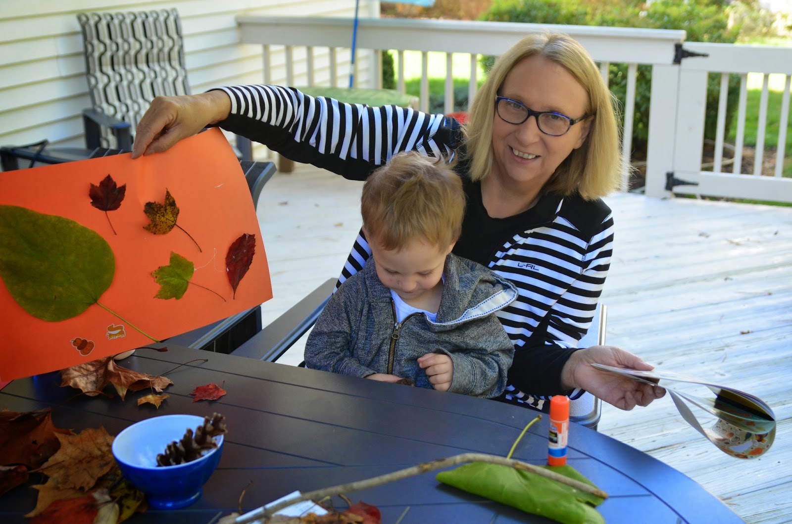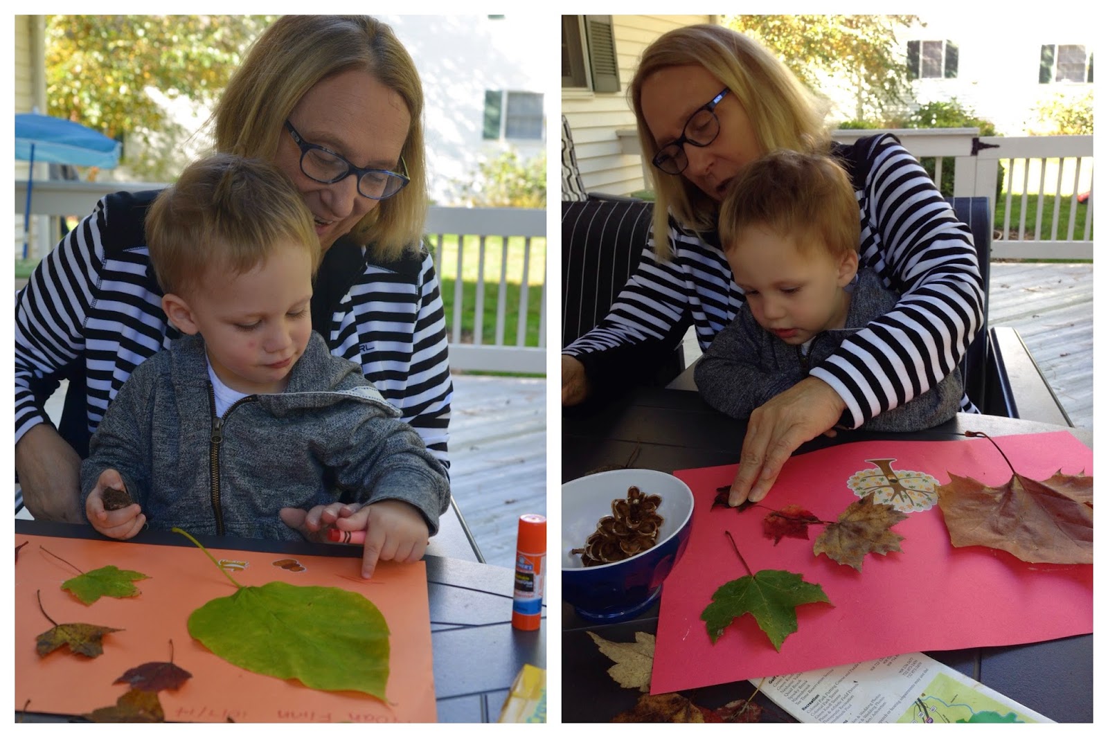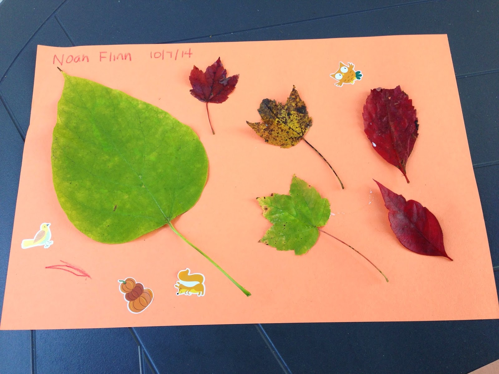 My mom had the idea to do an art project with the leaves Noah collected.  We got some fall colored construction paper, glue and some fall stickers, and they got to work!  I love how last minute ideas can be the most fun!