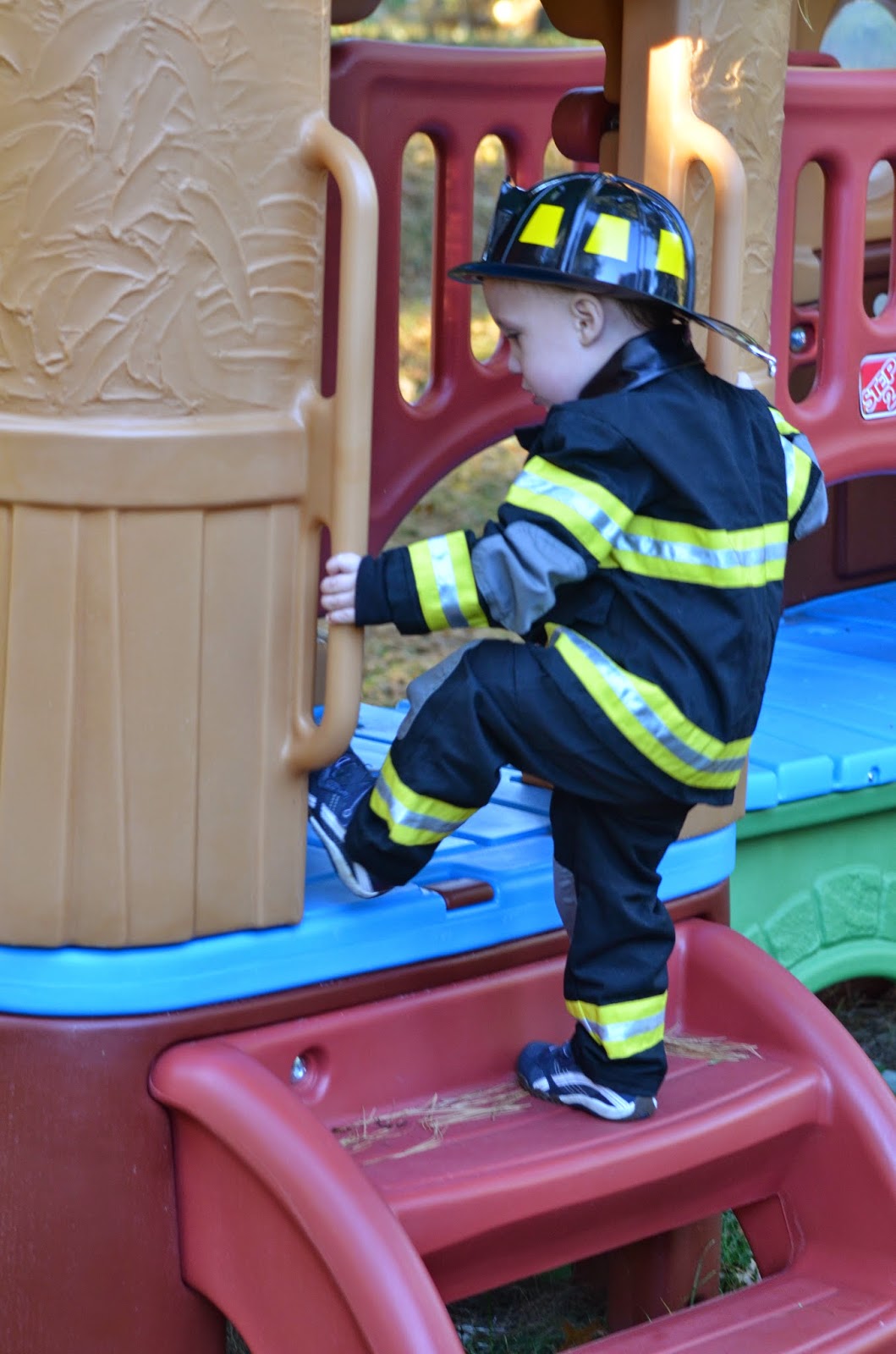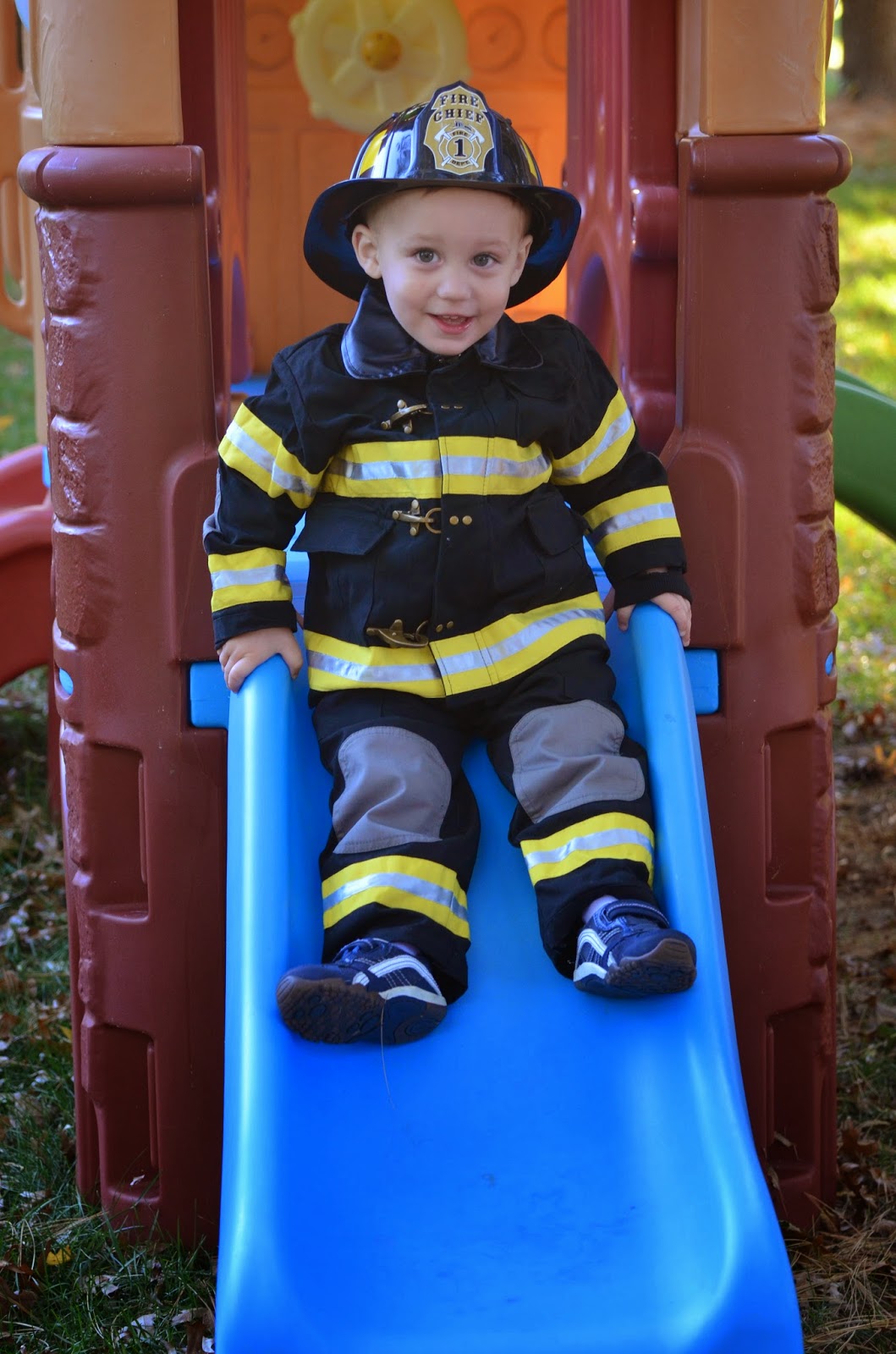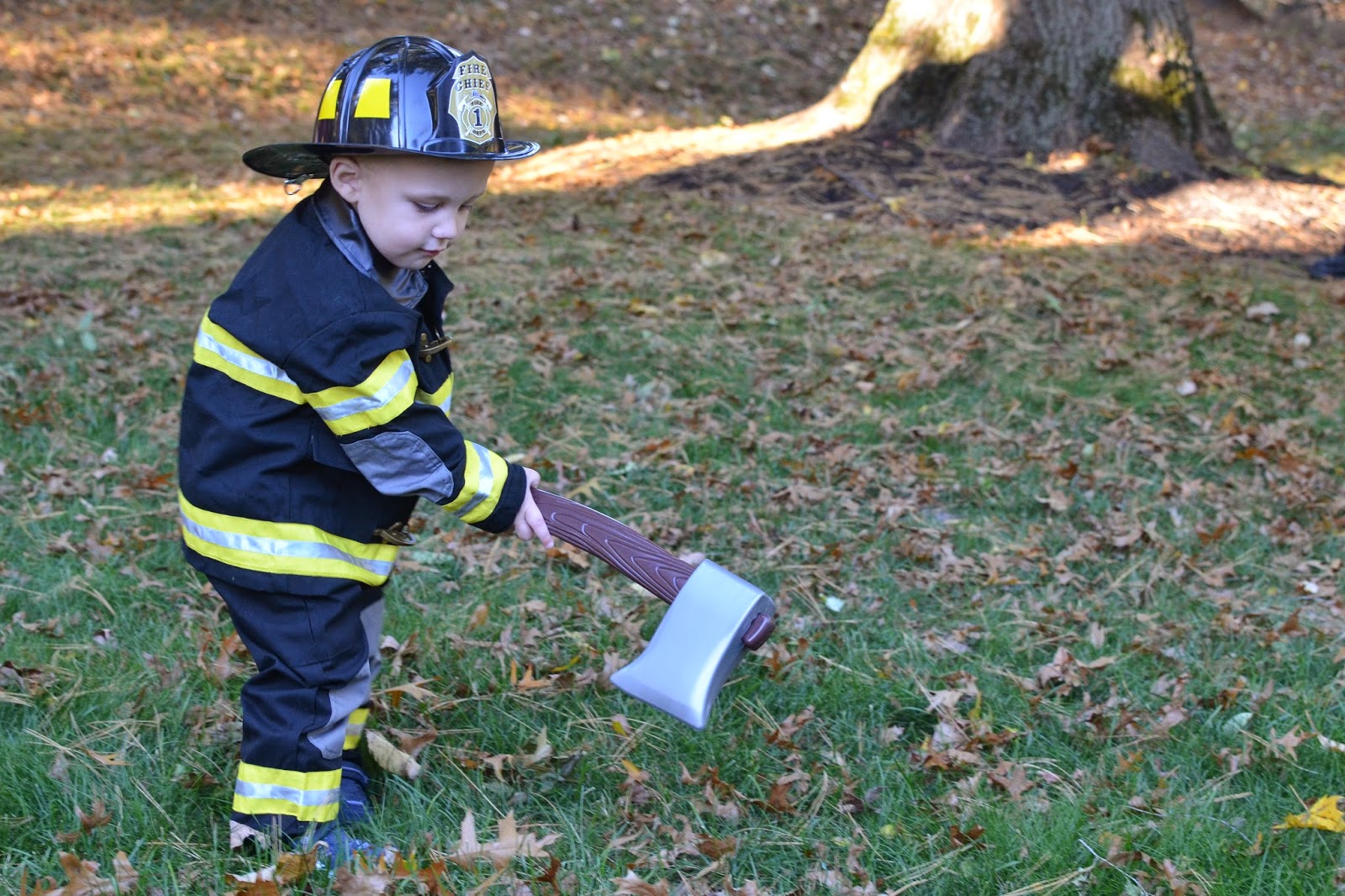 Noah is dressing up as a firefighter this year.  I have a feeling this is the last year I will get away with choosing his costume for him ;)   Last year Noah was the cutest pumpkin!  We have a few Halloween events to go to next week in addition to trick or treating.  This will be the first year we go door to door and I expect we will only go to a few.  We decided to do a practice run over the weekend and Noah seems to really like the costume.  It's warm and feels almost like a normal outfit, so it's easy to move around in.  He also likes playing with the rubber axe :). We are now super excited for Halloween!