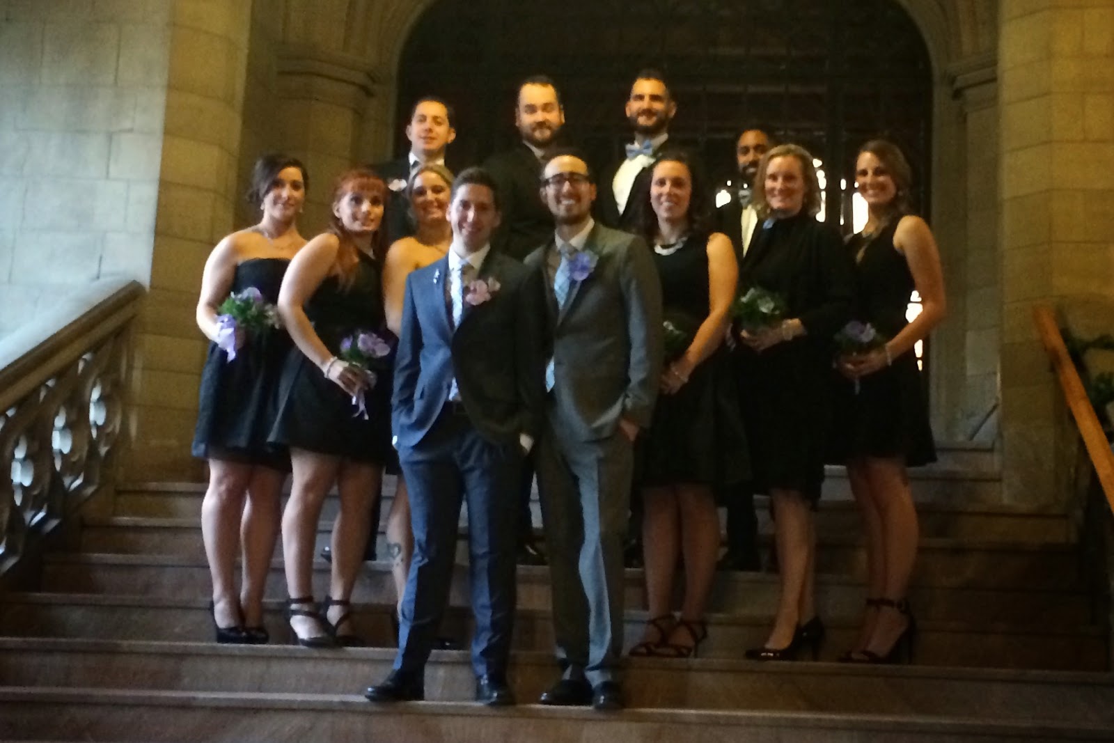 We had a plan for the rest of day, but it didn't really go the way we had hoped. The girls (my mom, sister, a friend of Luke's, and me) went to get our hair done at a local Blow Out Bar. While we were gone, Chris and Noah went to the CN Tower with my dad and brother, David. They then picked us up at the salon and we went to get lunch. Since we grew up in Canada, we have some favorite restaurants that we HAVE to go to every visit. One of those is Swiss Chalet. We found one nearby, but it was just an "express" without seating. We asked where the next closest one was, and they sent us kind of out of the way to a mall! We ended up getting our yummy chicken lunch, but finished a lot later than we expected. We got back to the hotel at 1:30 and needed to be at pictures at 2! We originally had planned to do pictures with the whole family from 2-3 and bring Noah home for a nap. Instead, Noah fell asleep on the way home from lunch, so Chris stayed with him in the hotel while he slept. The rest of us got read SUPER FAST and headed over to the University of Toronto campus (where Luke & Tyler met) for some pictures. Since the wedding was going to be late at night (and I had a few responsibilities as Best Person), I was hoping Noah would have a long nap. Nope... he slept for 70 minutes tops! He often does this at home, but those days he just goes to bed earlier!